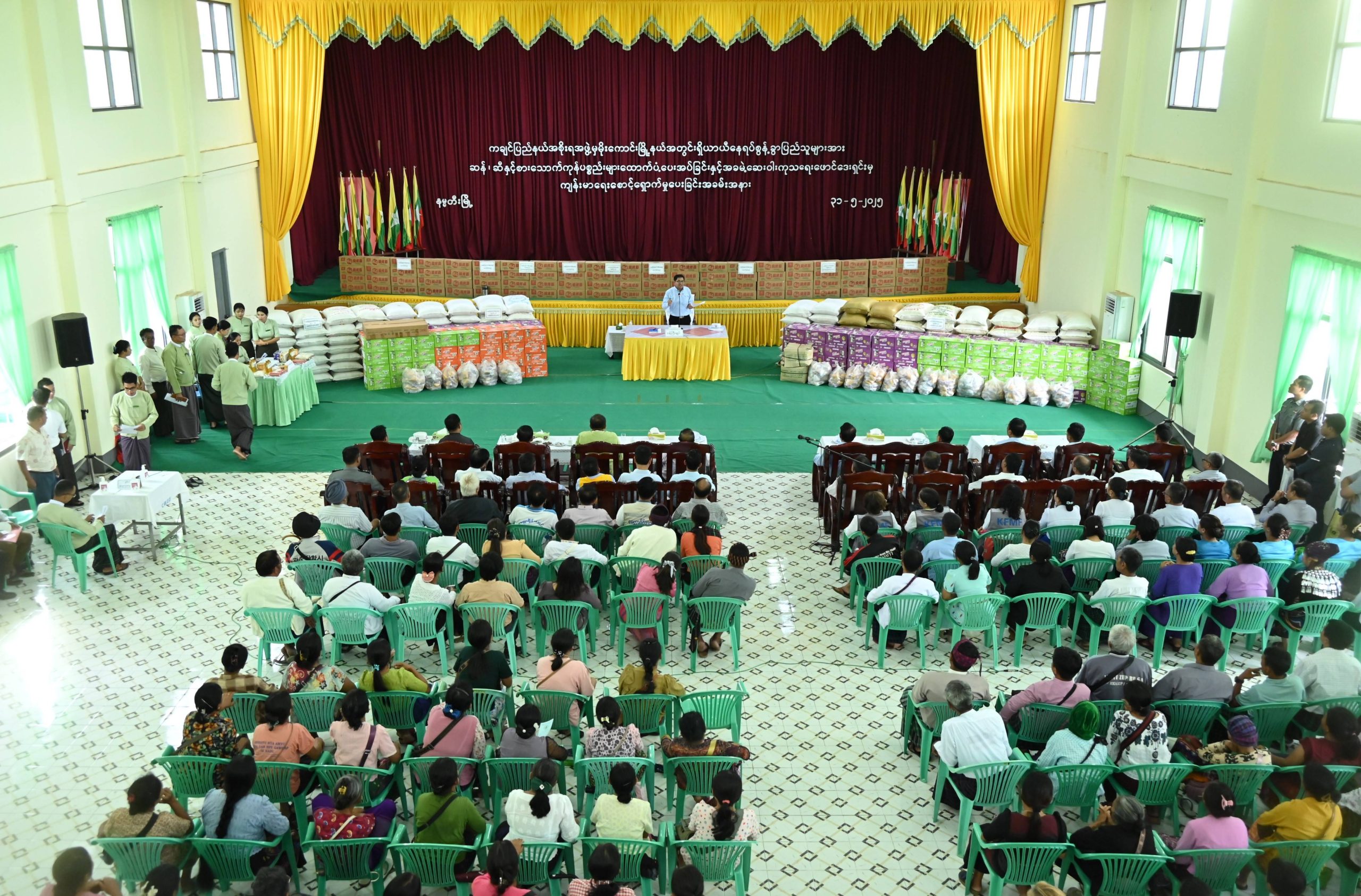 ကချင်ပြည်နယ်၊ မိုးညှင်းခရိုင်အတွင်း အကြမ်းဖက်မှုဖြစ်စဉ်များကြောင့် နေရပ်ကျေးရွာများကို စွန့်ခွာ၍ မိုးကောင်းမြို့နယ်၊ နမ္မတီးမြို့သို့ ယာယီတိမ်းရှောင် ခိုလှုံနေထိုင်လျက်ရှိသော ပြည်သူများအား ကချင်ပြည်နယ်အစိုးရအဖွဲ့က ဆန်၊ ဆီနှင့် စားသောက်ကုန်များ ထောက်ပံ့ပေးအပ်ခြင်းနှင့် ပြည်နယ်အခမဲ့ဆေးဝါးကုသရေးဖောင်ဒေးရှင်းမှ ကျန်းမာရေးစောင့်ရှောက်မှုပေးခြင်းအခမ်းအနားကို ယနေ့ နံနက် ၁၀ နာရီက နမ္မတီးမြို့ မြို့တော်ခန်းမ၌ ကျင်းပပြုလုပ်ရာ ပြည်နယ်ဝန်ကြီးချုပ် ဦးခက်ထိန်နန်နှင့် တာဝန်ရှိသူများ တက်ရောက်ကြသည်။