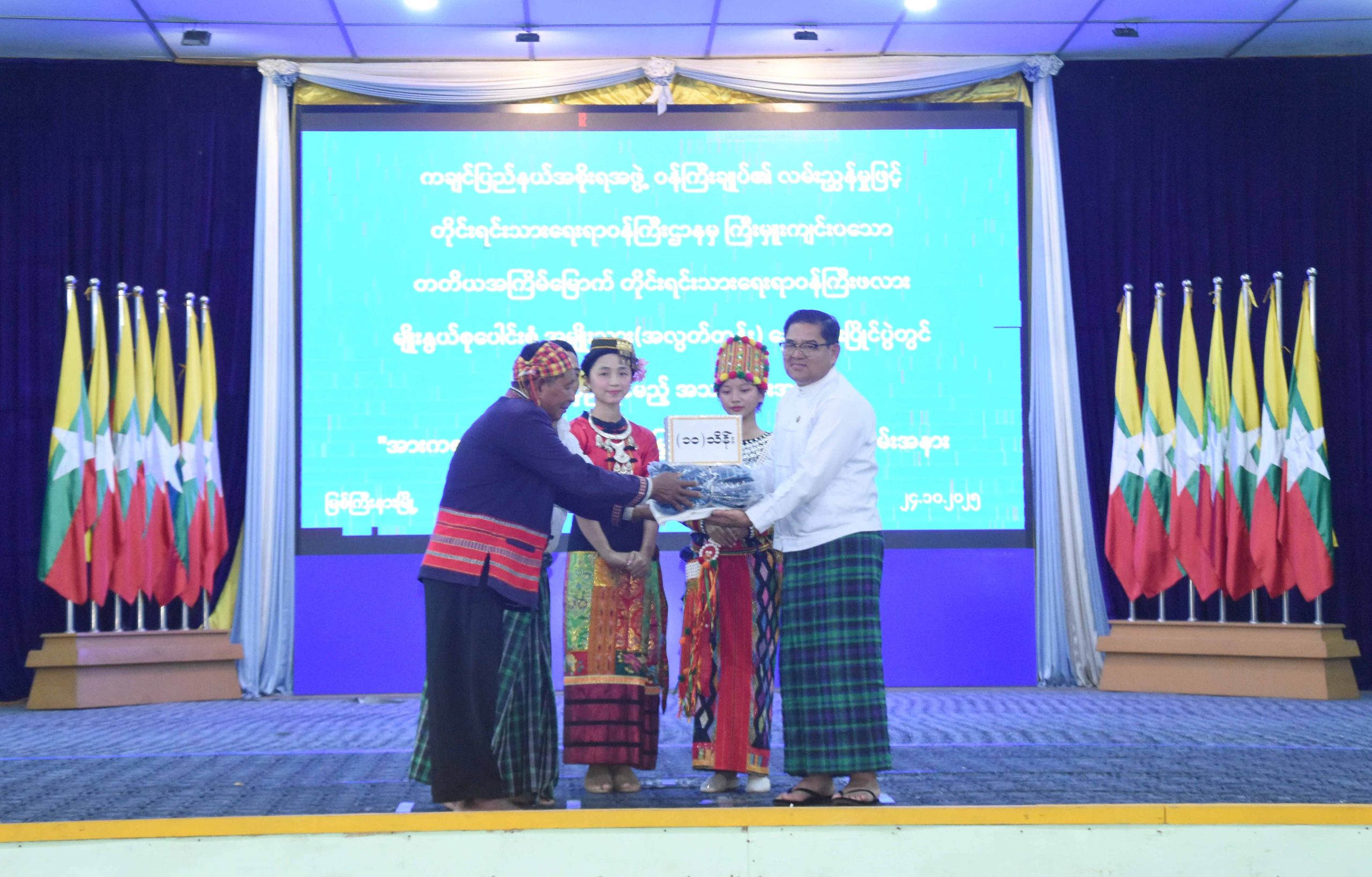 ထို့နောက် ပြည်နယ်အထွေထွေအုပ်ချုပ်ရေးဦးစီးဌာနမှ တိုင်းရင်းသား/ တိုင်းရင်းသူလေးများ ကကချင်တိုင်းရင်းသားတို့၏ ရိုးရာကောက်သစ်စားပွဲတော် တေးသီချင်းအကအလှများဖြင့် ကပြဖျော် ဖြေတင်ဆက်မှုကို တက်ရောက်လာကြသူများက ကြည့်ရှုအားပေးခဲ့ကြပြီး တစ်နှစ်တာအတွင်း ပထမဆုံးထွက်ရှိသည့် စပါးကို ကြိတ်ခွဲကာ ဦးစွာရရှိသည့် ဆန်/ ကောက်သစ်ကို နေ့လည်စာ