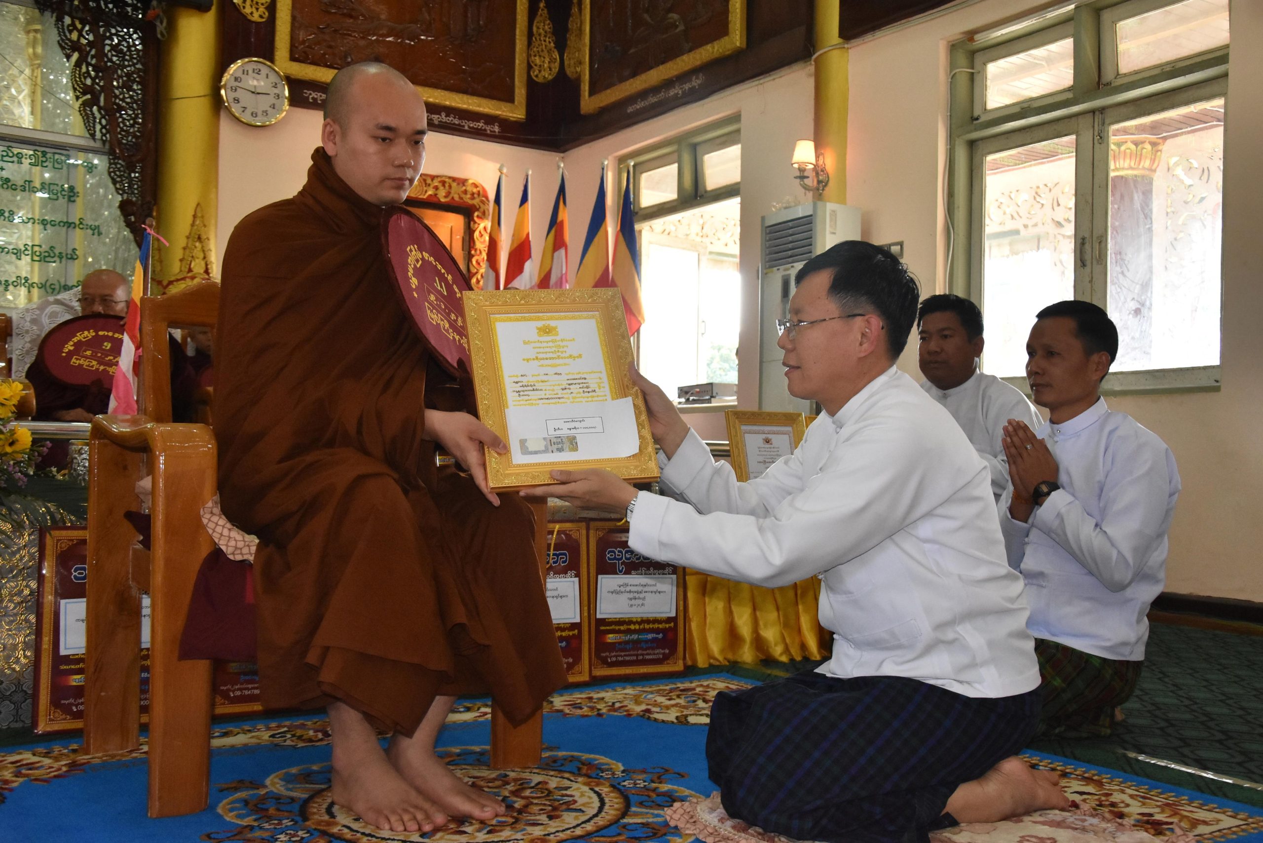 ဆက်လက်၍ ပြည်နယ်ဝန်ကြီးက စာချတန်း (သာသနဓဇဓမ္မာစရိယဘွဲ့ရ)၊ နိကာယ် (နိကာ ယဝိဒူဘွဲ့ရ)၊ ပထမကြီးတန်း၊ ပထမလတ်တန်း၊ ပထမလတ်တန်း၊ ပထမငယ်တန်းတို့တွင် စာအောင်ဆုရ သံဃာတော်များ၊ ပြည်နယ်တရားလွှတ်တော်တရားသူကြီးချုပ်က အခြေပြုမူလတန်း၊ အဘိဓမ္မာ၊ ဝိသုဒ္ဓိမဂ်(အထူးအောင်) သီလရှင်ဆရာများနှင့် လူပုဂ္ဂိုလ် စုစုပေါင်း ၉၆ ဦးတို့အား စာအောင်ဆုများနှင့် နဝက္မဝတ္ထုငွေများကို အသီးသီးဆက်ကပ်လှူဒါန်းခဲ့ကြပြီး ဆရာတော်ထံမှ သမ္မောဒနိယ သြဝါဒကထာကို နာယူကြားနာခဲ့ကြကာ လှူဒါန်းမှုအစုစုတို့အတွက် ရေစက်သွန်းချအမျှပေးဝေခဲ့ကြပြီး အခမ်းအနားကို ဗုဒ္ဓသာသနံစိရံတိဋ္ဌတု သုံးကြိမ်ရွတ်ဆို ဆုတောင်း၍ အခမ်းအနားကို ရုပ်သိမ်းလိုက်ကြကြောင်း သိရသည်။