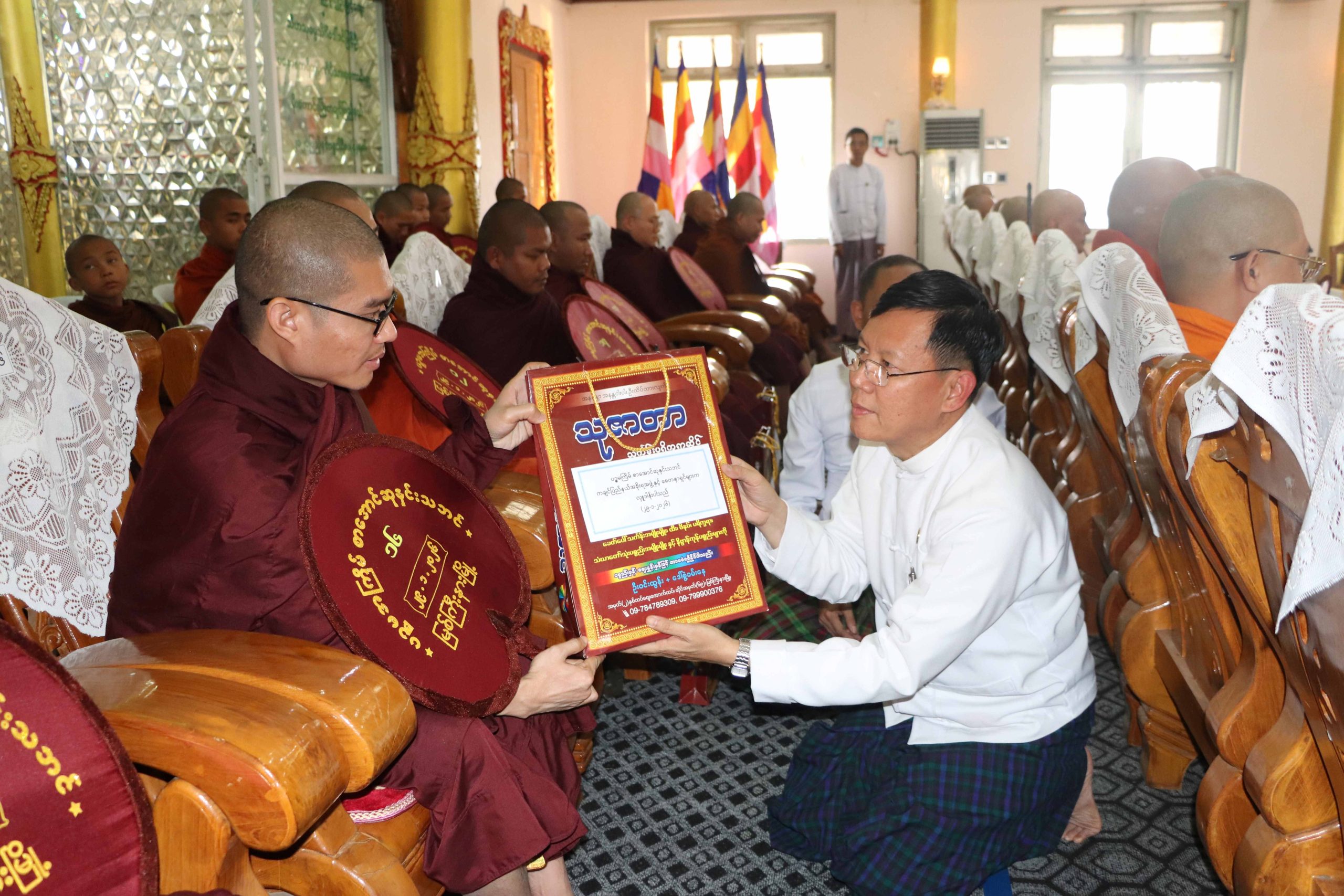 ထို့နောက် ဆရာတော်သံဃာတော်ကြီးများအား လှူဖွယ်ပစ္စည်းများနှင့်ဝတ္တုငွေများကို ဆက်ကပ်လှူဒါန်းခဲ့ကြပြီး ပြည်နယ်ဝန်ကြီးက ပြည်နယ်အစိုးရအဖွဲ့ကိုယ်စား ချီးမြှင့်ငွေကျပ်သိန်း (၅၀)ကို ပေးအပ်လှူဒါန်းသည်။
