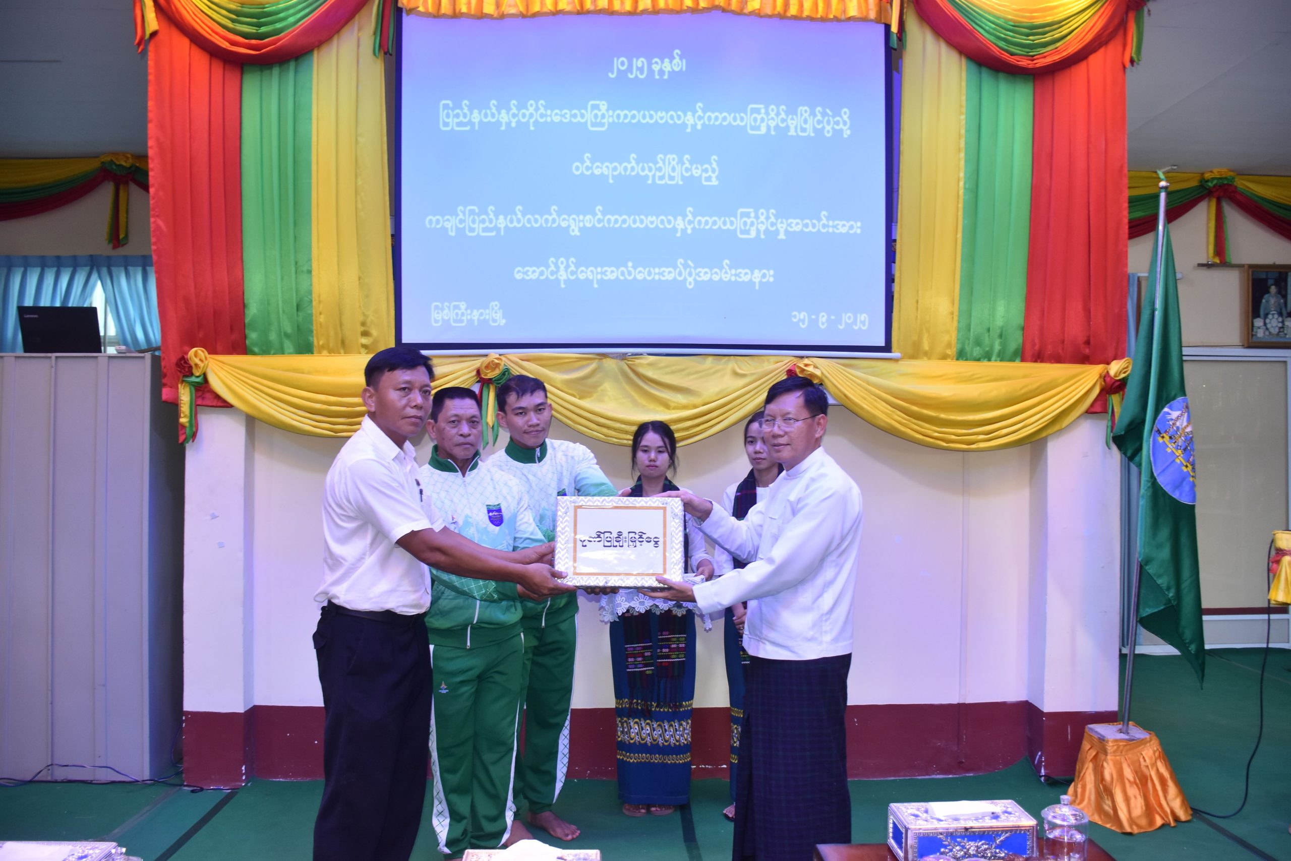 ၂၀၂၅ ခုနှစ်၊ တိုင်းဒေသကြီးနှင့်ပြည်နယ် ကာယဗလနှင့်ကာယကြံ့ခိုင်မှုပြိုင်ပွဲသို့ ဝင်ရောက်ယှဉ်ပြိုင်ကြမည့် ကချင်ပြည်နယ်ကာယဗလနှင့် ကာယကြံ့ခိုင်မှုအသင်းအား ကချင်ပြည်နယ်အစိုးရအဖွဲ့က အောင်နိုင်ရေးအလံနှင့် ချီးမြှင့်ထောက်ပံ့ငွေများ ပေးအပ်ပွဲအခမ်းအနားကို မြစ်ကြီးနားမြို့ ပြည်သူ့အားကစားကွင်းအတွင်းရှိ ပြည်နယ်အားကစားနှင့်ကာယပညာဦးစီးဌာနရုံး ခန်းမ၌ ကျင်းပပြုလုပ်သည်။