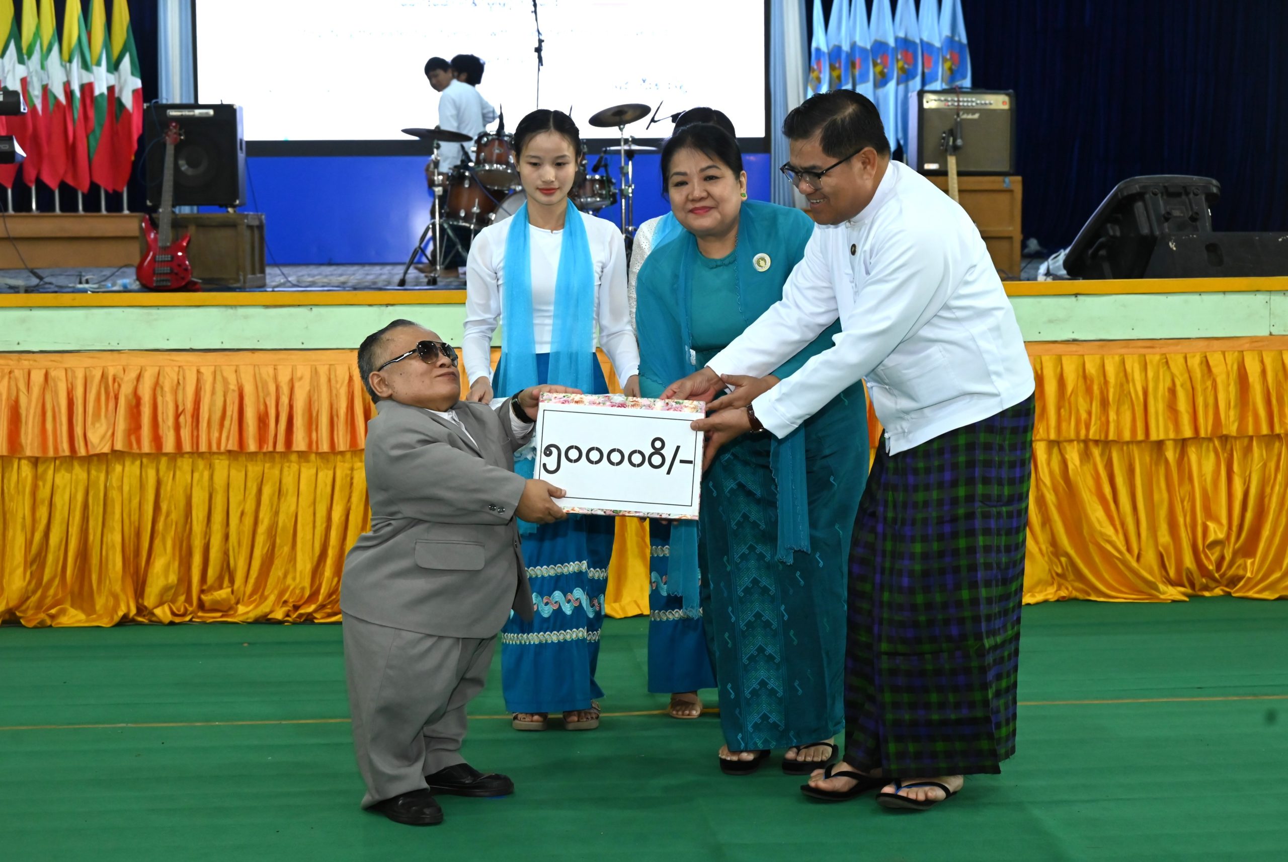 ယင်းနောက် ကချင်ပြည်နယ်မသန်စွမ်းသူများအသင်းအဖွဲ့မှ ကျောင်းသား/ ကျောင်းသူလေး များက ခေတ်ပေါ်တေးသီချင်းများဖြင့် သီဆိုဖျော်ဖြေတင်ဆက်ခဲ့ကြရာ ပြည်နယ်ဝန်ကြီးချုပ်နှင့် ဇနီး ဒေါ်နန်ဆိုင်း၊ ပြည်နယ်တရားလွှတ်တော်တရားသူကြီးချုပ်နှင့် ပြည်နယ်အစိုးရအဖွဲ့ဝင် ဝန်ကြီးများက ဂုဏ်ပြုချီးမြှင့်ငွေများကို အသီးသီးပေးအပ်ချီးမြှင့်ခဲ့ကြရာ ကချင်ပြည်နယ်မသန်စွမ်းသူများအသင်း ဥက္ကဋ္ဌ ဦးလမုန်ဂမ်ဖန်က ကျေးဇူးတင်စကားပြန်လည်ပြောကြားခဲ့သည်။