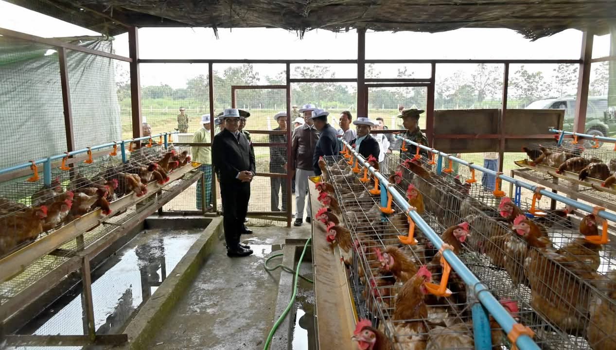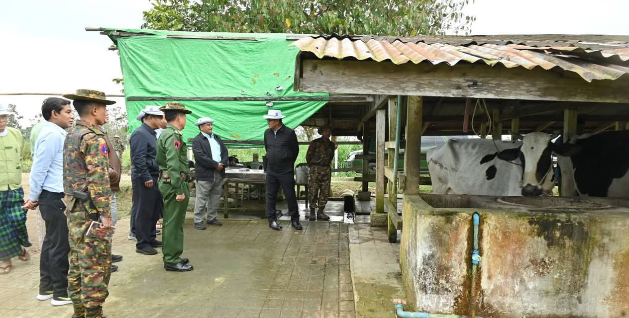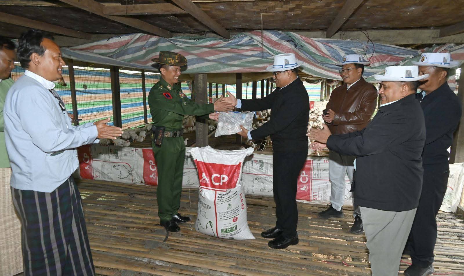ထိုမှတစ်ဆင့် တနိုင်းမြို့အဝင် ကင်ဆားရာရပ်ကွက်အတွင်းရှိ ဒေသကွပ်ကဲမှုစစ်ဌာနချုပ် (တနိုင်း)၏ တပ်နယ်ဘက်စုံစိုက်ပျိုးမွေးမြူရေးခြံသို့ သွားရောက်ပြီး ခြံဝင်းအတွင်းရှိကြက်ခြံများ၌ အသားစားကြက်များ မွေးမြူထားရှိမှုအခြေအနေများကို လည်းကောင်း၊ ဘူးသီးပင်များ စိုက်ပျိုးအောင်မြင်ဖြစ်ထွန်းလျက်ရှိသည့် အခြေအနေများကိုလည်းကောင်း၊ နို့စားနွားများ စနစ်တကျ မွေးမြူထားရှိမှုအခြေအနေများနှင့် နွားစာအဖြစ် နေဗွီယာမြက်များ စိုက်ပျိုးထားရှိမှုများကိုလည်းကောင်း၊ ဥစားကြက်များ စနစ်တကျ မွေးမြူထားရှိမှု၊ အသားတိုးဝက်များ မွေးမြူထားရှိမှုနှင့် ခြံဝင်းအတွင်း တိုင်ထောင်ပဲပင်များ စိုက်ပျိုးဖြစ်ထွန်း အောင်မြင်နေမှုအခြေအနေများကိုလည်းကောင်း လှည့်လည်ကြည့်ရှုစစ်ဆေးပြီး မွေးမြူရေးနှင့် ကုသရေးဦးစီး ဌာနက အခမဲ့ပေးအပ်သည့် တိရစ္ဆာန်အစာအိတ်များနှင့်မွေးမြူရေးအထောက်အကူပြုဆေးဝါးများကို ပေးအပ်ချီးမြှင့်ကာ တပ်နယ်ရိက္ခာအပြင် ဒေသတွင်းရောင်းချပေးနိုင်မှုအခြေအနေများကို မေးမြန်းဆွေးနွေးခဲ့ကြကာ လိုအပ်သည့်မွေးမြူရေးဆိုင်ရာ နည်းပညာများနှင့် စိုက်ပျိုးရေးအတွက် မျိုးကောင်းမျိုးသန့်မျိုးစေ့များ ကူညီပေးနိုင်ရေး ဌာနဆိုင်ရာတာဝန်ရှိသူများနှင့် ပေါင်းစပ်ဆောင်ရွက်ပေးခဲ့ကြောင်း သိရသည်။