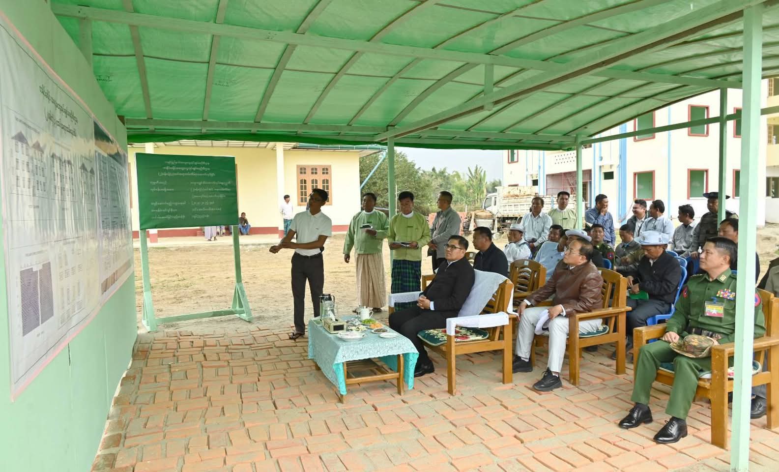 ထို့သို့ ကွင်းဆင်းစစ်ဆေးရာတွင် လုပ်ငန်းခွင်အတွင်းရှိ ရှင်းလင်းဆောင်၌ (၂)ခန်းတွဲ (၃)ထပ် အရာထမ်းအိမ်ရာ တည်ဆောက်ခြင်းလုပ်ငန်းများနှင့်စပ်လျဉ်း၍ တင်ဒါအောင်မြင်ခဲ့သည့် မနောရွှေစံအိမ်ကုမ္ပဏီမှ တာဝန်ရှိသူ၏ ရှင်းလင်းတင်ပြမှုများအပေါ် ပြည်နယ်ဝန်ကြီးချုပ်က တည်ဆောက်ရေး လုပ်ငန်းသုံးပစ္စည်းများ သယ်ယူရရှိမှုအခြေအနေများနှင့် လိုအပ်ချက်များကို မေးမြန်းဆွေးနွေးကာ သတ်မှတ်ဘဏ္ဍာနှစ်အတွင်း စံချိန်စံညွှန်းနှင့်အညီ သတ်မှတ်ချိန်ပြီးစီးအောင် ဆောင်ရွက်ရေးဌာနဆိုင်ရာတာဝန်ရှိသူများနှင့် ပေါင်းစပ်ညှိနှိုင်းဆောင်ရွက်ပေးခဲ့ကာ ၂၀၂၄-၂၀၂၅ ဘဏ္ဍာရေးနှစ် ပြည်နယ်ငွေလုံးငွေရင်း ရန်ပုံငွေကျပ်သန်း (၅၇၉)သန်းဖြင့် တည်ဆောက်လျက်ရှိသည့် (၂)ခန်းတွဲ (၃)ထပ် RCC ဝန်ထမ်းအိမ်ရာ အဆောက်အဦသစ်တည်ဆောက်နေမှုအခြေအနေများကို လှည့်လည်ကြည့်ရှုစစ်ဆေးခဲ့ကြသည်။