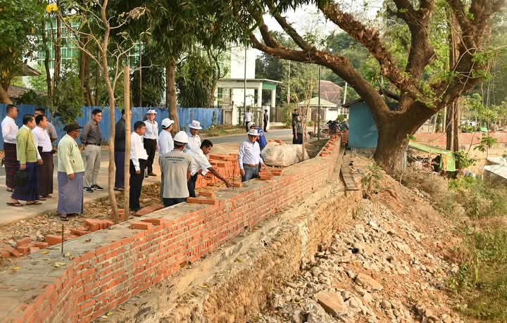 ရှေးဦးစွာ ပြည်နယ်ဝန်ကြီးချုပ်သည် ပြည်နယ်ဝန်ကြီးများ၊ ပြည်နယ်အဆင့်ဌာနဆိုင်ရာတာ ဝန်ရှိသူများသည် မြစ်ကြီးနားမြို့ ကမ်းနားလမ်းတစ်လျှောက် စည်ပင်သာယာဆိပ်ကမ်းမှ We Love Myitkyina ဆိုင်းဘုတ်အထိ မြစ်ရေမြင့်တက်မှု ၁၄၅၀ စင်တီမီတာ အမြင့်ထိ ကာကွယ်ထားနိုင်သည့် ရှိပြီးသားကျောက်စီရေထိန်းနံရံပေါ်တွင် ရေလျှံတားနံရံ (အုတ်ရိုးစီကာခြင်း)လုပ်ငန်း အပိုင်း(၁) အဖြစ် အရှည်ပေ အလျား ၁၂၉၅ ပေ တည်ဆောက်လျက်ရှိသည့် အခြေအနေများကို လှည့်လည် ကြည့်ရှုစစ်ဆေးခဲ့ကြသည်။