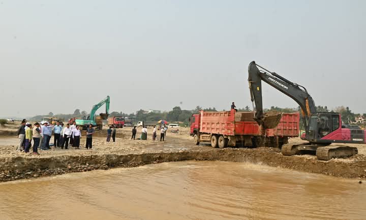 ထိုမှတစ်ဆင့် ပြည်နယ်ဝန်ကြီးချုပ်နှင့် အဖွဲ့ဝင်များသည် ဧရာဝတီမြစ်ကြောင်း ရှင်းလင်းရေးစီမံကိန်းလုပ်ငန်းတစ်ခုဖြစ်သည့် ဗလမင်းထင်တံတားအောက် ဖြစ်ပေါ်လျက်ရှိသည့် သဲသောင်ခုံအား မြစ်ရေကြောင်း ဖြောင့်တန်းစွာစီးဆင်းနိုင်ရေး သဲသောင်ရှင်းလင်းရေးလုပ်ငန်းအတွက် မူလလျာထားသည့် အလျား ၆၀၀၀ ပေ၊ အကျယ် ၂၄၀၊ အနက် ရေစစ်မျဉ်း အောက် ၂ မီတာ တူးဖော်ဆောင်ရွက်သွားရမည့် အစီအစဉ်အား မြစ်ရေအတက်/အကျ ဖြစ်ပေါ်မှုအခြေအနေအရ အလျား ၅၀၀၀ ပေ၊ အကျယ် ၁၆၅ ပေနှင့် အနက် ရေစစ်မျဉ်းအောက် ၂ မီတာတူးဖော်ရှင်းလင်းနိုင်ရေး ဒေသတွင်း သဲကျောက်လုပ်ငန်းရှင်များမှ ဆောင်ရွက်လျက်ရှိသည့် လုပ်ငန်းစီမံကိန်းဧရိယာအတွင်း ဘတ်ဟိုး ယာဉ်ကြီးများ၊ သဲကျောက်တင်ကားကြီးများဖြင့် ဆောင်ရွက်လျက်ရှိသည့် အခြေအနေများအား လှည့်လည်ကြည့်ရှုစစ်ဆေးခဲ့ကြပြီး ပြည်နယ်ဝန်ကြီးချုပ်က မိုးမကျမီ၊ မြစ်ရေမြင့်တက်လာခြင်းမရှိသေးမီ လုပ်ငန်းများအရှိန်အဟုန်ဖြင့် ဆောင်ရွက်နိုင်ရေး တာဝန်ရှိသူများနှင့် ညှိနှိုင်းပေါင်းစပ်ဆောင်ရွက် ပေးခဲ့သည်။