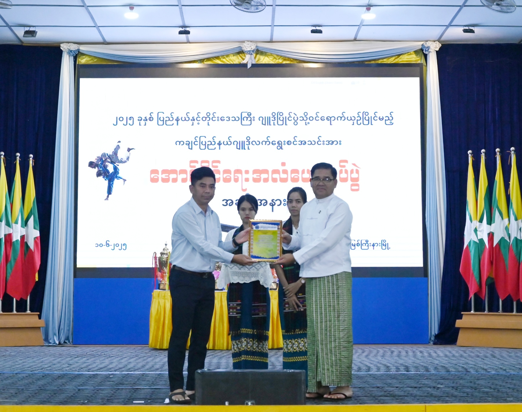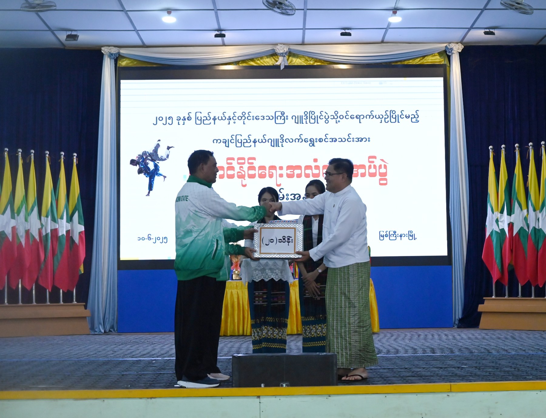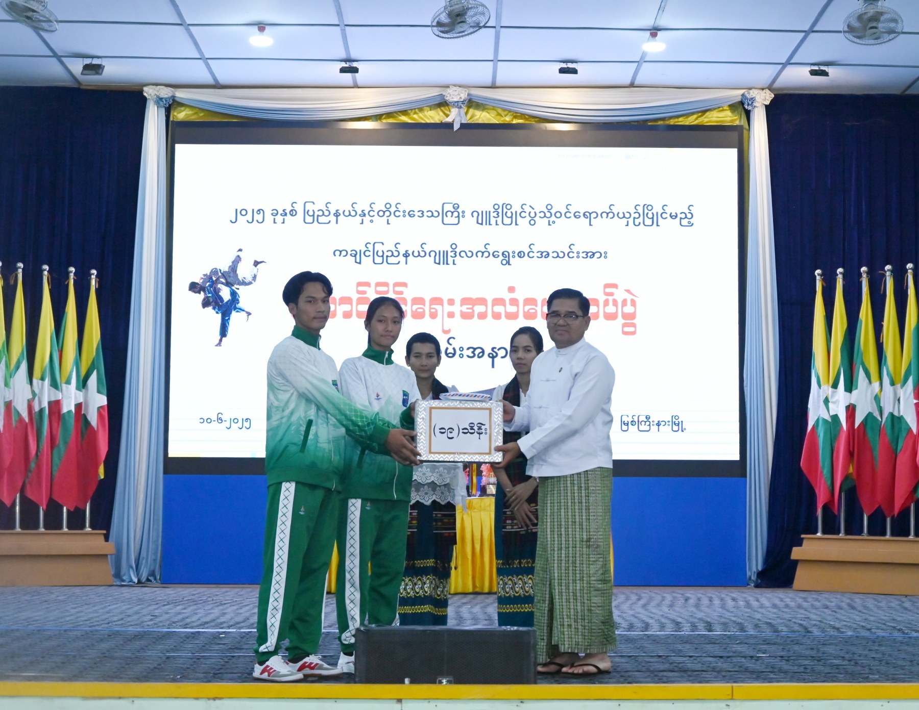 ထို့နောက် ပြည်နယ်ဝန်ကြီးချုပ်က ပြည်နယ်လက်ရွေးစင်ဂျူဒိုအသင်း အုပ်ချုပ်သူ၊ နည်းပြနှင့် ကစားသများထံ အောင်နိုင်ရေးအလံနှင့် ဂုဏ်ပြုချီးမြှင့်ငွေကျပ်သိန်း ၅၀ ကိုလည်းကောင်း၊ ပြည်နယ်ဂျူဒိုဆပ်ကော်မတီဥက္ကဋ္ဌ၊ ဦးကျော်သူရက ချီးမြှင့်ငွေကျပ်သိန်း ၂၀ နှင့် အလှူရှင်များက ချီးမြှင့်ငွေ ကျပ် ၁၀ သိန်းကိုလည်းကောင်း အသီးသီးချီးမြှင့်ပေးအပ်ခဲ့ကြရာ ပြည်နယ်လက်ရွေးစင်ဂျူဒိုအသင်းနည်းပြက ပြိုင်ပွဲအတွက် ကြိုတင်လေ့ကျင့်ပြင်ဆင်ဆောင်ရွက်ခဲ့မှုအခြေအနေများနှင့် အောင်နိုင်ရေးကော်မတီဥက္ကဋ္ဌက လက်ရွေးစင်အသင်းကိုယ်စား အောင်နိုင်ရေးအတွက် ကတိပြုစကားပြန်လည် ပြောကြားခဲ့ကြောင်း သိရသည်။
