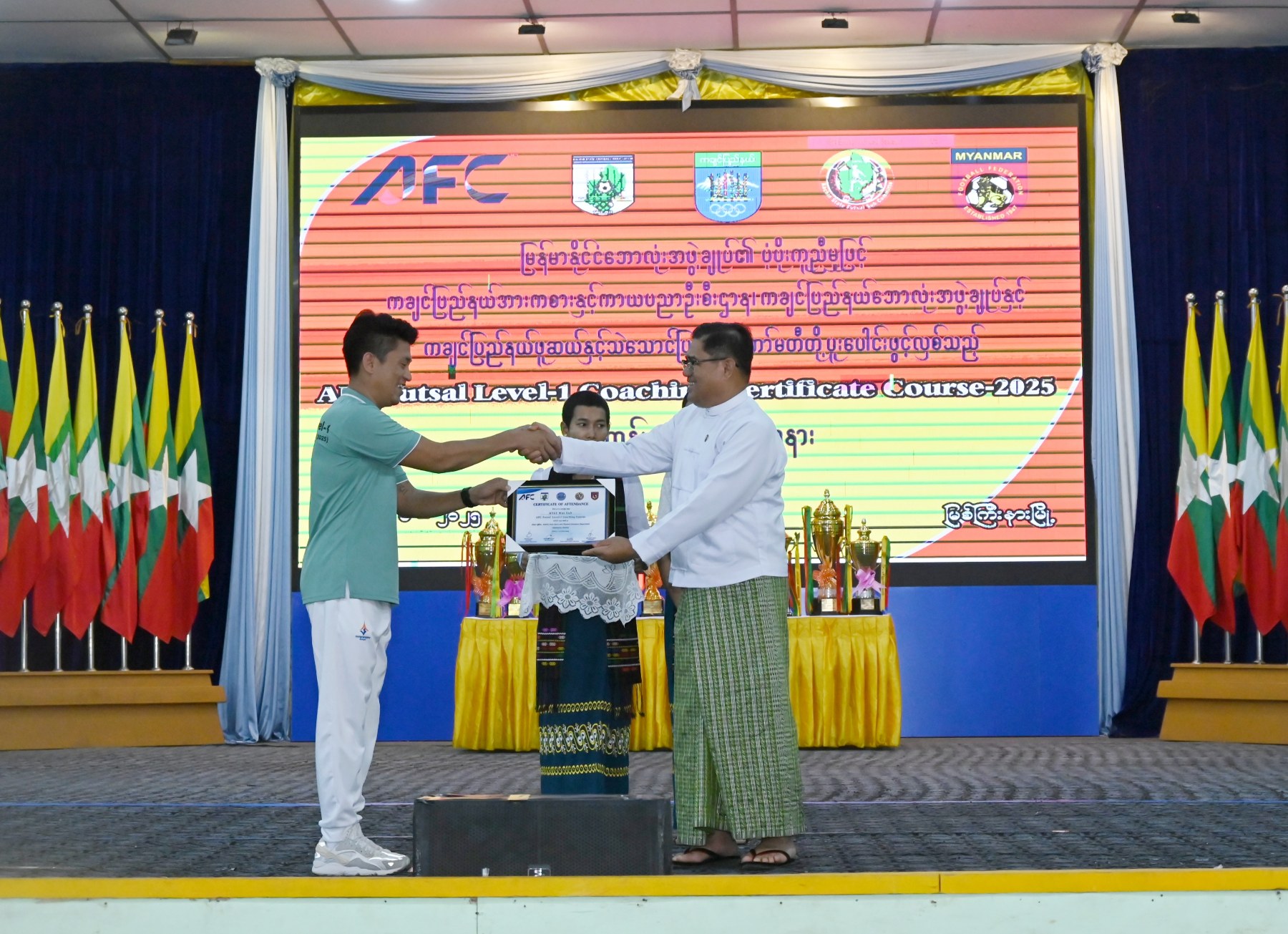 ရှေးဦးစွာ AFC Futsal Level-1 Coaching Certificate Course 2025 သင်တန်းဆင်းပွဲတွင် ပြည်နယ်ဝန်ကြီးချုပ်က ဖူဆယ်အားကစားနည်းသည် ကမ္ဘာ့အဆင့်မီ အားကစားပညာရပ်ဖြစ်ပြီး ယခု (၆)ရက်တိတိသင်ကြားပေးခဲ့သည့် နည်းစနစ်၊ နည်းဗျူဟာ၊ စိတ်ပိုင်းဆိုင်ရာနှင့် ရုပ်ပိုင်းဆိုင်ရာလေ့ ကျင့်မှုများသည် လူငယ်အားကစားသမားများ၏ စွမ်းဆောင်ရည်မြှင့်တင်ရေးအတွက် နည်းပြဆရာ ကောင်းများအဖြစ် ပြည်နယ်အတွက် အောင်မြင်မှုများကို ပိုင်ဆိုင်ကြရန် ကြိုးစားအားထုတ်ကြစေလိုကြောင်း တိုက်တွန်းမှာကြားကာ သင်တန်းနည်းပြအဖြစ် သင်ကြားပေးခဲ့ကြသော မြန်မာနိုင်ငံ ဘောလုံးအဖွဲ့ချုပ်မှ နည်းပြဆရာများအား အမှတ်တရလက်ဆောင်များကိုလည်းကောင်း၊ သင်တန်းသားများအား သင်တန်းဆင်းလက်မှတ်များကိုလည်းကောင်း ပေးအပ်ချီးမြှင့်ခဲ့သည်။