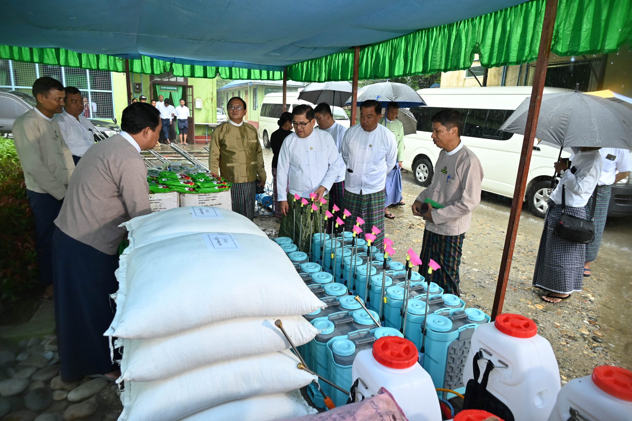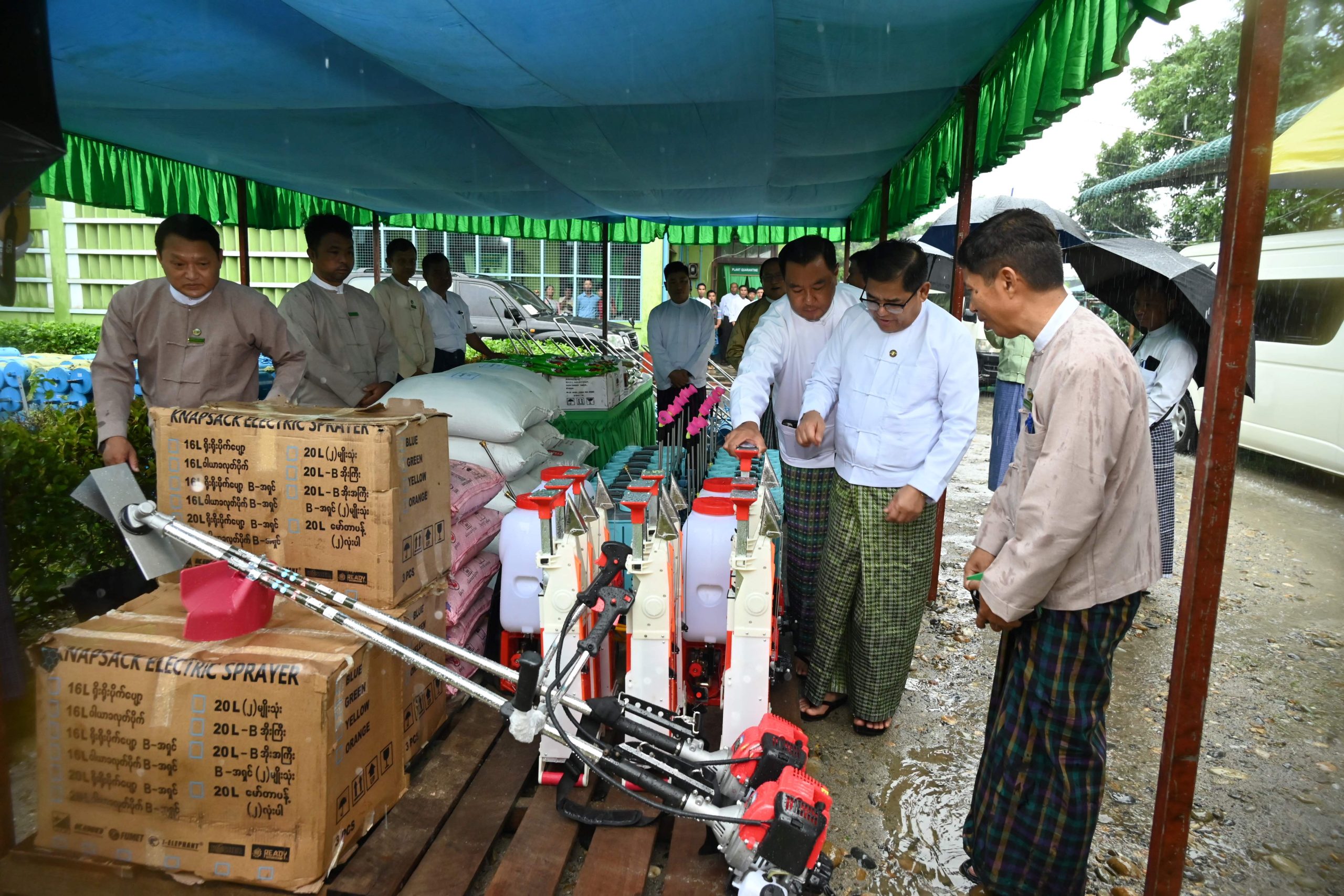 ထို့နောက် ပြည်နယ်ဝန်ကြီးချုပ်၊ ပြည်နယ်တရားလွှတ်တော်တရားသူကြီးချုပ်၊ ပြည်နယ်အစိုးရအဖွဲ့ဝင်များက ပြည်နယ်အစိုးရအဖွဲ့၏ ငွေလုံးငွေရင်းရန်ပုံငွေဖြင့် ဝယ်ယူပေးခဲ့သော စပါးမျိုးစေ့ချ ကိရိယာ (Seeder) အစုံ (၁၅၀) အား သက်ဆိုင်ရာ မြို့နယ်စိုက်ပျိုးရေးဦးစီးမှူးများထံသို့လည်းကောင်း၊ အကျိုးဆောင်တောင်သူများအတွက် သွင်းအားစုများဖြစ်သည့် စပါးမျိုးသန့်မျိုးစေ့များနှင့် ဟင်းသီးဟင်းရွက်မျိုးစေ့ထုတ်များ၊ ဓာတ်မြေသြဇာ၊ မှိုသတ်ဆေး၊ ရွက်ဖျန်းအားတိုးဆေး၊ ပိုးသတ်ဆေးနှင့် ဆေးဖျန်းပုံးများကိုလည်းကောင်း အသီးသီးပေးအပ်ခဲ့ကြသည်။