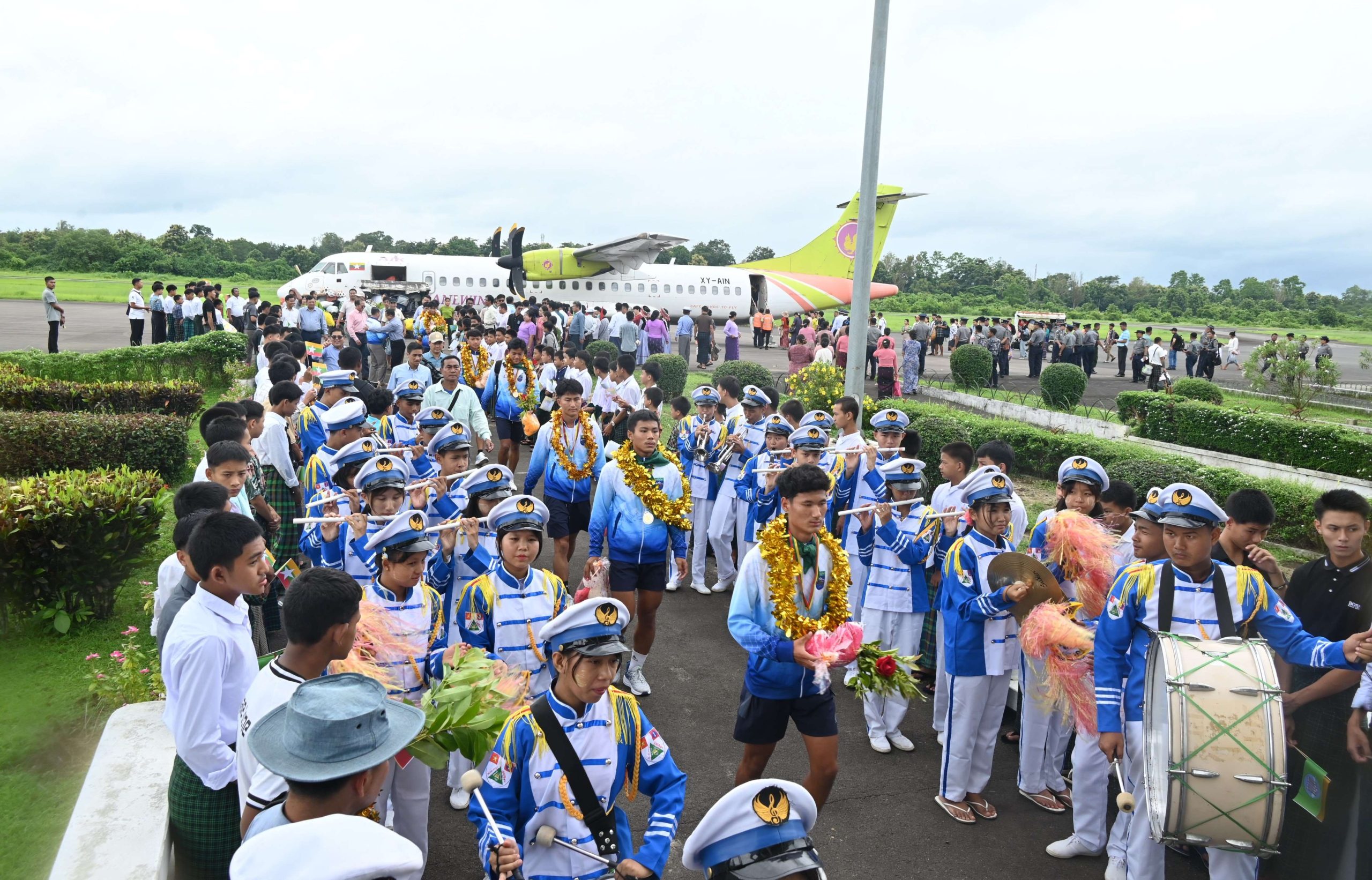 ထိုသို့ ကချင်ပြည်နယ်လက်ရွေးစင်အသင်း ပြန်လည်ရောက်ရှိလာမှု ဂုဏ်ပြုကြိုဆိုရာတွင် ပြည်နယ်ဝန်ကြီးချုပ် ဦးခက်ထိန်နန်နှင့် ဇနီးဒေါ်နန်ဆိုင်း၊ ပြည်နယ်တရားလွှတ်တော်တရားသူကြီးချုပ် ဒေါ်အေးအေးမော်၊ ပြည်နယ်အစိုးရအဖွဲ့ဝင် ဝန်ကြီးများနှင့်တကွ ၎င်းတို့၏ ဇနီးများ၊ ပြည်နယ် ဥပဒေချုပ်၊ ပြည်နယ်အစိုးရအဖွဲ့ အတွင်းရေးမှူးတို့က ပြည်နယ်/ ခရိုင်/ မြို့နယ်အဆင့် ဌာနဆိုင်ရာများ၊ ပြည်နယ်အားကစားနှင့်ကာယပညာဦးစီးဌာနမှ ဝန်ထမ်းများနှင့် အားကစားဆပ်ကော်မတီအသီးသီးမှ တာဝန်ရှိသူများ၊ အေရိုးဗစ်အားကစားအဖွဲ့၊ လီဆူတိုင်းရင်းသားအကအဖွဲ့၊ ဘင်ခရာအဖွဲ့၊ နယ်စပ်ဒေသတိုင်းရင်းသားလူငယ်များ ဖွံ့ဖြိုးရေးသင်တန်းကျောင်းမှ ကျောင်းသား/ ကျောင်းသူများနှင့်အတူ လေဆိပ်၌ အောင်သပြေ၊ ဂုဏ်ပြုပန်းကုံးများဖြင့် သောင်းသောင်းဖြဖြကြိုဆိုဂုဏ်ပြုခဲ့ကြသည်။