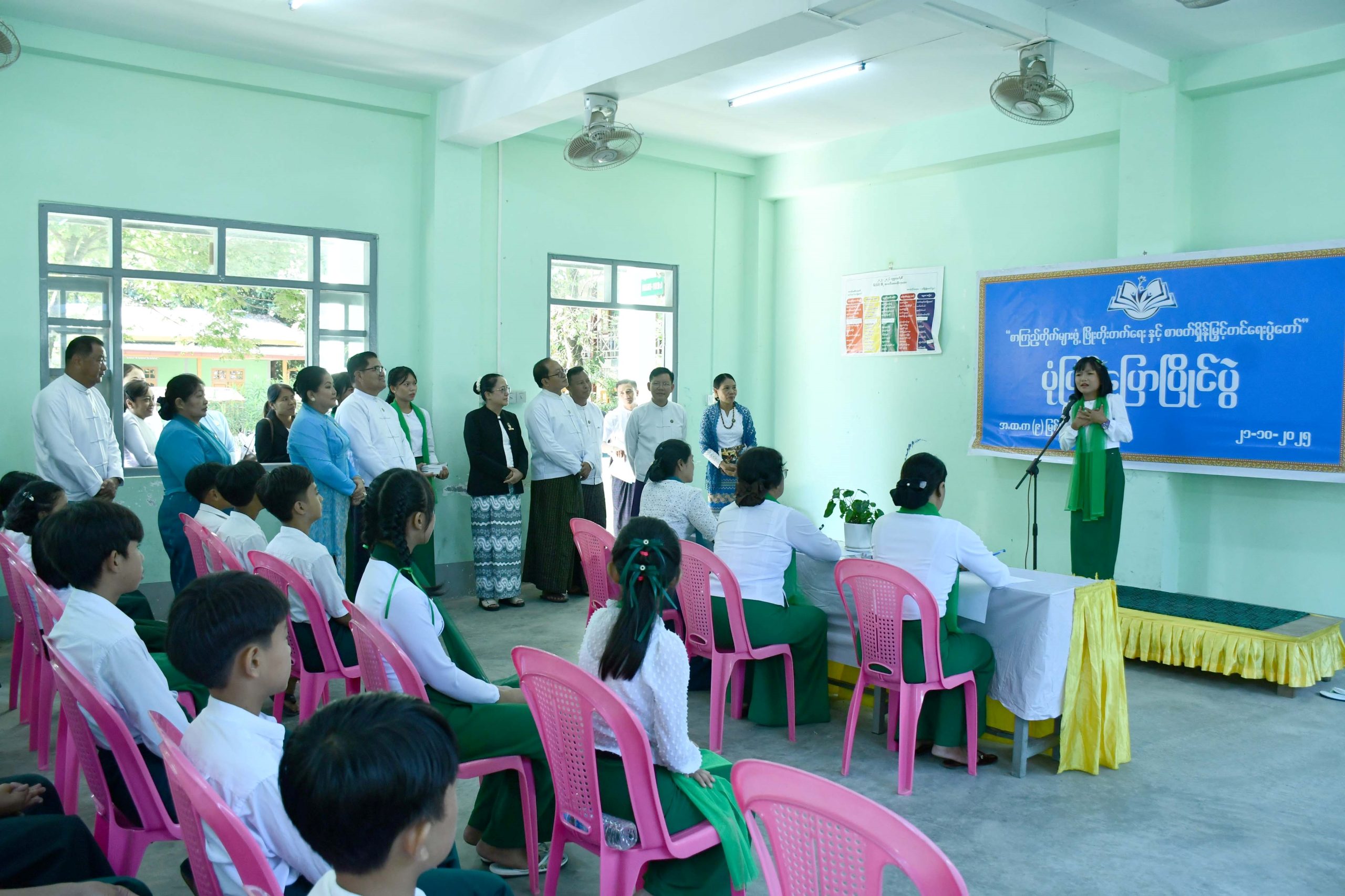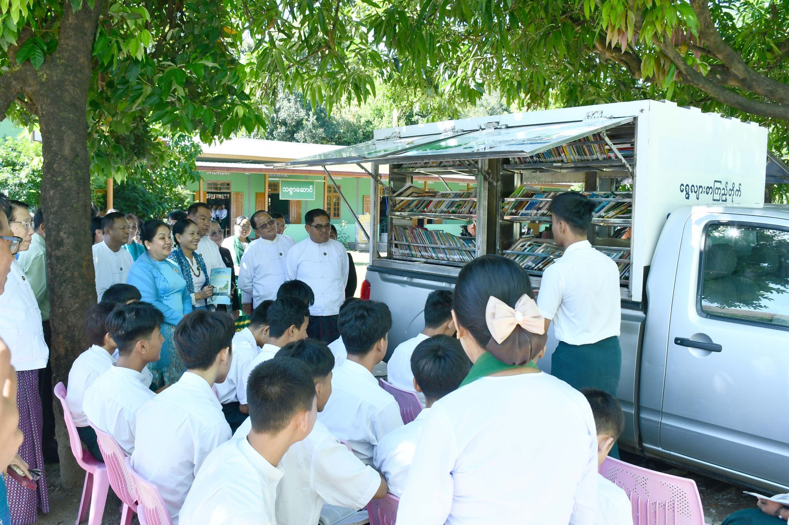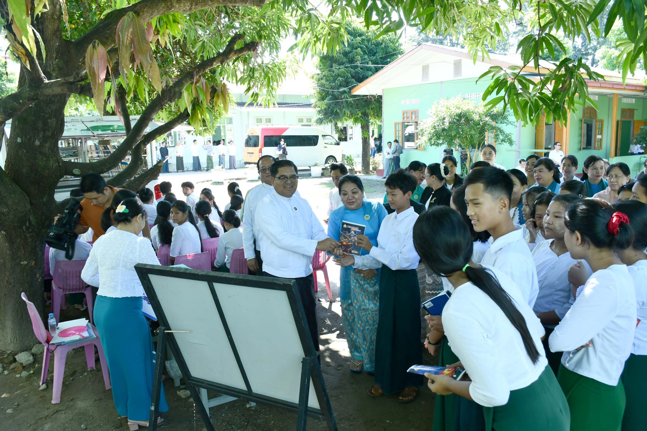 ထို့နောက် ပြည်နယ်ဝန်ကြီးချုပ်နှင့် ဇနီး၊ တာဝန်ရှိသူများအား ဘင်ခရာ၊ ပန်းပွားအဖွဲ့မှ ဦးဆောင်ကြိုဆို၍ ကျောင်းဝင်းအတွင်းနှင့် စာသင်ခန်းမများ၌ ကျောင်းသားလူငယ်များ စာပေကို ဖတ်ရှုလေ့လာပြီး ဉာဏ်ရည်ဉာဏ်သွေးများ ပိုမိုတိုးတက်ကောင်းမွန်စေရေး၊ ဗလငါးတန်ဖြင့် ပြည့်ဝသောလူငယ်များ ပေါ်ထွန်းလာစေရေး ရည်ရွယ်ကျင်းပပြုလုပ်ပေးလျက်ရှိသည့် ပြန်ကြားရေးနှင့်ပြည်သူ့ဆက်ဆံရေးဦးစီးဌာန၏ နယ်လှည့်စာကြည့်တိုက်မှ သုတ/ရသစာအုပ်စာစောင်များ ငှားရမ်းပေးခြင်းနှင့် ဖတ်ရှုလေ့လာနေမှုများအားလည်းကောင်း၊ စကားပုံဆက်ပြိုင်ပွဲ၊ ကျပန်းစကားပြောပြိုင်ပွဲ၊ ပုံပြင်ပြောပြိုင်ပွဲ၊ ကဗျာရွတ်ဆိုပြိုင်ပွဲ၊ ဆေးရောင်ခြယ်ပြိုင်များနှင့် မြှားပစ်၊ ခါးလှည့်၊ အရုပ်ဆက်စသည့် ဂိမ်းကစားနည်းများဖြင့် ထည့်သွင်းကျင်းပပေးနေမှုများကို လှည့်လည်ကြည့်ရှုအားပေးခဲ့ကြပြီး ပြိုင်ပွဲဝင် ကျောင်းသား၊ ကျောင်းသူများအတွက် ကျောင်းသုံးဗလာစာအုပ်များကို ဆုလက်ဆောင်အဖြစ် ပေးအပ်ချီးမြှင့်ခဲ့ကြသည်။