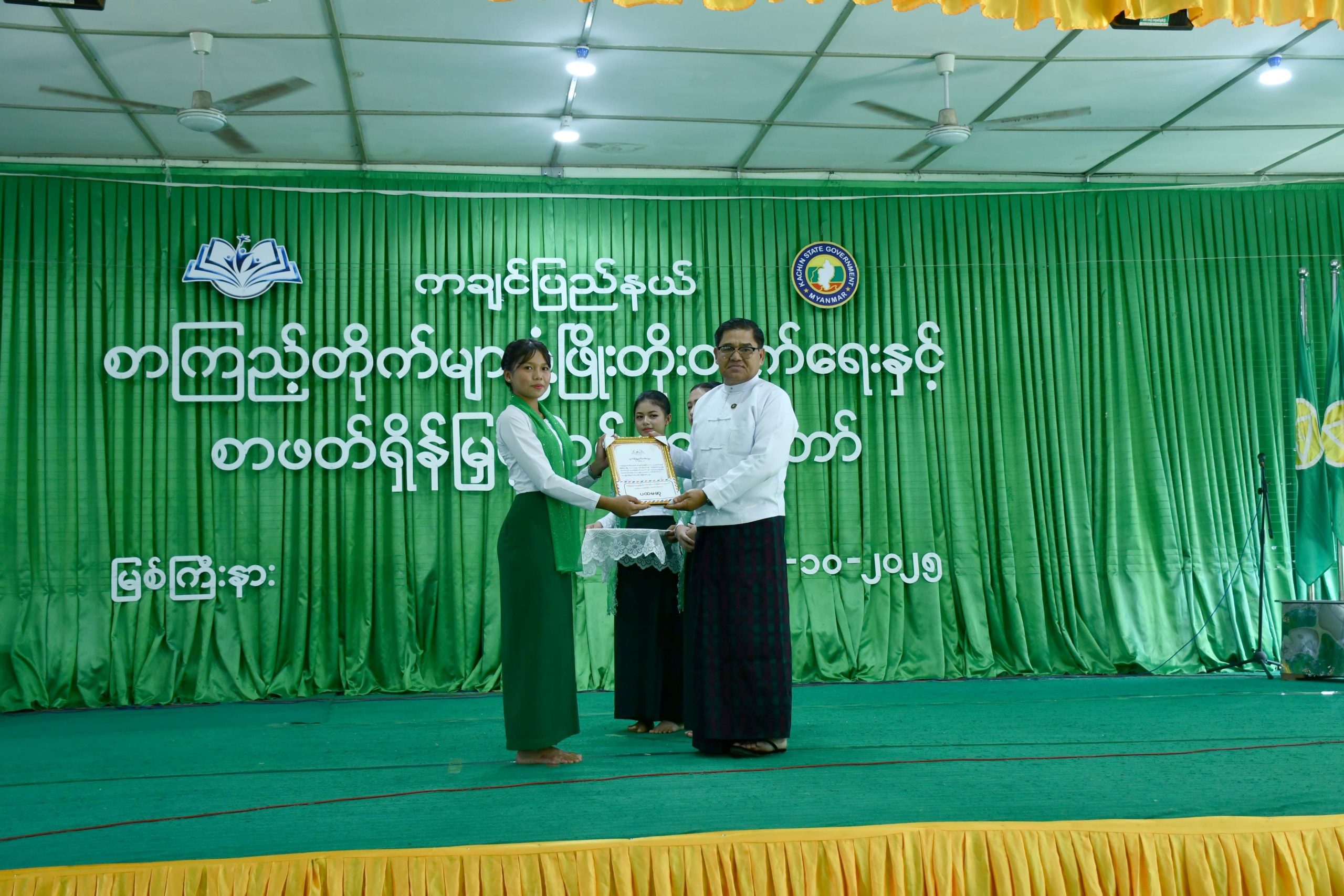 ထို့နောက် ပြည်နယ်ဝန်ကြီးချုပ်က ကျောင်းစာကြည့်တိုက်အတွက် သုတ/ ရသ စာအုပ်စာစောင်များ လှူဒါန်းပေးပြီး ပြည်နယ်ဝန်ကြီးချုပ်နှင့် ဇနီးဒေါ်နန်ဆိုင်း၊ ပြည်နယ်တရားလွှတ်တော် တရားသူကြီးချုပ်၊ ပြည်နယ်အစိုးရအဖွဲ့ဝင် ဝန်ကြီးများက စာကြည့်တိုက်များ ဖွံ့ဖြိုးတိုးတက်ရေးနှင့် စာဖတ်ရှိန်မြှင့်တင်ရေးပွဲတော်အဖြစ် လူငယ်များ ကာယဉာဏစွမ်းရည်ပြိုင်ပွဲများဖြစ်သည့် ထက်၊ လယ်၊ မူအဆင့် ကျပန်းစကားပြောပြိုင်ပွဲ၊ စာစီစာကုံးပြိုင်ပွဲ၊ ပန်းချီးပြိုင်ပွဲ၊ ပုံပြောပြိုင်ပွဲများတွင် ဆုရရှိသူများအား ဂုဏ်ပြုမှတ်တမ်းလွှာနှင့် ဂုဏ်ပြုချီးမြှင့်ငွေများကိုလည်းကောင်း၊ ပွဲတော်တွင် ပူးပေါင်းပါဝင်ခဲ့ကြသည့် ဘင်ခရာ၊ ပန်းပွားအဖွဲ့၊ သရုပ်ပြအကအဖွဲ့များအတွက် ဂုဏ်ပြုချီးမြှင့်ငွေများကို အသီးသီးပေးအပ်ချီးမြှင့်ခဲ့ကြသည်။