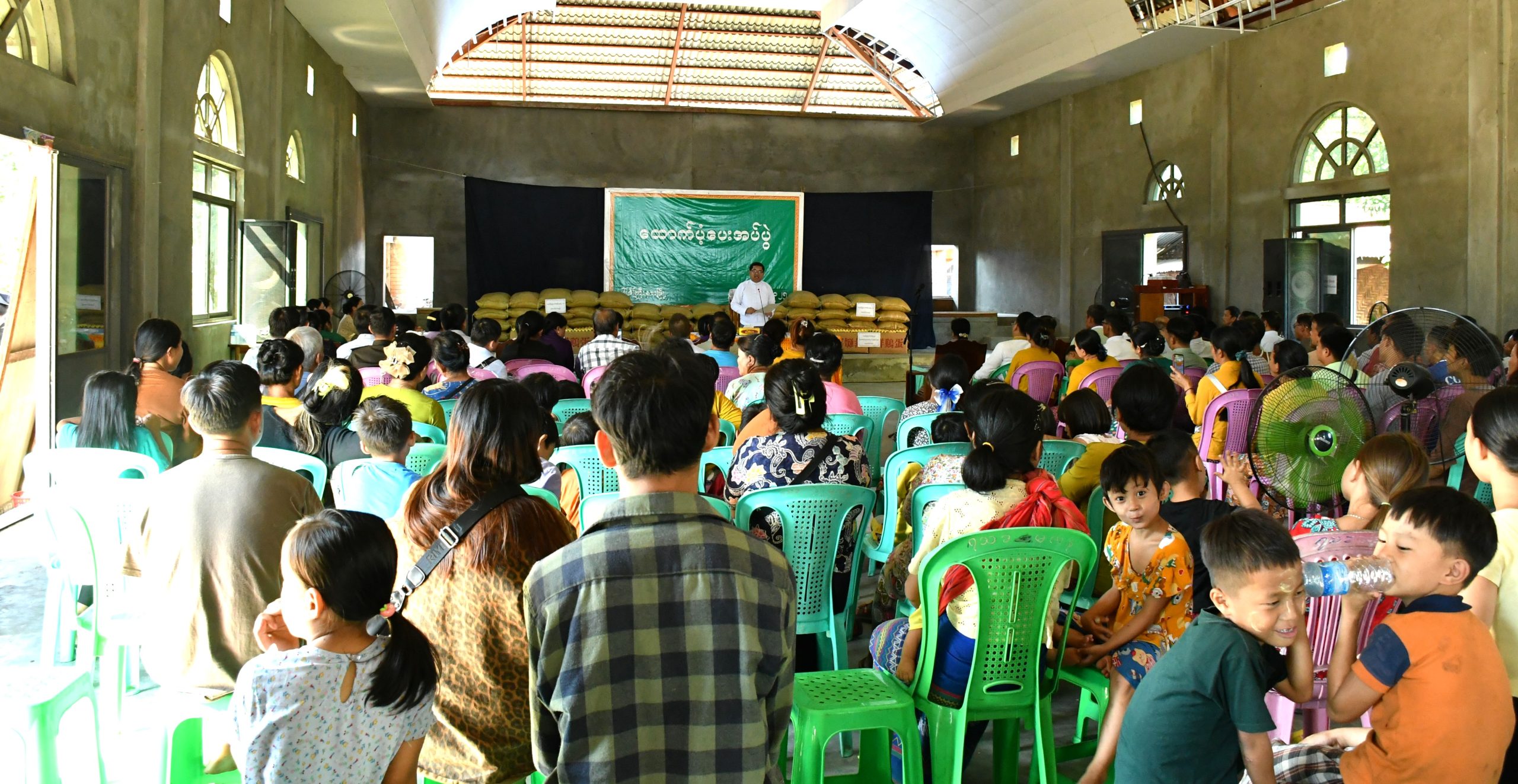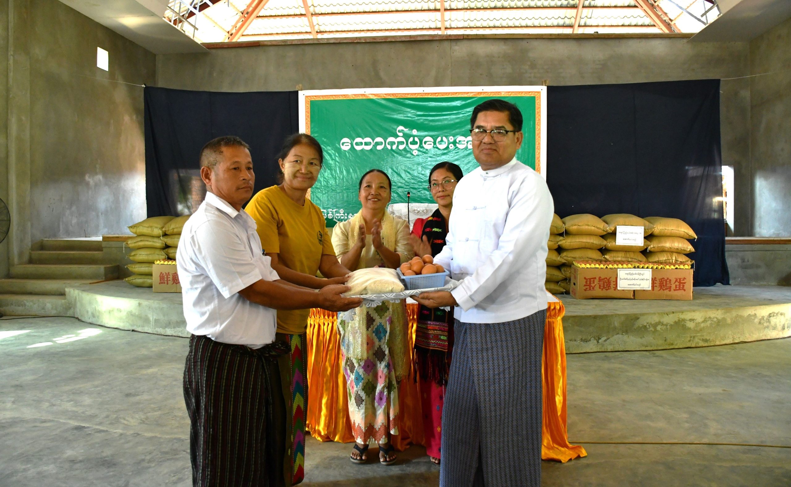 ထိုသို့ တွေ့ဆုံရာတွင် ပြည်နယ်ဝန်ကြီးချုပ်နှင့် ဇနီးဒေါ်နန်ဆိုင်း၊ ပြည်နယ်တရားလွှတ်တော် တရားသူကြီးချုပ်တို့က စခန်းအတွင်းရှိ အိမ်ထောင်စု (၆၅)စုတို့အတွက် ဆန်အိတ် (၆၅)အိတ်နှင့် ကြက်ဥများကို ထောက်ပံ့ပေးအပ်သည်။