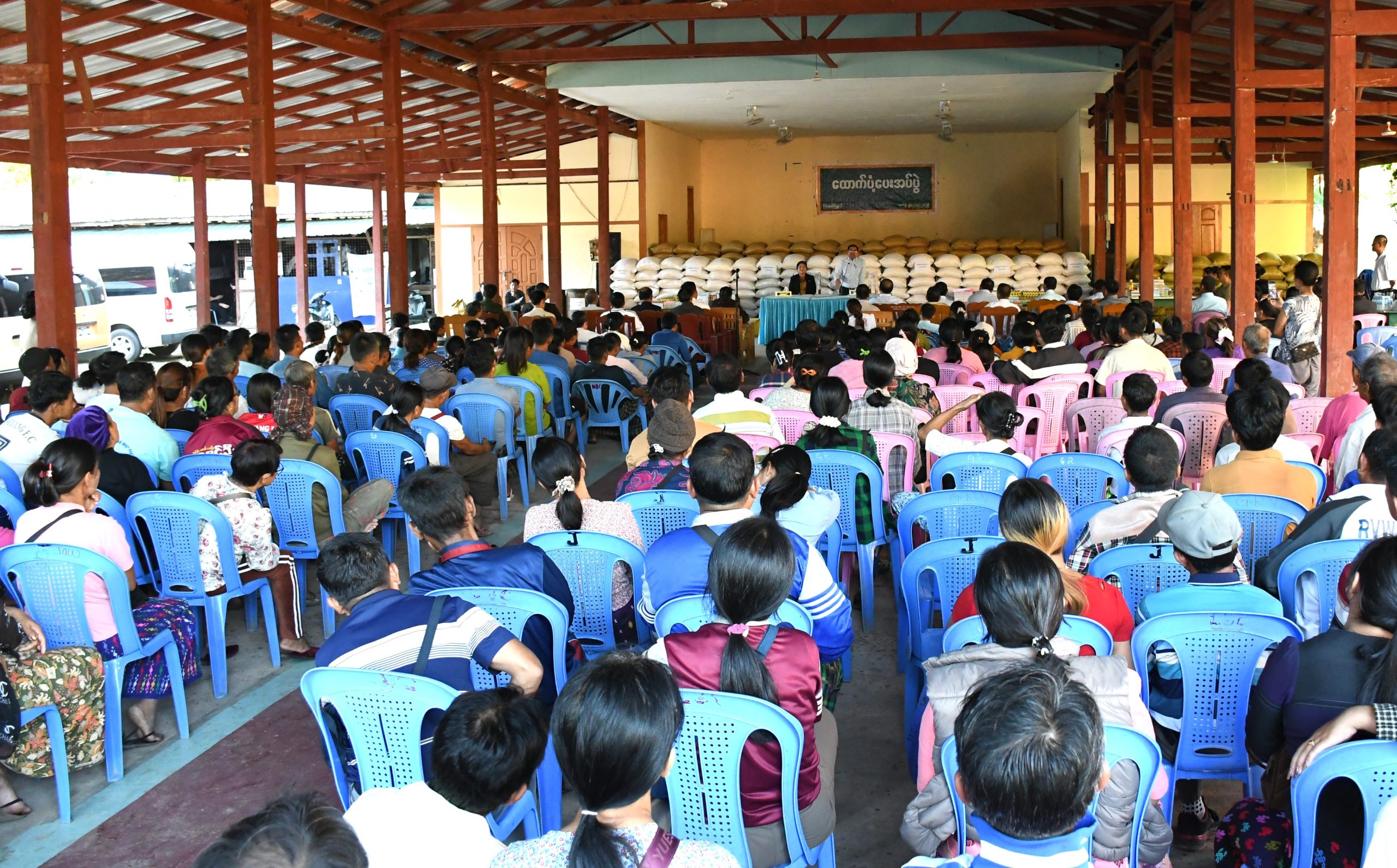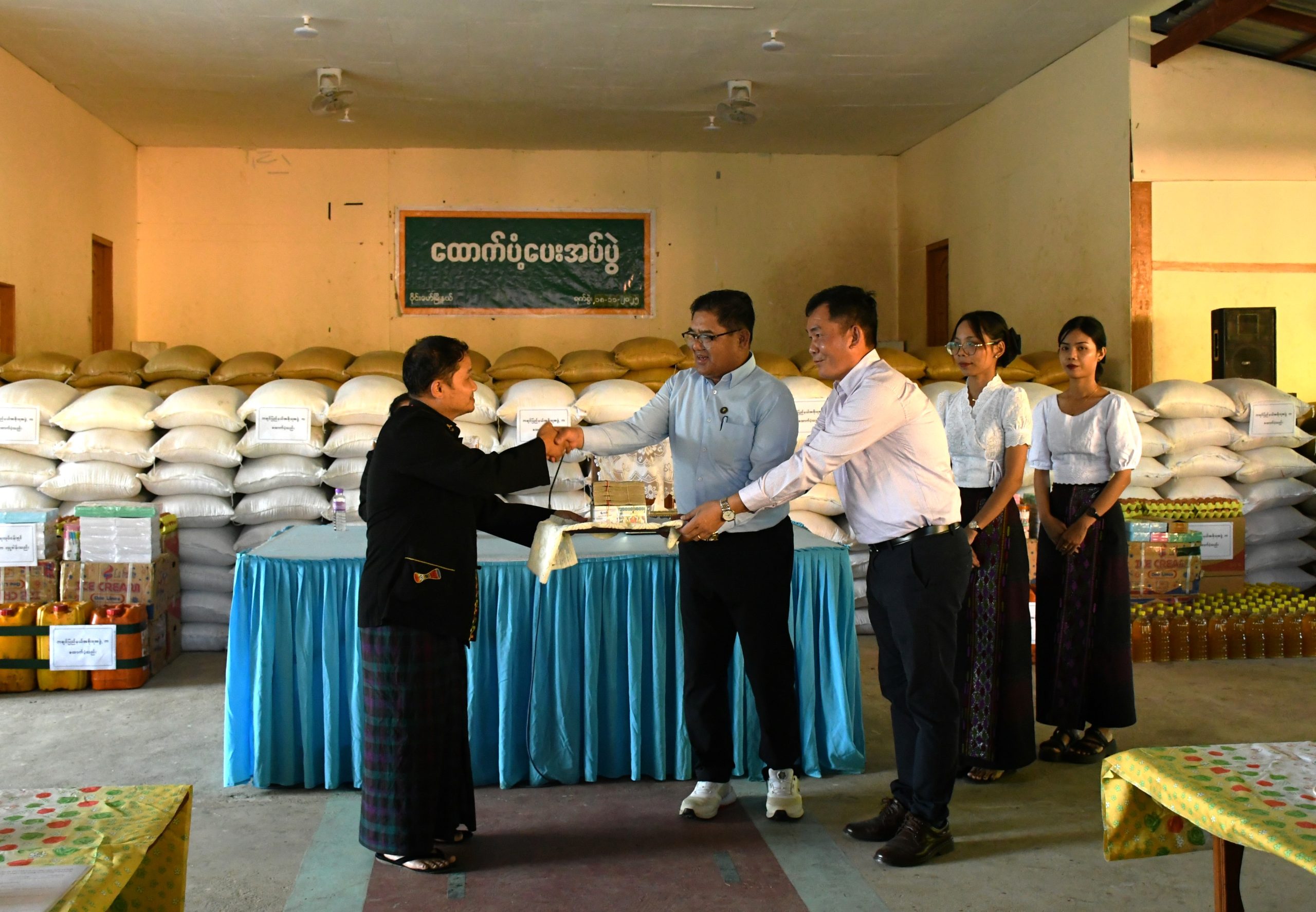 ထိုသို့တွေ့ဆုံရာတွင် အမျိုးသားကာကွယ်ရေးနှင့် လုံခြုံရေးကောင်စီ၏ ဗဟိုအကြံပေးအဖွဲ့ဝင် ဒေါ်ဒွဲဘူ၊ ပြည်နယ်ဝန်ကြီးချုပ်နှင့် ဇနီးဒေါ်နန်ဆိုင်း၊ ပြည်နယ်သယံဇာတရေးရာဝန်ကြီးနှင့် ပြည်နယ်လူမှုရေးရာဝန်ကြီး၊ တာဝန်ရှိသူများက အဆိုပါ ယာယီတိမ်းရှောင်စခန်း (၁၉)မှ အိမ်ထောင်စု (၂၄၀၄)စုတို့အတွက် ဆန်အိတ် (၅၀၀)၊ ဆီပိဿာ (၅၀၀)နှင့် ကြက်ဥအလုံး (၅၀၀၀)တို့နှင့်အတူ ကျောင်းသုံးစာရေးကိရိယာအစုံ ဒါဇင်(၃၀၀)တို့ကို အသီးသီးထောက်ပံ့ပေးအပ်ခဲ့ရာ စခန်းတာဝန်ခံများက စခန်းအလိုက် မိသားစုများနေအိမ်စားသောက်မှုဆိုင်ရာ လိုအပ်ချက်များ၊ ကျန်းမာရေး၊ ပညာရေးနှင့် စိုက်ပျိုးမွေးမြူရေးကဏ္ဍဆိုင်ရာကိစ္စရပ်များကို အသီးသီးတင်ပြကြသည်။