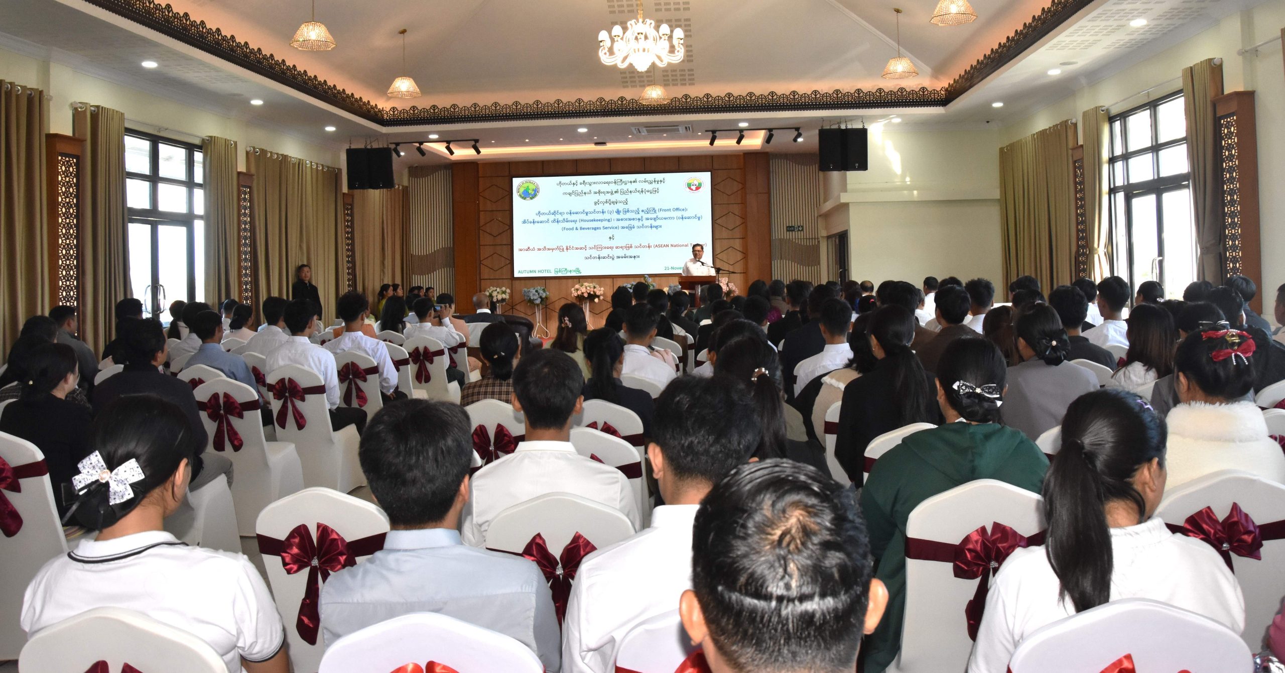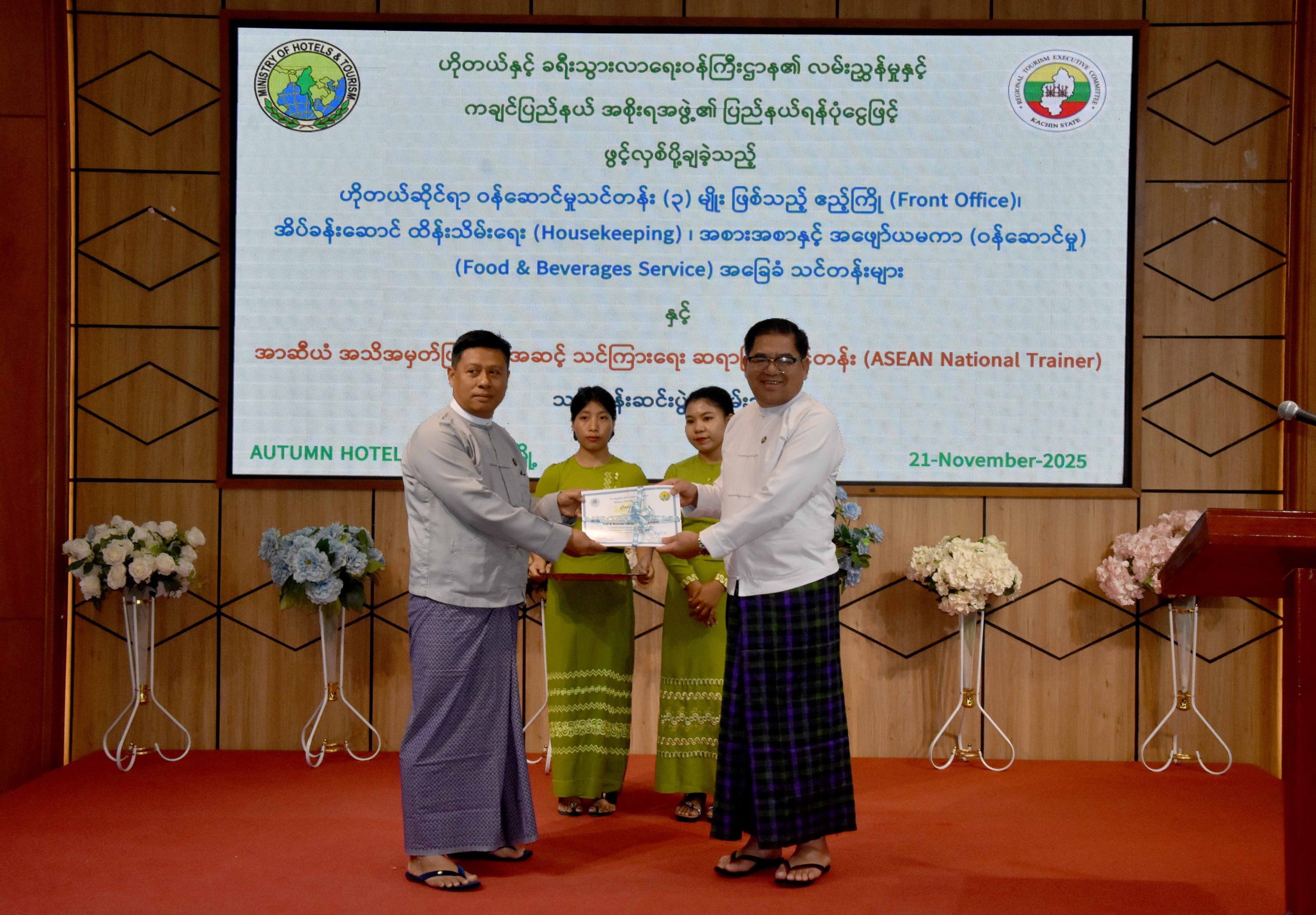ကချင်ပြည်နယ်ဝန်ကြီးချုပ် ဦးခက်ထိန်နန်သည် ယနေ့နံနက်(၉)နာရီက စီတာပူရပ်ကွက်အတွင်းရှိ Hotel AUTUMN တွင် ပြည်နယ်အစိုးရအဖွဲ့ ရန်ပုံငွေဖြင့် ဖွင့်လှစ်ပေးခဲ့သော ဟိုတယ် ဆိုင်ရာဝန်ဆောင်မှု သင်တန်း(၃)မျိုးနှင့် အာဆီယံအသိအမှတ်ပြု နိုင်ငံအဆင့် သင်ကြားရေးဆရာအဖြစ်သင်တန်း (ASEAN National Trainer)ဆင်းပွဲသို့ တက်ရောက်ခဲ့သည်။
