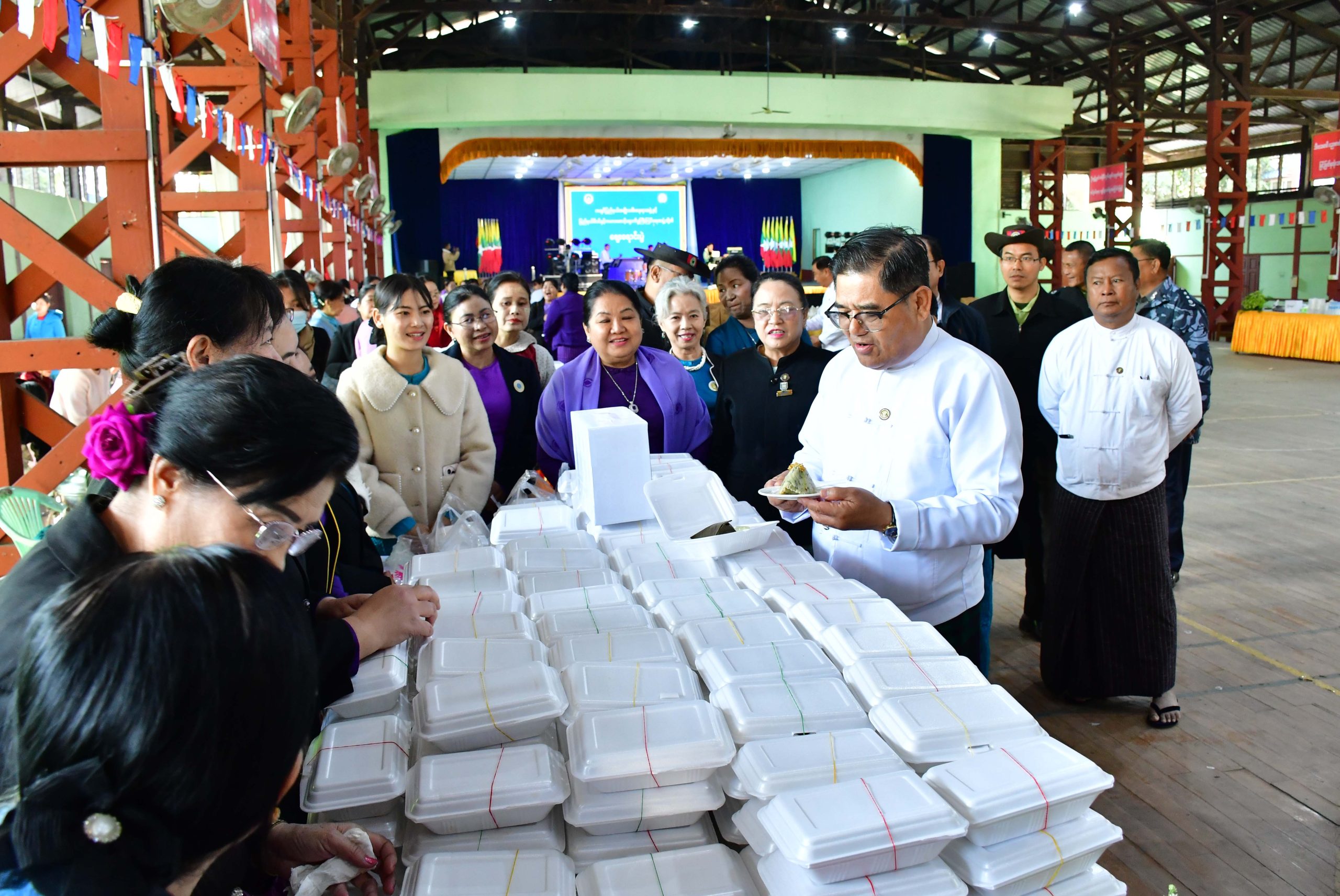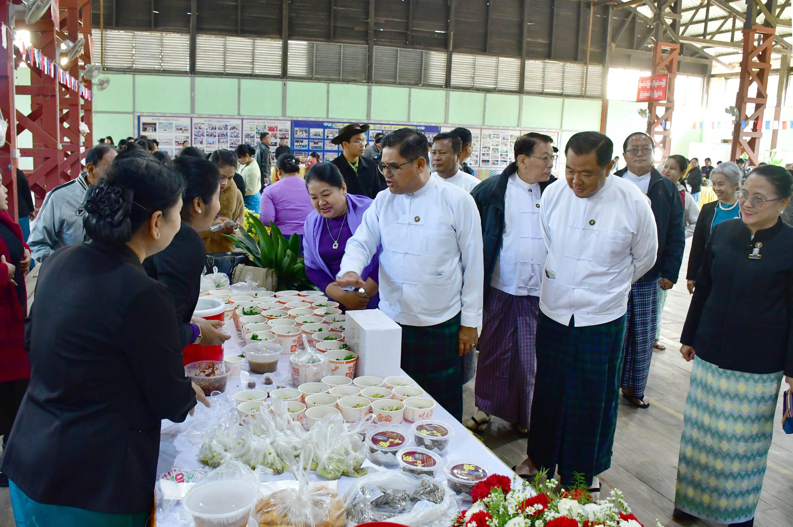 ထိုမှတစ်ဆင့် ပြည်နယ်ဝန်ကြီးချုပ်၊ ပြည်နယ်အစိုးရအဖွဲ့ဝင်များသည် မြစ်ကြီးနားမြို့ မိုးလုံလေလုံအားကစားခန်းမ၌ ကချင်ပြည်နယ်အမျိုးသမီးရေးရာအဖွဲ့နှင့် မိခင်နှင့်ကလေးစောင့်ရှောက်မှု ကြီးကြပ်ရေးအဖွဲ့တို့၏ ဈေးရောင်းပွဲတော်အခမ်းအနားသို့ တက်ရောက်ခဲ့ကြပြီး နာယကအဖွဲ့ဝင်များနှင့်အတူ ဈေးရောင်းပွဲတော်အတွင်း ပြည်နယ်/ ခရိုင်/ မြို့နယ်အဖွဲ့များ၏ မြန်မာ့ရိုးရာအစားအသောက်များနှင့်ဒေသရိုးရာအစားအသောက်များအား ချက်ပြုတ်ရောင်းချပေးနေမှု၊ ဝယ်ယူအားပေး နေမှုအခြေအနေများကို လှည့်လည်ကြည့်ရှုအားပေးခဲ့ကြပြီး ပြည်နယ်ဝန်ကြီးချုပ်က ဈေးရောင်းပွဲတော်တွင် ပါဝင်ရောင်းချခဲ့ကြသူများအား ဂုဏ်ပြုချီးမြှင့်ငွေများကို ပေးအပ်ချီးမြှင့်ခဲ့သည်။