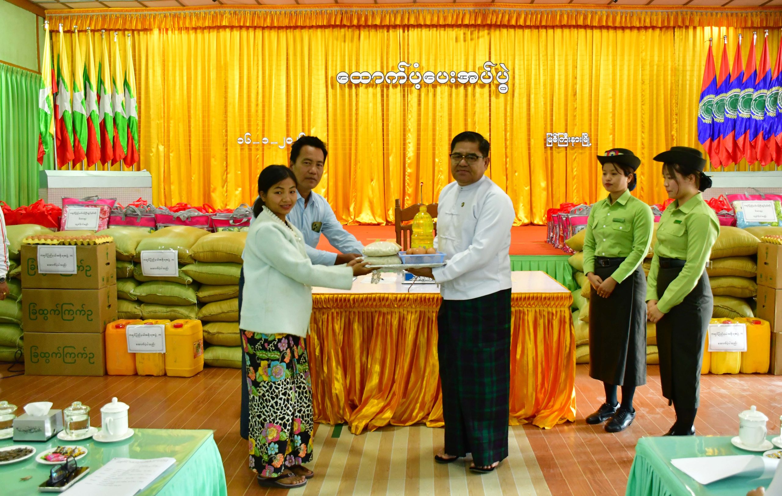 ထို့အတူ မွန်းလွဲပိုင်းတွင် မြို့နယ်စုပေါင်းရုံး မနောရွှေပြည်ခန်းမ၌ မြစ်ကြီးနားမြို့နယ်နှင့်ဝိုင်းမော်မြို့နယ်များအတွင်းရှိ ရပ်ကွက်/ကျေးရွာများနှင့် ဘာသာရေးအသင်းအဖွဲ့အသီးသီးမှ အသင်းတော်များပိုင် ခြံဝင်းများအတွင်း ယာယီခိုလှုံနေထိုင်လျက်ရှိသောတိမ်းရှောင်စခန်းများမှ အိမ်ထောင်စုများနှင့် သွားရောက်တွေ့ဆုံပြီး ပြည်နယ်ဝန်ကြီးချုပ်နှင့် တာဝန်ရှိသူများက မြစ်ကြီးနားမြို့နယ် အတွင်းရှိ ယာယီတိမ်းရှောင်စခန်း (၉)ခုတို့မှ အိမ်ထောင်စု (၅၆၂)စုနှင့် ဝိုင်းမော်မြို့နယ်အတွင်းရှိ ယာယီတိမ်းရှောင်စခန်း (၁၃၅)စုတို့ စုစုပေါင်းအိမ်ထောင်စု (၆၉၇)စုတို့အတွက် ငွေကျပ် ၇၀၈၈၇၉၀၀ တန်ဖိုးရှိ ဆန်(၂၄) ပြည်ပါအိတ် (၆၉၇) အိတ်၊ ဆီပိဿာ (၆၉၇) ပိဿာနှင့် ကြက်ဥများကို အသီးသီးထောက်ပံ့ပေးအပ်ခဲ့ရာ ယာယီတိမ်းရှောင်စခန်းများကိုယ်စား အသင်းတော်တာဝန် ရှိသူတစ်ဦးက ကျေးဇူးတင်စကား ပြန်လည်ပြောကြားသည်။