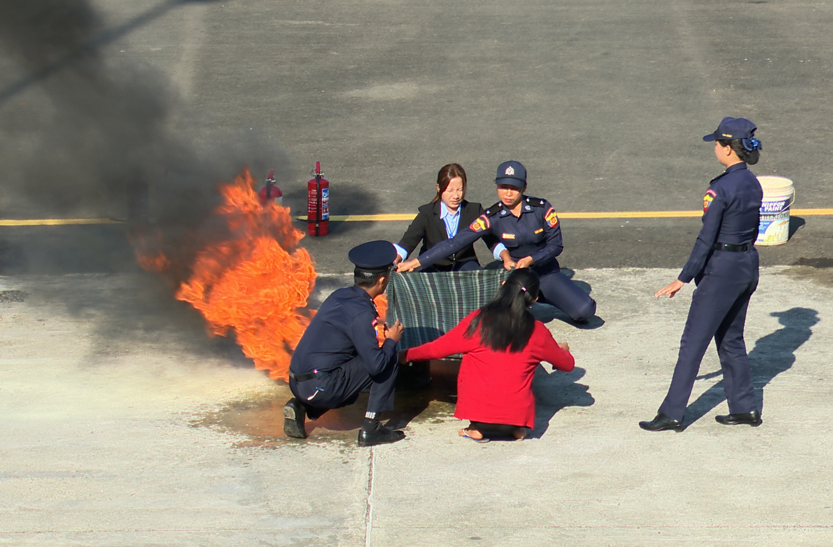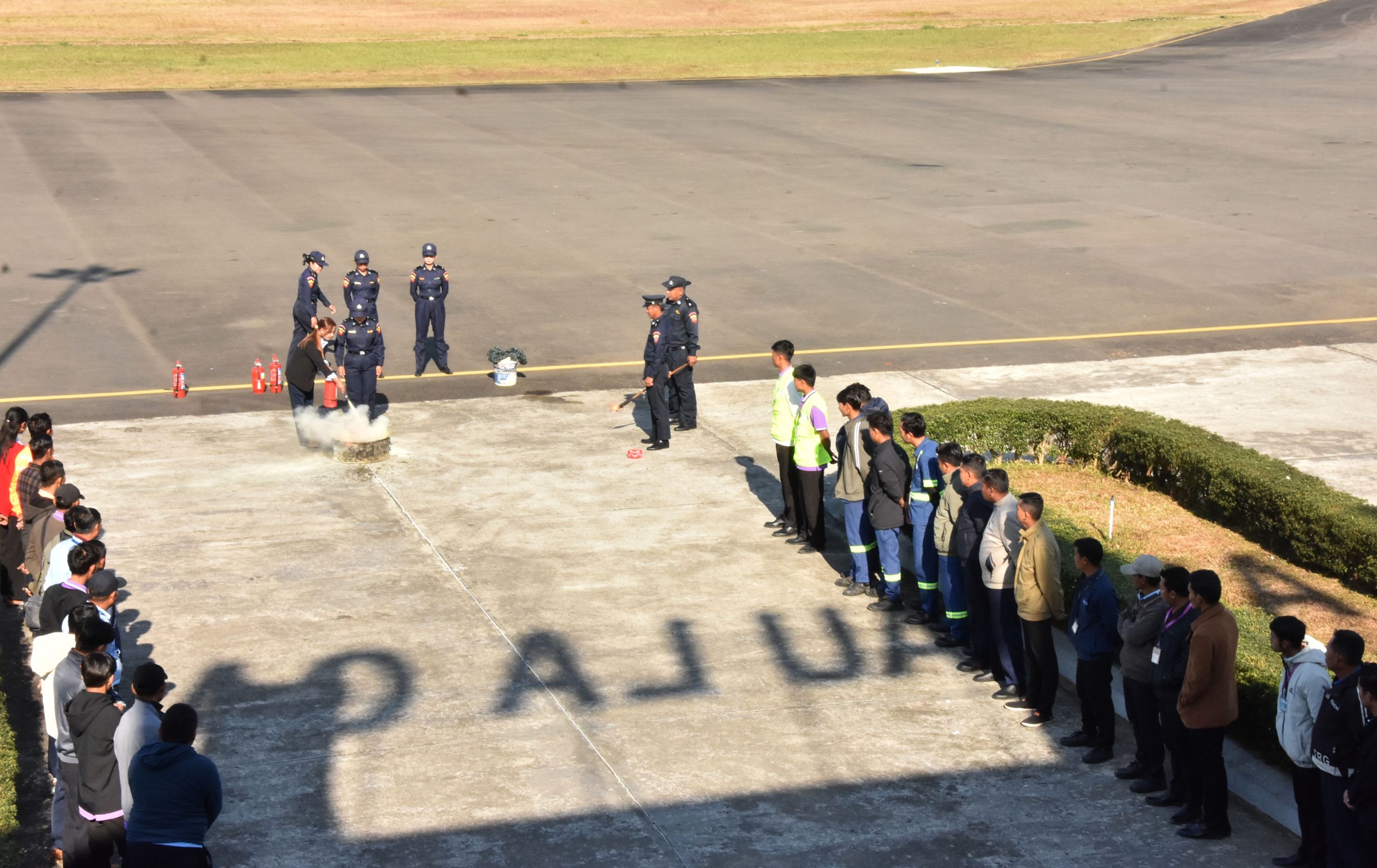 ဆက်လက်၍ ပြည်နယ်ဝန်ကြီးချုပ်၊ တိုင်းမှူး၊ ပြည်နယ်အစိုးရအဖွဲ့ဝင်များက မီးသတ်တပ်ဖွဲ့ ဝင်များက ဦးဆောင်၍ လေဆိပ်အတွင်း လေဆိပ်မီးဘေးလုံခြုံရေးစီမံချက်ပါ ဝန်ထမ်းများအား အရေးပေါ် မီးသတ်ဆေးဗူးများ အသုံးပြု၍ လက်တွေ့ မီးငြှိမ်းသတ်ခြင်းလုပ်ငန်းအား သရုပ်ပြဇာတ်တိုက်လေ့ကျင့်မှု အစီအစဉ်များနှင့် လေဆိပ်မီးသတ်တပ်ဖွဲ့နှင့် မြို့နယ်မီးသတ်တပ်ဖွဲ့တို့ ပူးပေါင်း၍ မီးဘေးလုံခြုံရေးစီမံချက်ပါအတိုင်း လေယာဉ်မီးလောင်မှုအား မီးသတ်ယာဉ်များနှင့်အတူ အသက်ရှုကိရိယာပါ ဝတ်စုံများဝတ်ဆင်၍ မီးခိုးအန္တရာယ်နှင့် အပူရှိန်မြင့်မားမှုကြားမှ မီးအတန်းအစားမျိုးစုံ အသုံးပြုနိုင်သည့် အမြုပ်ဆေးရည် အသုံးပြု၍ လက်တွေ့သရုပ်ပြ ဇာတ်လိုက်လေ့ကျင့်မှု အစီအစဉ်များအား ကြည့်ရှုအားပေးခဲ့ကြပြီး ပြည်နယ်ဝန်ကြီးချုပ်နှင့် တိုင်းမှူးတို့က သရုပ်ပြသခဲ့ကြသည့် မီးသတ်တပ်ဖွဲ့ဝင်များနှင့် လေဆိပ်ဝန်ထမ်းများအား ဂုဏ်ပြုချီးမြှင့်ငွေများကို ပေးအပ်ခဲ့ ကြသည်။