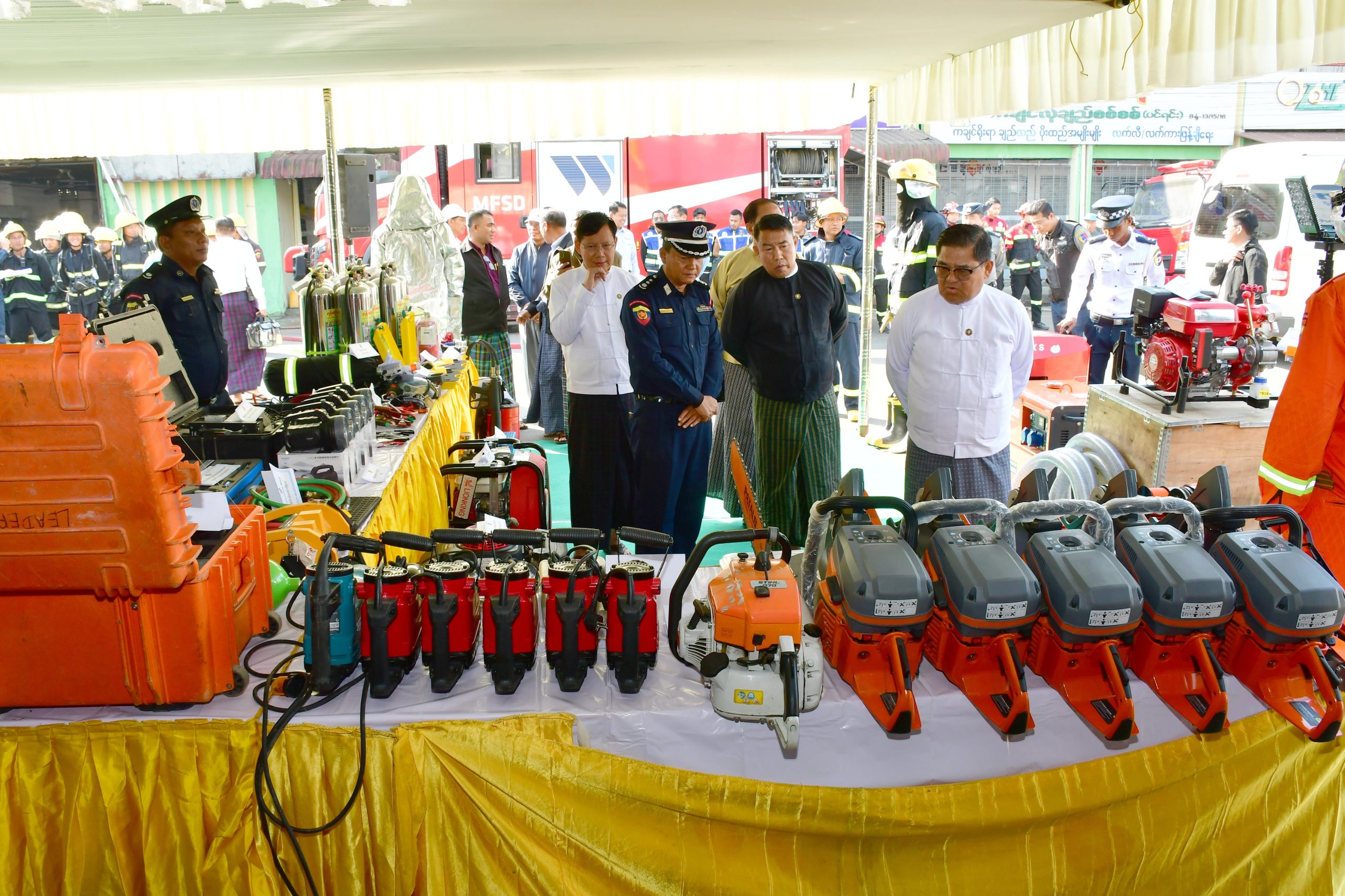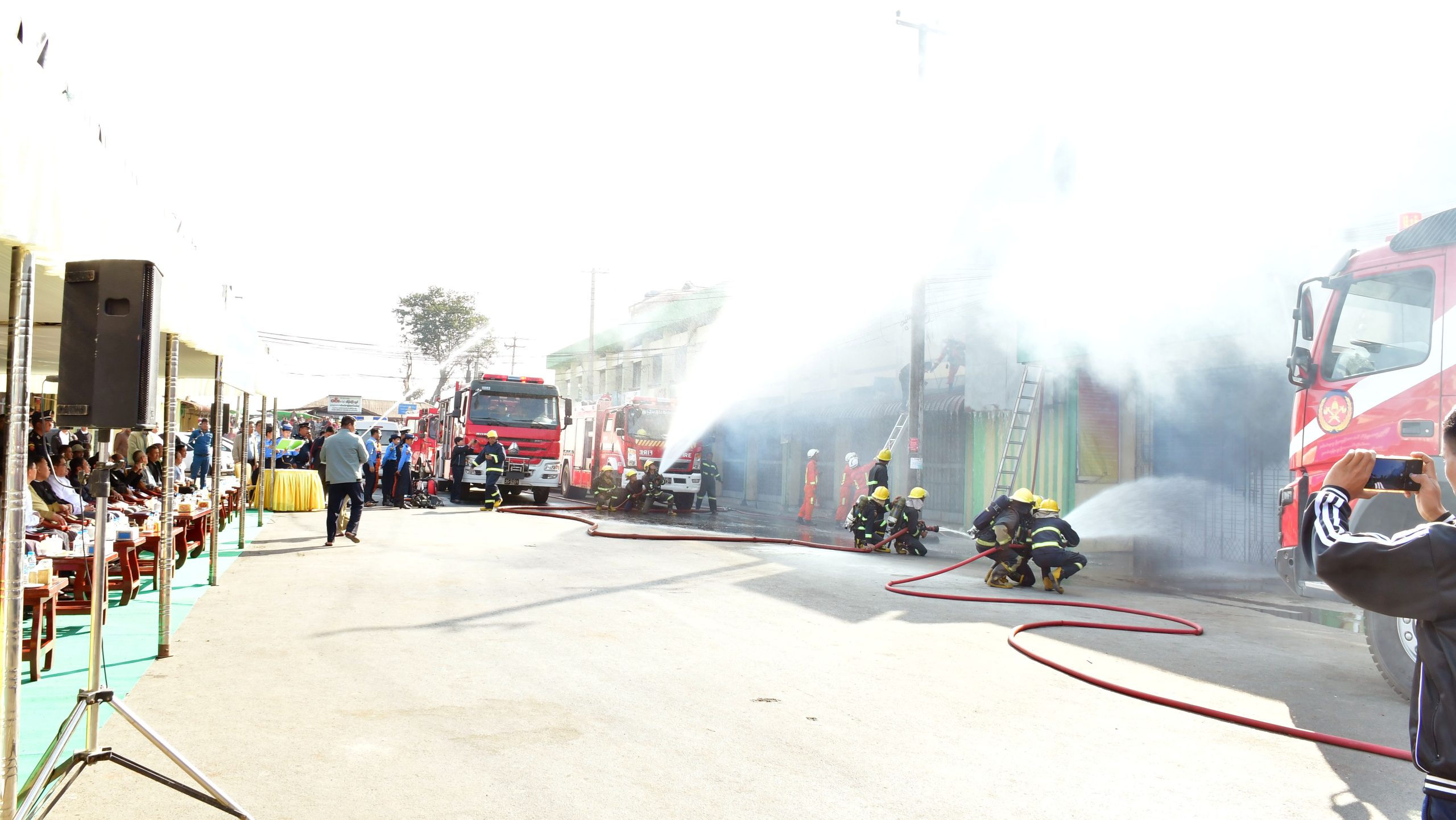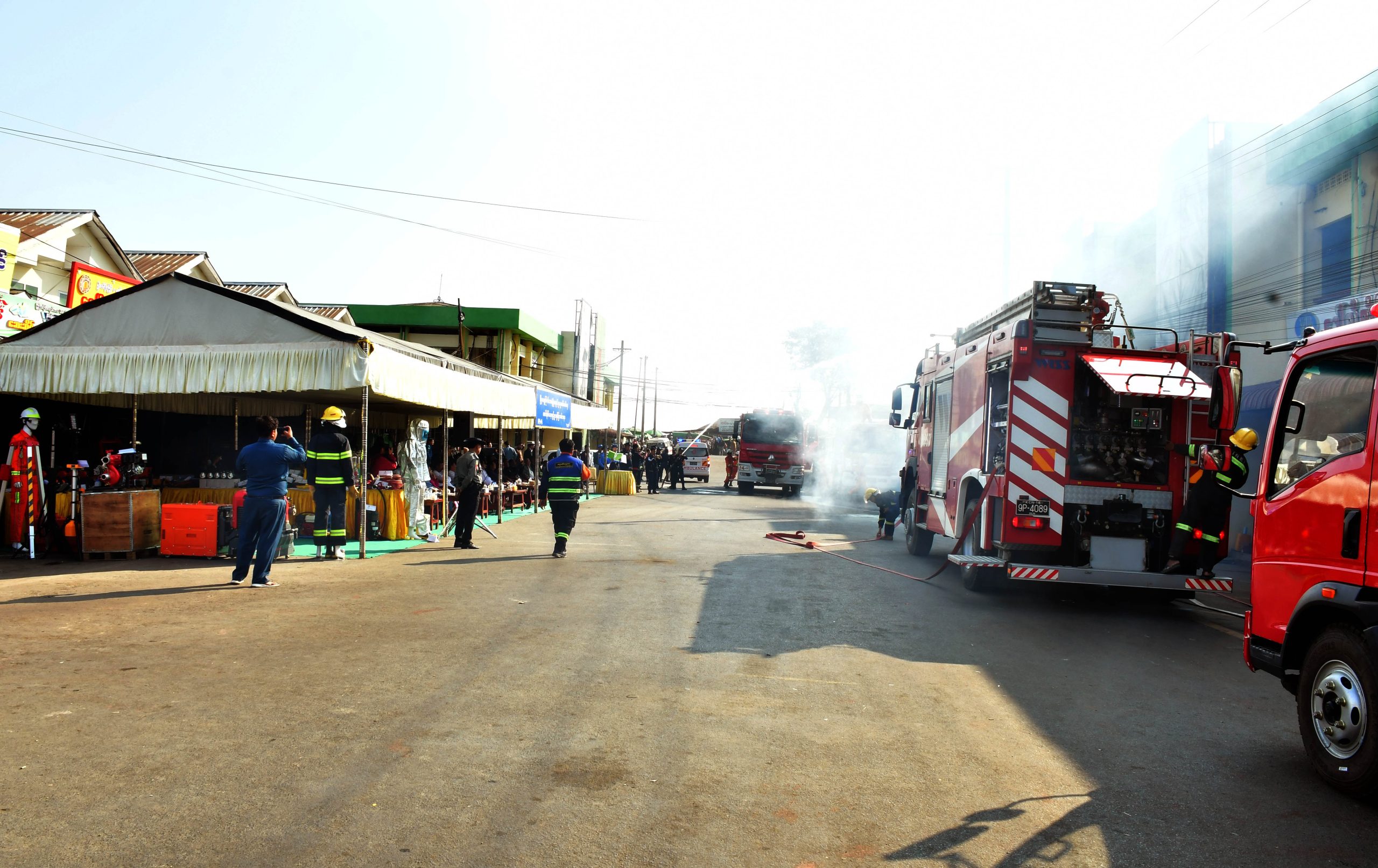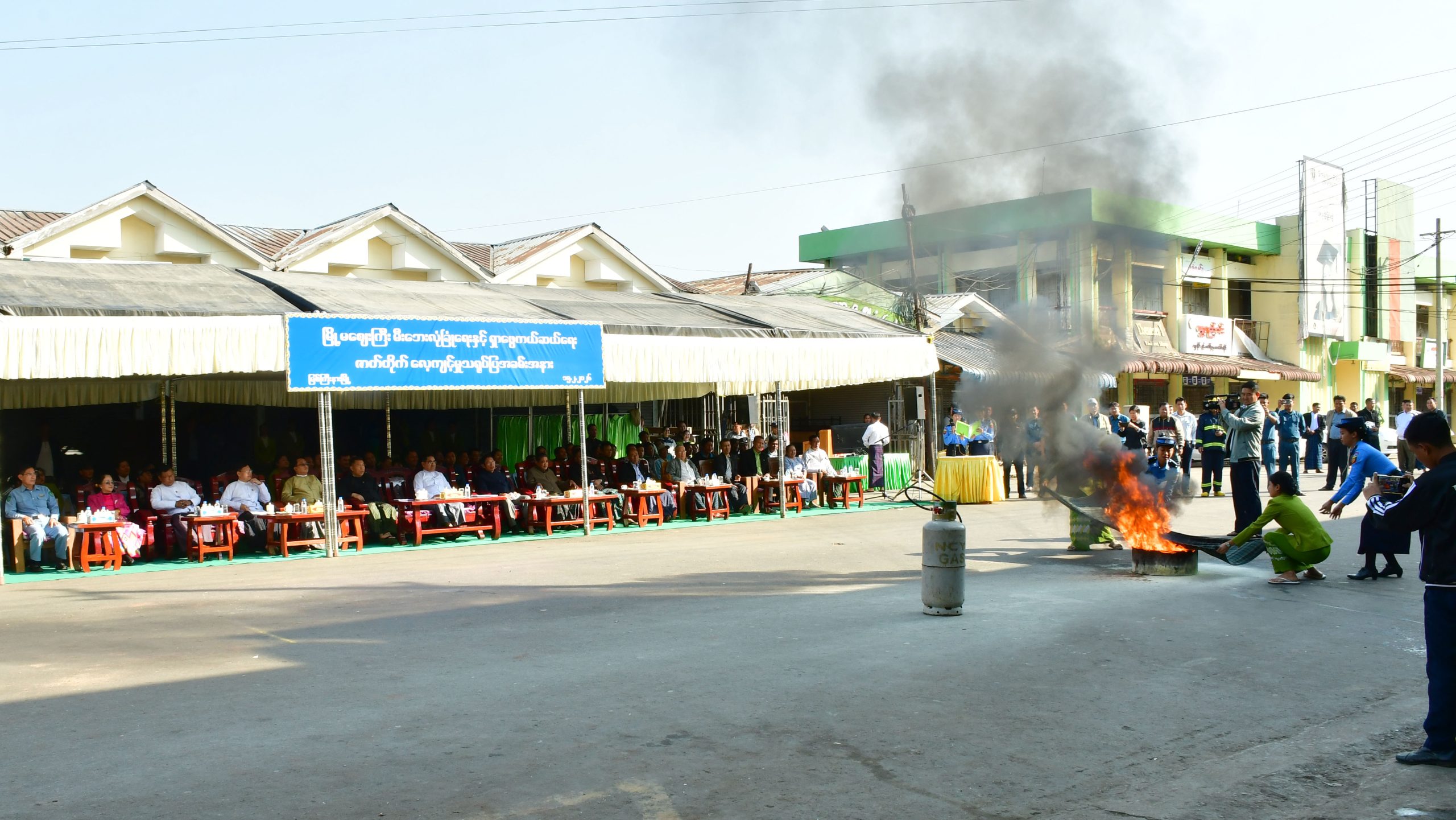 ထို့နောက် မီးသတ်ဦးစီးဌာနတပ်ဖွဲ့ဝင်များက စည်ပင်သာယာရေးအဖွဲ့ဝန်ထမ်းများအား မီးသတ်ဆေးဘူးဖြင့် လက်တွေ့မီးငြှိမ်းသတ်ခြင်း၊ ဆီမီးလောင်မှုအားဖုံးအုပ်ငြှိမ်းသတ်ခြင်းနှင့် ဂက်(စ်) မီးလောင်မှုအား မီးငြှိမ်းသတ်ခြင်းတို့ကို သရုပ်ပြခြင်းနှင့် လက်တွေ့မီးငြှိမ်းသတ်ခြင်းလုပ်ငန်းများ ပူးပေါင်းဆောင်ရွက်ခဲ့ကြပြီး အမှတ်(၁) မီးလောင်မှုအား ခေတ်မီရှာဖွေကယ်ဆယ်ရေးပစ္စည်းများ အသုံးပြု၍ မီးငြှိမ်းသတ်ကားများဖြင့် မီးငြှိမ်းသတ်ခြင်း၊ ရှာဖွေကယ်ဆယ်ရေးလုပ်ငန်းများ ဆောင်ရွက်ခြင်းတို့ကို လက်တွေ့ဇာတ်တိုက် သရုပ်ပြသမှုကို ကြည့်ရှုအားပေးခဲ့ကြပြီး ပြည်နယ်ဝန်ကြီးချုပ်က မီးသတ်တပ်ဖွဲ့ဝင်များအား ကြိုတင်ကာကွယ်ခြင်း၊ ဖြစ်စဉ်ကို ကြိုတင်ဇာတ်တိုက်လေ့ကျင့်ထားခြင်းသည် ထိရောက်သော လုပ်ငန်းစဉ်ဖြစ်ပြီး ဝန်ထမ်းများနှင့် ဈေးသူ/ ဈေးသားများ ပူးပေါင်းပါဝင်ရန် လိုအပ်ကြောင်း ဂုဏ်ပြုပြောကြားပြီး မီးသတ်တပ်ဖွဲ့ဝင်များအတွက် ငွေကျပ် ၁၅ သိန်းနှင့် စည်ပင်သာယာရေးအဖွဲ့ဝန်ထမ်းများအတွက် ငွေကျပ် ၁၀ သိန်းကို ထောက်ပံ့ပေးအပ်ခဲ့သည်။