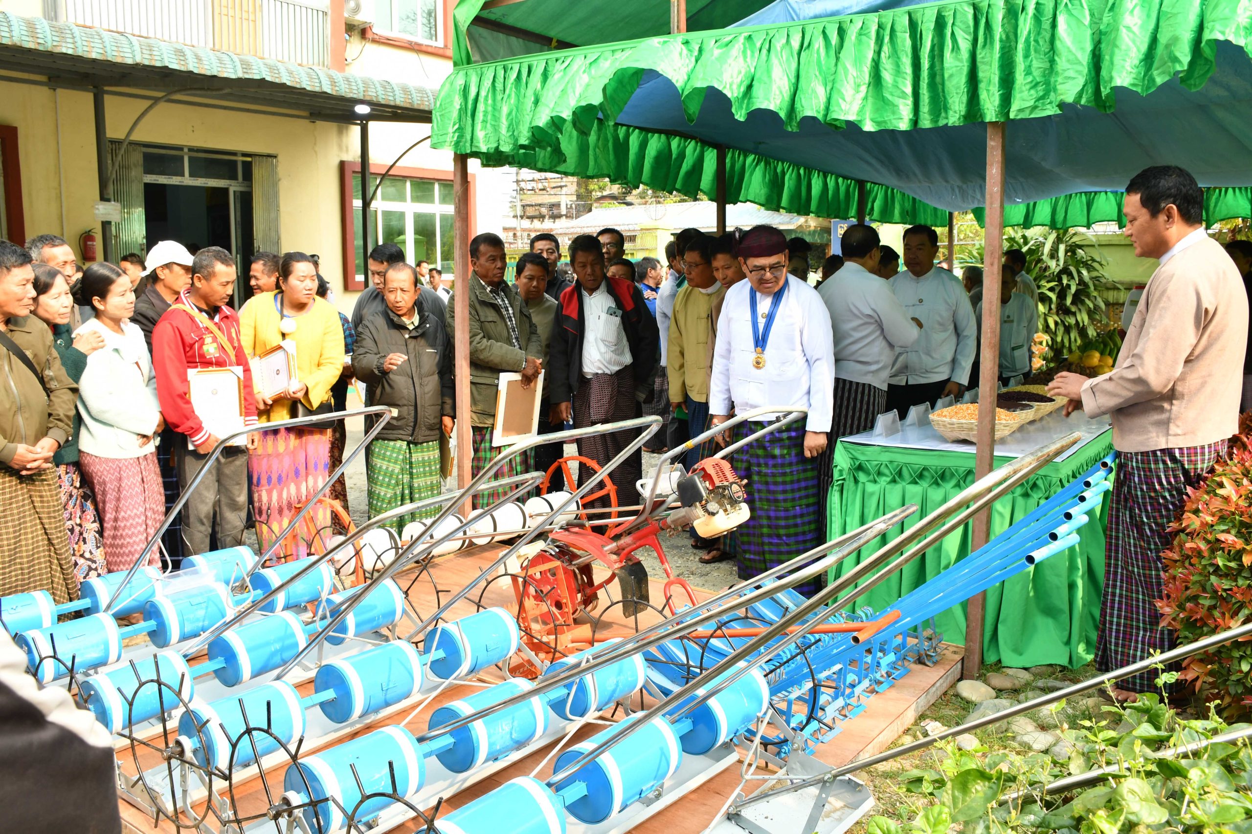 ထို့နောက် ပြည်နယ်ဝန်ကြီးချုပ်နှင့် ပြည်နယ်အစိုးရအဖွဲ့ဝင်များ၊ တောင်သူများက စိုက်ပျိုးရေးရုံးအတွင်း ပြသထားသည့် စိုက်ပျိုးရေးလုပ်ငန်း အထောက်အကူပြုပစ္စည်းများနှင့် ရွက်ဖျန်းအားဆေးများ၊ ဒေသတွင်း အထွက်တိုးသည့် သီးနှံမျိုးစေ့များ၊ အစေ့ချစက်များ ခင်းကျင်းပြသထားရှိမှုများအား ကြည့်ရှုအားပေးခဲ့ကြကြောင်း သိရသည်။