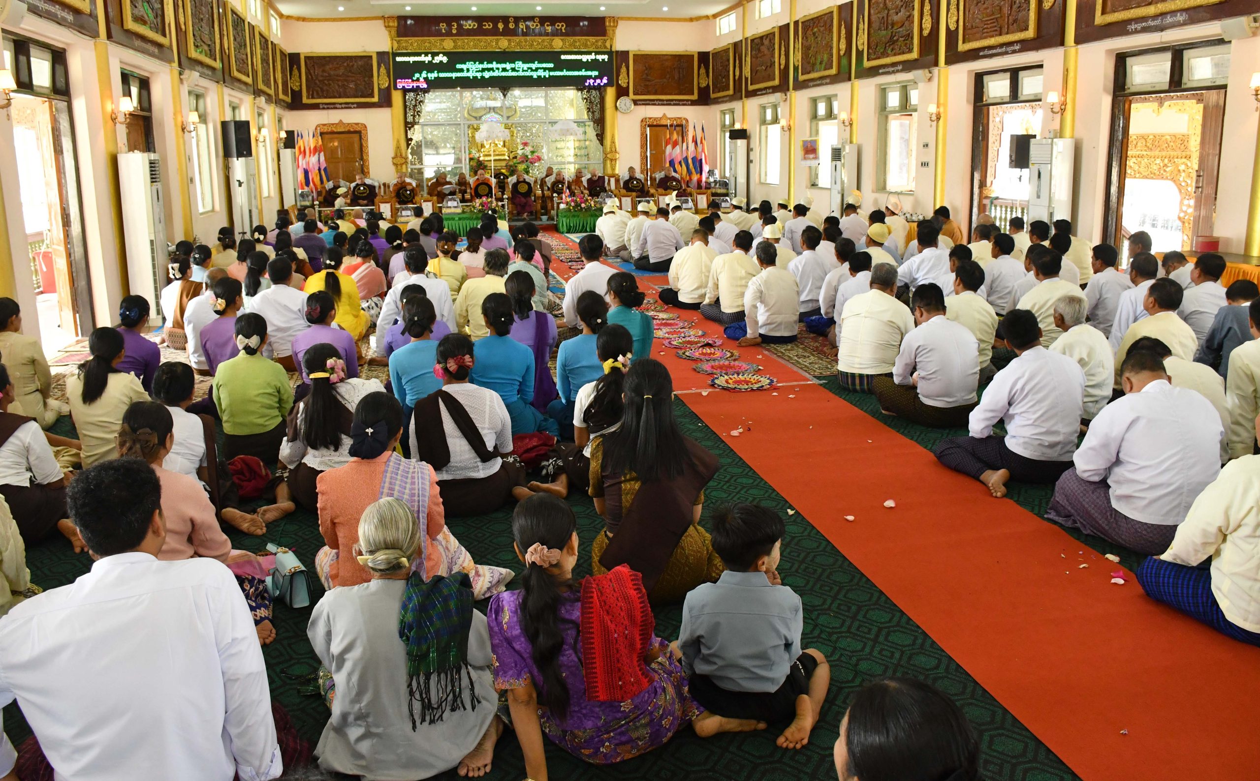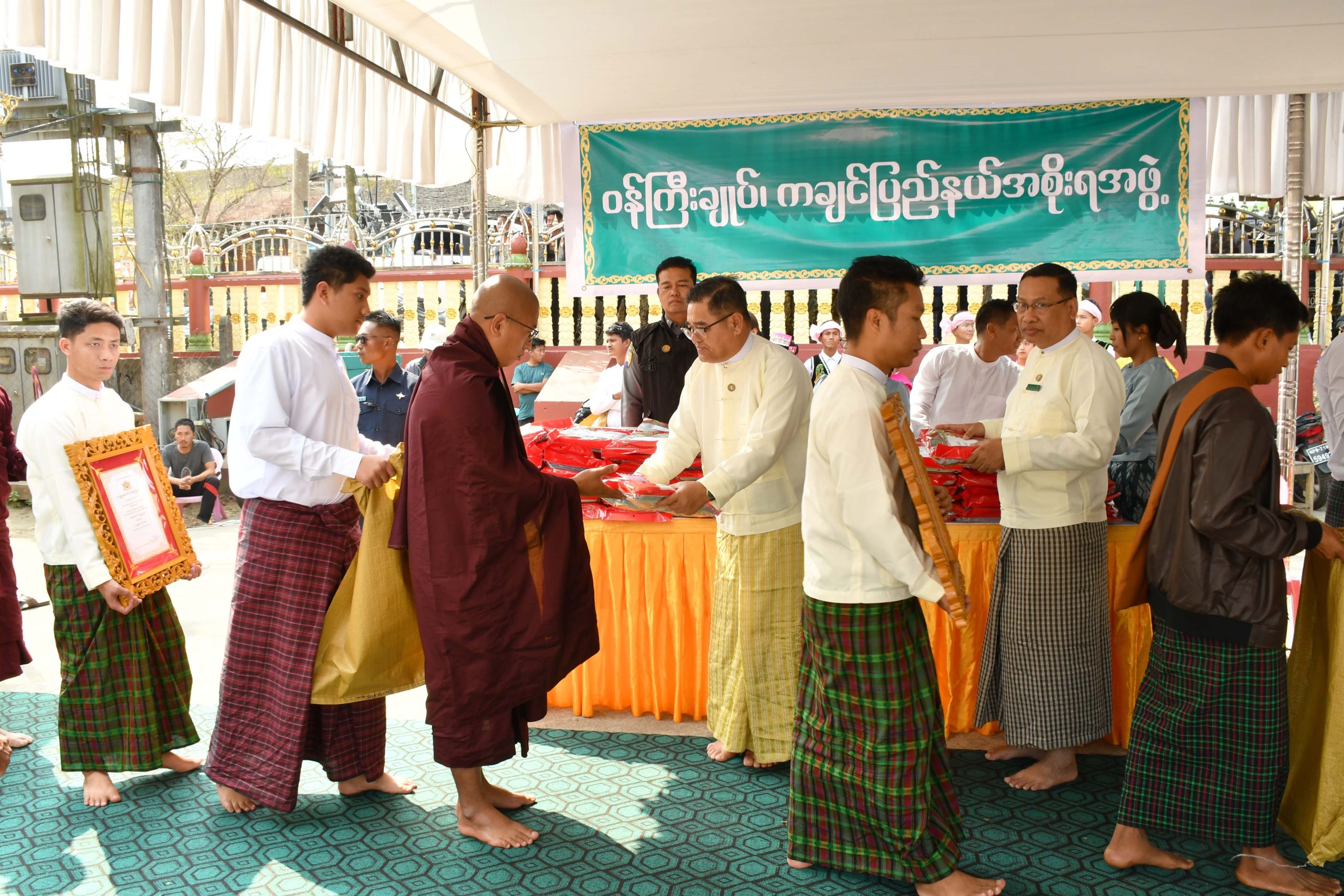 ထို့နောက် ပြည်နယ်ဝန်ကြီးချုပ်၊ တိုင်းမှူးနှင့် ဇနီး၊ တပ်မတော်အရာရှိကြီးများ၊ ပြည်နယ်အစိုးရအဖွဲ့ဝင် ဝန်ကြီးများက ပင့်သံဃာတော်မထေရ်မြတ်ကြီးများအား လှူဖွယ်ပစ္စည်းများနှင့် မဟာသဒ္ဒမ္မဇောတိကဓဇဘွဲ့ရ သံဃာတော် ၃ ပါး၊ ဂန္တဝါစကပဏ္ဍိတဘွဲ့ရ သံဃာတော် ၁ ပါး၊ သဒ္ဓမ္မဇောတိကဓဇဘွဲ့ရ သံဃာတော် ၄ ပါးနှင့် မဟာသဒ္ဓမ္မဇောတိကဓဇနှင့် ဂန္တဝါစကပဏ္ဍိတဘွဲ့ရ သီလရှင်ဆရာကြီးများအား လှူဖွယ်ပစ္စည်းများနှင့် ဘွဲ့တံဆိပ်အဆောင်အယောင်များကို အသီးသီးဆက်ကပ်လှူဒါန်းခဲ့ကြသည်။