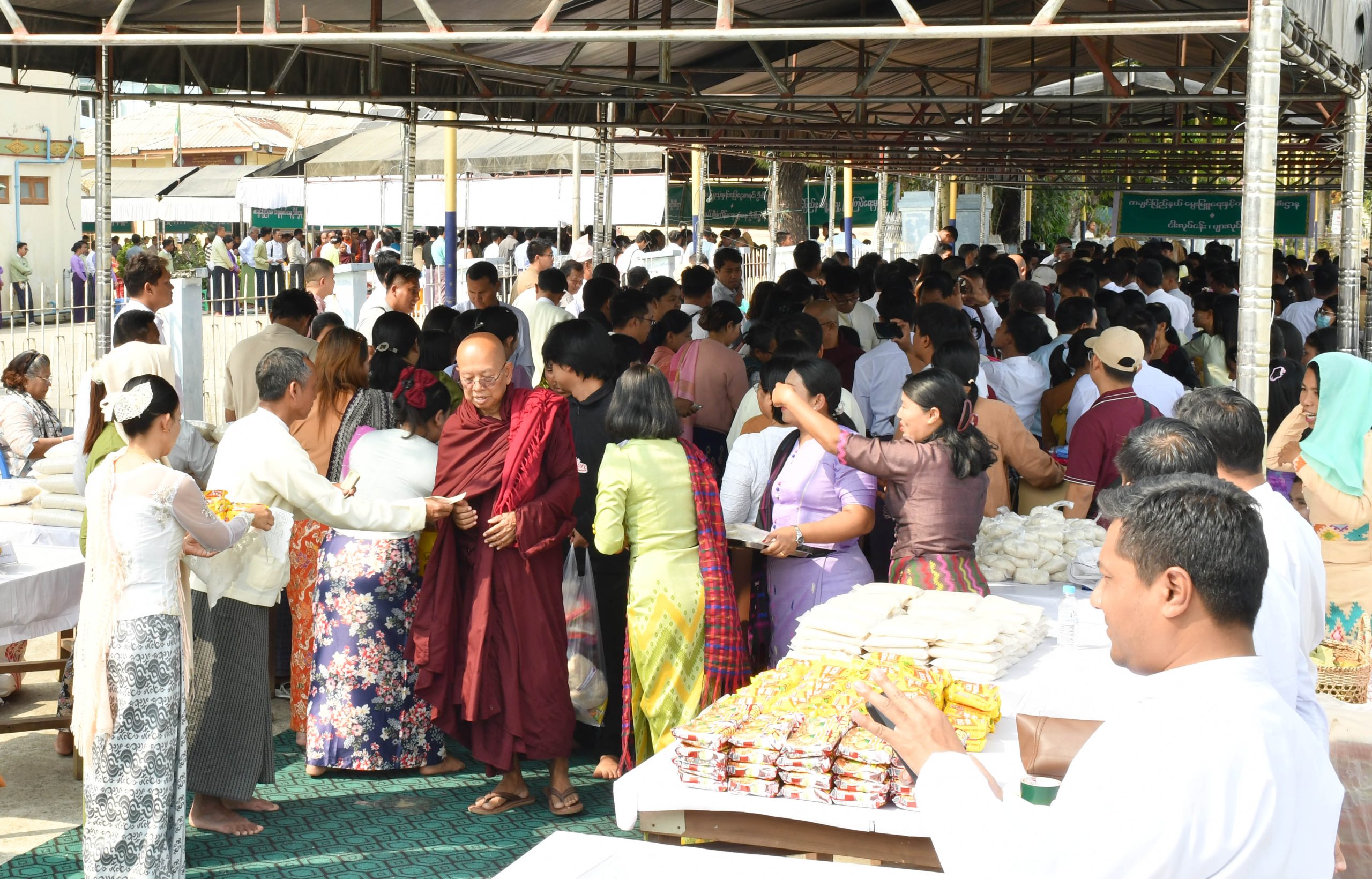 ယင်းနောက် ဆွမ်းဆန်စိမ်းလောင်းလှူပူဇော်ပွဲအခမ်းအနားကို ဆက်လက်ကျင်းပပြုလုပ်ရာ သာသနာ့ဗိမ္မာန်တော်ဝင်းအတွင်းနှင့် ကမ်းနားလမ်းတစ်လျှောက် ပြည်နယ်ဝန်ကြီးချုပ်၊ တိုင်းမှူးနှင့် တပ်မတော်အရာရှိကြီးများ၊ ပြည်နယ်အစိုးရအဖွဲ့ဝင်များ၊ ပြည်နယ်အဆင့်ဌာနဆိုင်ရာများက သတ်မှတ်နေရာအသီးသီးမှ ဘုရားအမှူးပြုသော ဘွဲ့ခံသံဃာတော်များနှင့် ပင့်သံဃာမထေရ်မြတ်ကြီးများ၊ စာအောင်သံဃာတော်များနှင့် သာမဏေများ၊ သီလရှင်ဆရာကြီးများအား ဆွမ်းဆန်တော်၊ ဝတ္ထုငွေများနှင့် လှူဖွယ်ပစ္စည်းအမျိုးမျိုးတို့အား လောင်းလှူပူဇော်ခဲ့ကြကြောင်း သိရသည်။