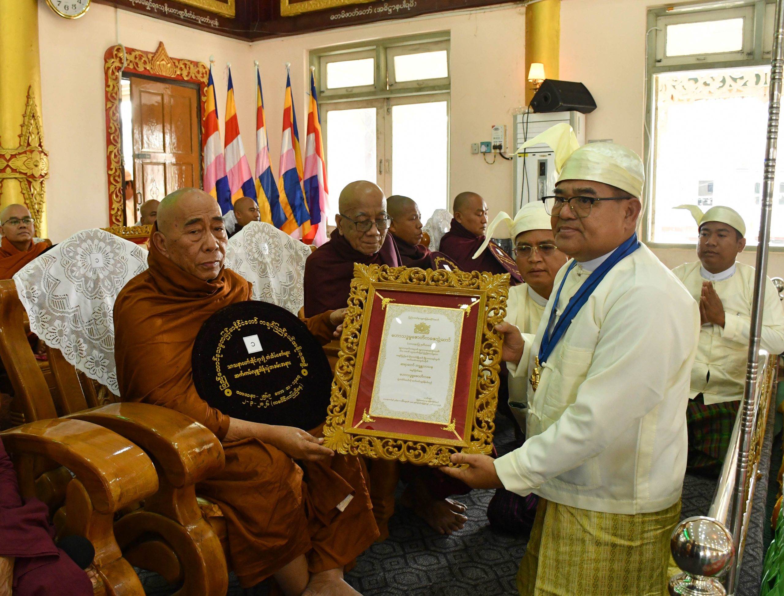 ထို့နောက် ပြည်နယ်ဝန်ကြီးချုပ်၊ တိုင်းမှူးနှင့် ဇနီး၊ တပ်မတော်အရာရှိကြီးများ၊ ပြည်နယ်အစိုးရအဖွဲ့ဝင် ဝန်ကြီးများက ပင့်သံဃာတော်မထေရ်မြတ်ကြီးများအား လှူဖွယ်ပစ္စည်းများနှင့် မဟာသဒ္ဒမ္မဇောတိကဓဇဘွဲ့ရ သံဃာတော် ၃ ပါး၊ ဂန္တဝါစကပဏ္ဍိတဘွဲ့ရ သံဃာတော် ၁ ပါး၊ သဒ္ဓမ္မဇောတိကဓဇဘွဲ့ရ သံဃာတော် ၄ ပါးနှင့် မဟာသဒ္ဓမ္မဇောတိကဓဇနှင့် ဂန္တဝါစကပဏ္ဍိတဘွဲ့ရ သီလရှင်ဆရာကြီးများအား လှူဖွယ်ပစ္စည်းများနှင့် ဘွဲ့တံဆိပ်အဆောင်အယောင်များကို အသီးသီးဆက်ကပ်လှူဒါန်းခဲ့ကြသည်။
