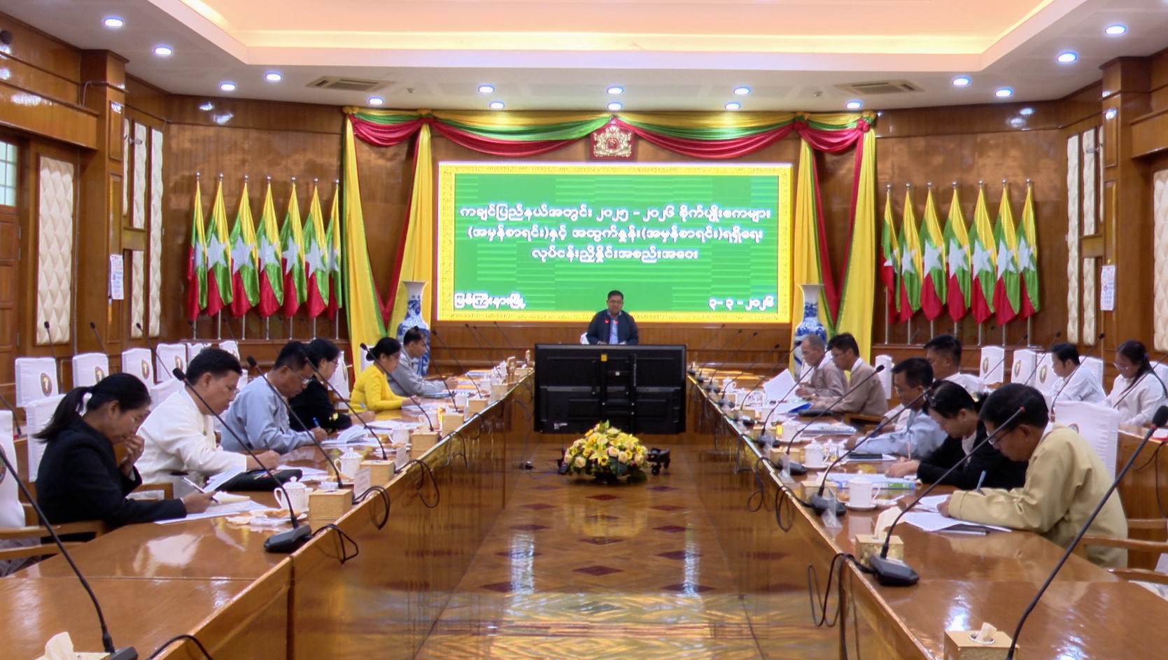 ရှေးဦးစွာ ပြည်ထောင်စုသမ္မတမြန်မာနိုင်ငံတော်၊ ယာယီသမ္မတ၊ နိုင်ငံတော်လုံခြုံရေးနှင့် အေး ချမ်းသာယာရေးကော်မရှင်ဥက္ကဋ္ဌ ဗိုလ်ချုပ်မှူးကြီး သတိုးမဟာသရေစည်သူ သတိုးသီရိသုဓမ္မ မင်းအောင်လှိုင်ထံမှ ပေးပို့လာသည့် သဝဏ်လွှာအား ပြည်နယ်ဝန်ကြီးချုပ် ဦးခက်ထိန်နန်က ဖတ်ကြားသည်။