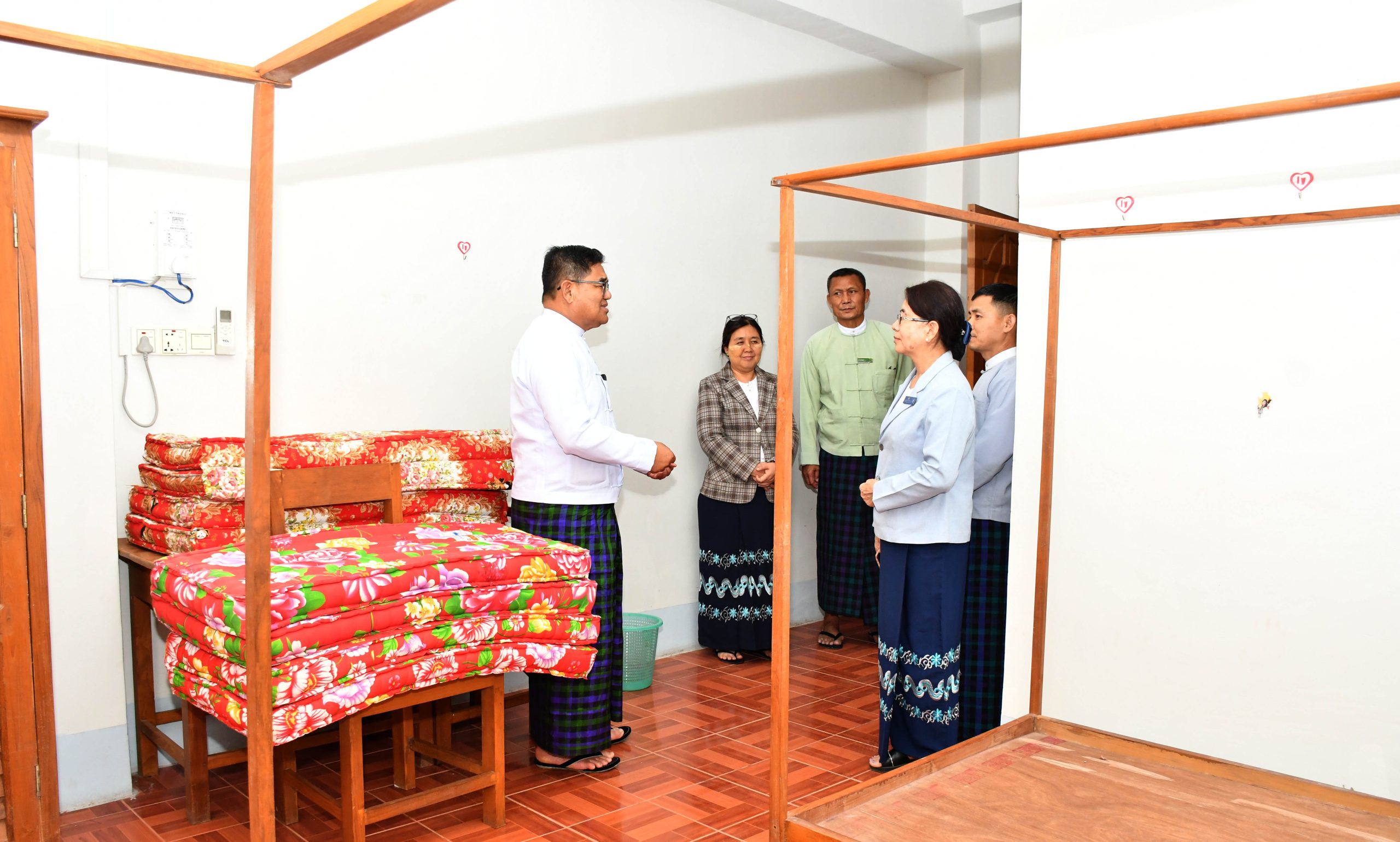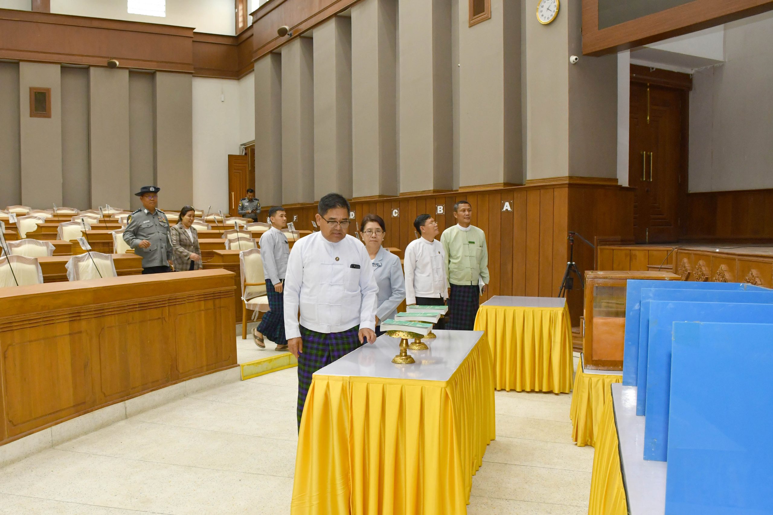 ထိုသို့ ကွင်းဆင်းစစ်ဆေးရာတွင် ပြည်နယ်လွှတ်တော်ရုံး ဒုတိယညွှန်ကြားရေးမှူးချုပ်၊ အရာထမ်း၊ အမှုထမ်းများနှင့်အတူ လွှတ်တော်ရုံးပတ်ဝန်းကျင် သန့်ရှင်းသာယာလှပရေး ပြုပြင်ဆောင်ရွက်နေမှုများနှင့် လွှတ်တော်အစည်းအဝေးခန်းမ၌ အသံပိုင်းဆိုင်ရာပြင်ဆင်ဆောင်ရွက်မှု၊ နေရာချထားမှုပုံစံများ၊ မှတ်တမ်းတင်နိုင်ရေး စီစဉ်ဆောင်ရွက်ထားရှိမှုများနှင့် ဆန္ဒမဲပေးနိုင်ရေး ကြိုတင်ပြင်ဆင်ဆောင်ရွက်ထားရှိမှုများနှင့် လွှတ်တော်ရုံးနှင့်ကပ်လျက် လွှတ်တော်ကိုယ်စားလှယ်များ တည်းခို နားနေဆောင်၌ လွှတ်တော်ကိုယ်စားလှယ်များ တည်းခိုနေထိုင်နိုင်ရေး ကြိုတင်ပြင်ဆင်ဆောင်ရွက်ထားရှိမှုများကို ကြည့်ရှုစစ်ဆေးခဲ့ကြပြီး လိုအပ်သည်များကို ပေါင်းစပ်ညှိနှိုင်း၍ ဖြည့်ဆည်းဆောင်ရွက်ပေးခဲ့သည်။