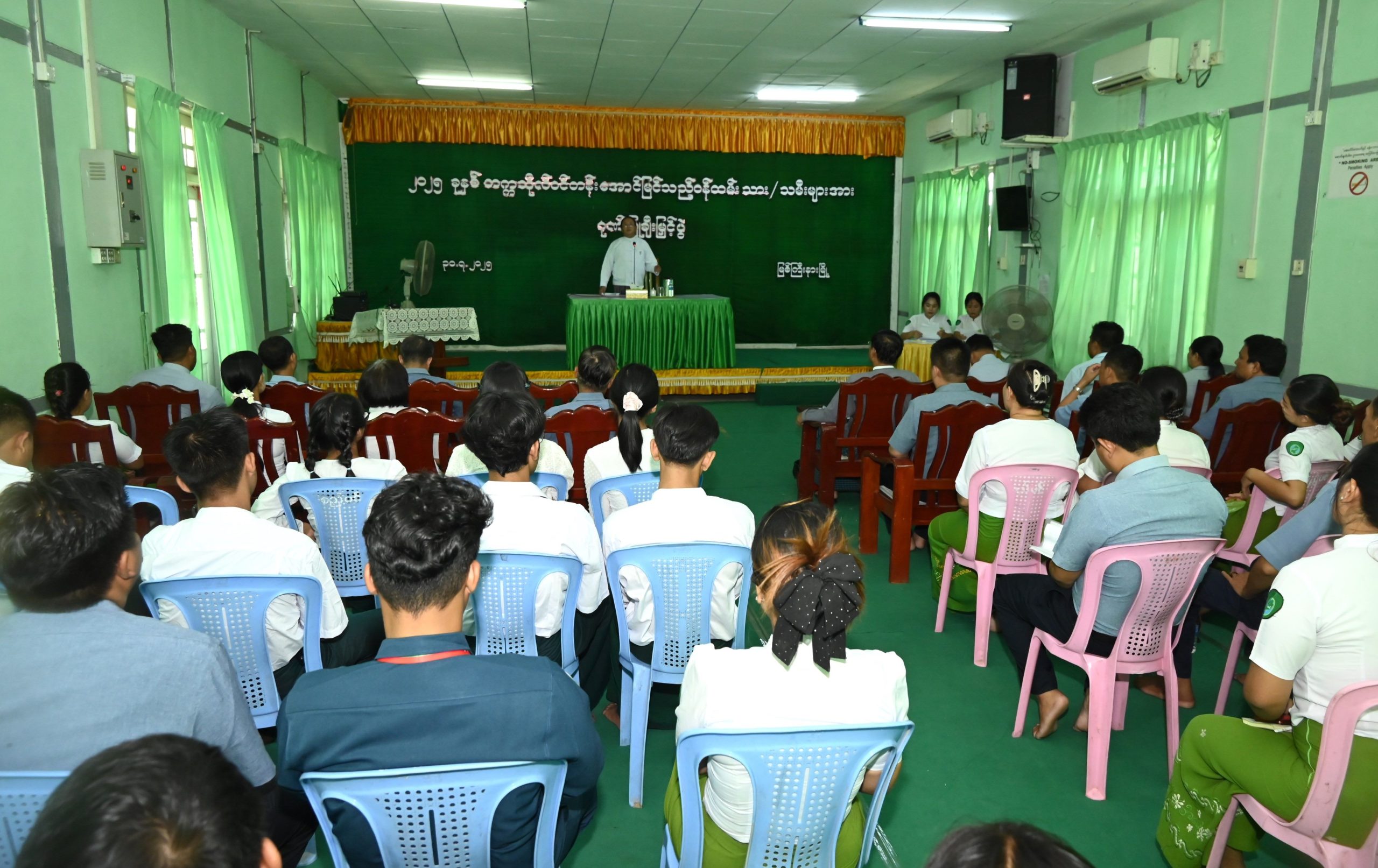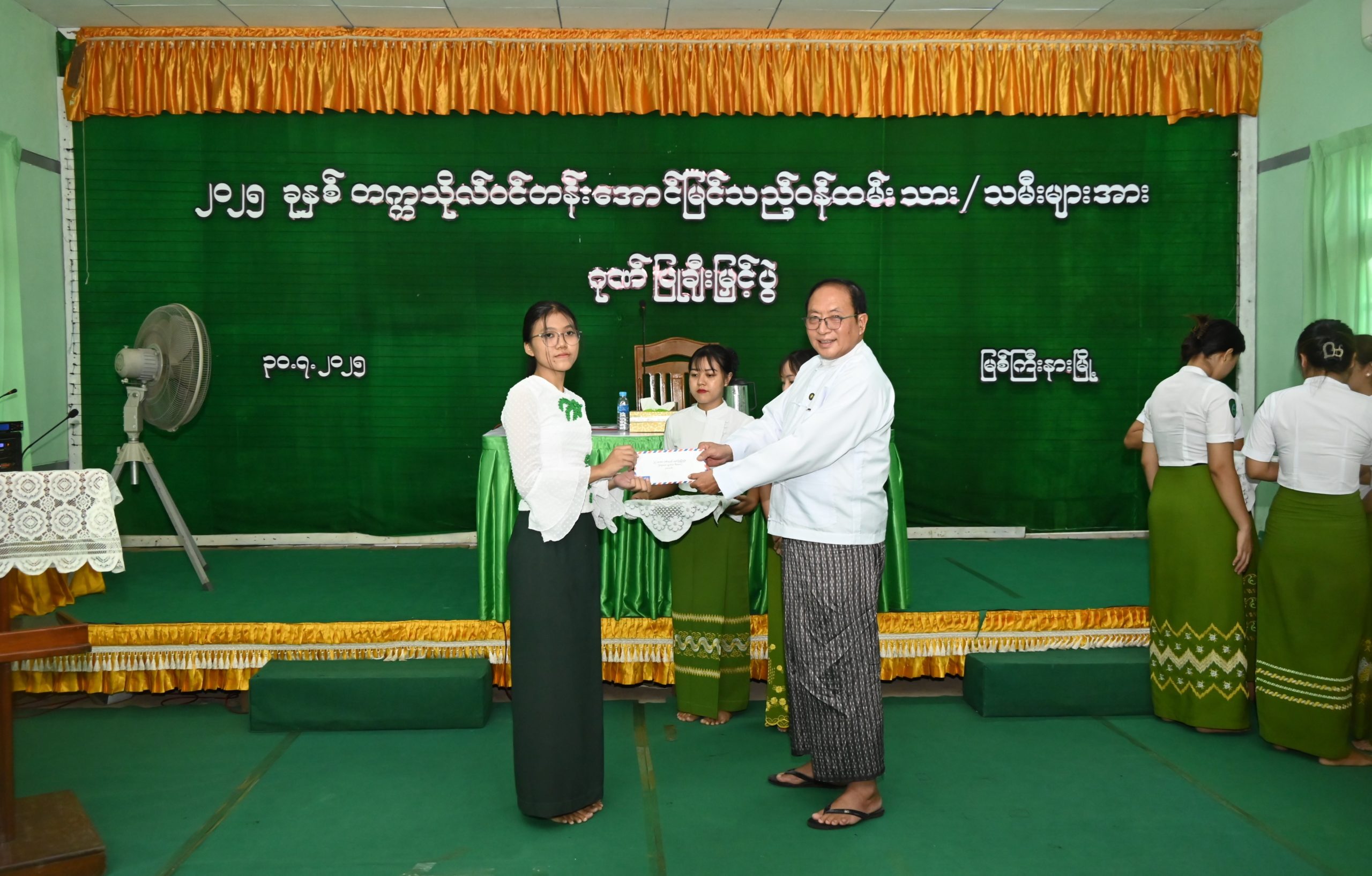 ကချင်ပြည်နယ်အတွင်းရှိ စည်ပင်သာယာရေးအဖွဲ့များမှ ၂၀၂၅ ခုနှစ်၊ တက္ကသိုလ်ဝင်တန်းအောင်မြင်ခဲ့ကြသော ဝန်ထမ်းသား/ သမီး ကျောင်းသား/ ကျောင်းသူများ ဂုဏ်ပြုချီးမြှင့်ပွဲ အခမ်းအနားကို ဇူလိုင် ၃၁ ရက် မွန်းလွဲ ၁ နာရီခွဲက မြို့နယ်စည်ပင်သာယာရေးအဖွဲ့ရုံး အစည်းအဝေးခန်းမ၌ကျင်းပပြုလုပ်ရာ ပြည်နယ်အစိုးရအဖွဲ့ဝင် သယံဇာတရေးရာဝန်ကြီး ဦးတိန့်ဆောင် တက်ရောက်အားပေးချီးမြှင့်သည်။