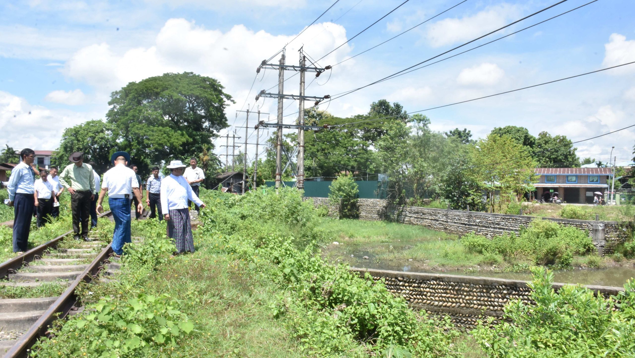ထို့နောက် ပြည်နယ်ဝန်ကြီးနှင့် တာဝန်ရှိသူများသည် မြစ်ကြီးနားမြို့ မြို့သစ်ကြီးရပ်ကွက် နယ်မြေ ၁၅ နှင့် ရန်ကြီးအောင်ရပ်ကွက်ကြား၌ သံလမ်းကူးနေရာမှလည်းကောင်း၊ ဂျာမိုင်ကောင်းနှင့်ဒူကထောင်ရပ်ကွက် သံလမ်းကူးနေရာ၌ လည်းကောင်း သံလမ်းတစ်လျှောက်လှည့်လည်ကြည့်ရှုစစ်ဆေးခဲ့ကြပြီး ရန်ကြီးအောင်ရပ်ကွက်ဘက်ခြမ်းရှိ မြေလွတ်နေရာအား တိုင်းထွာ၍ လူသွားလမ်း ဆောင်ရွက်နိုင်ရေးနှင့် ရေဝပ်မှုမရှိစေရေးအတွက် ရေနှုတ်မြောင်း စနစ်တကျ ဆောင်ရွက်နိုင်ရေး၊ ဒူကထောင်ရပ်ကွက်အတွင်း ရေနှုတ်မြောင်းနေရာ၌ မီးရထားသံလမ်းရေကျော်တံတားအား စနစ်တကျ ပြန်လည်တည်ဆောက်နိုင်ရေးနှင့် ရေနှုတ်မြောင်းအားစနစ်တကျ ပြန်လည်တူးဖော်နိုင်ရေး ညှိနှိုင်းဆွေးနွေးဆောင်ရွက်ခဲ့ကြကာ ပြည်နယ်ဝန်ကြီးက မြို့ဧရိယာအတွင်း မီးရထားသံလမ်းတစ် လျှောက် သန့်ရှင်းသပ်ရပ်မှုရှိစေရေး ရေရှည်ကို မျှော် တွေးစဉ်းစားပြီး စီမံဆောင်ရွက်သွားရမည်ဖြစ်ကြောင်းနှင့် အရိပ်ရပန်းပွင့်သည့် အပင်များစနစ်တကျ စိုက်ပျိုးနိုင်ရေး ပေါင်းစပ်ဆောင်ရွက်ပေးသည်။