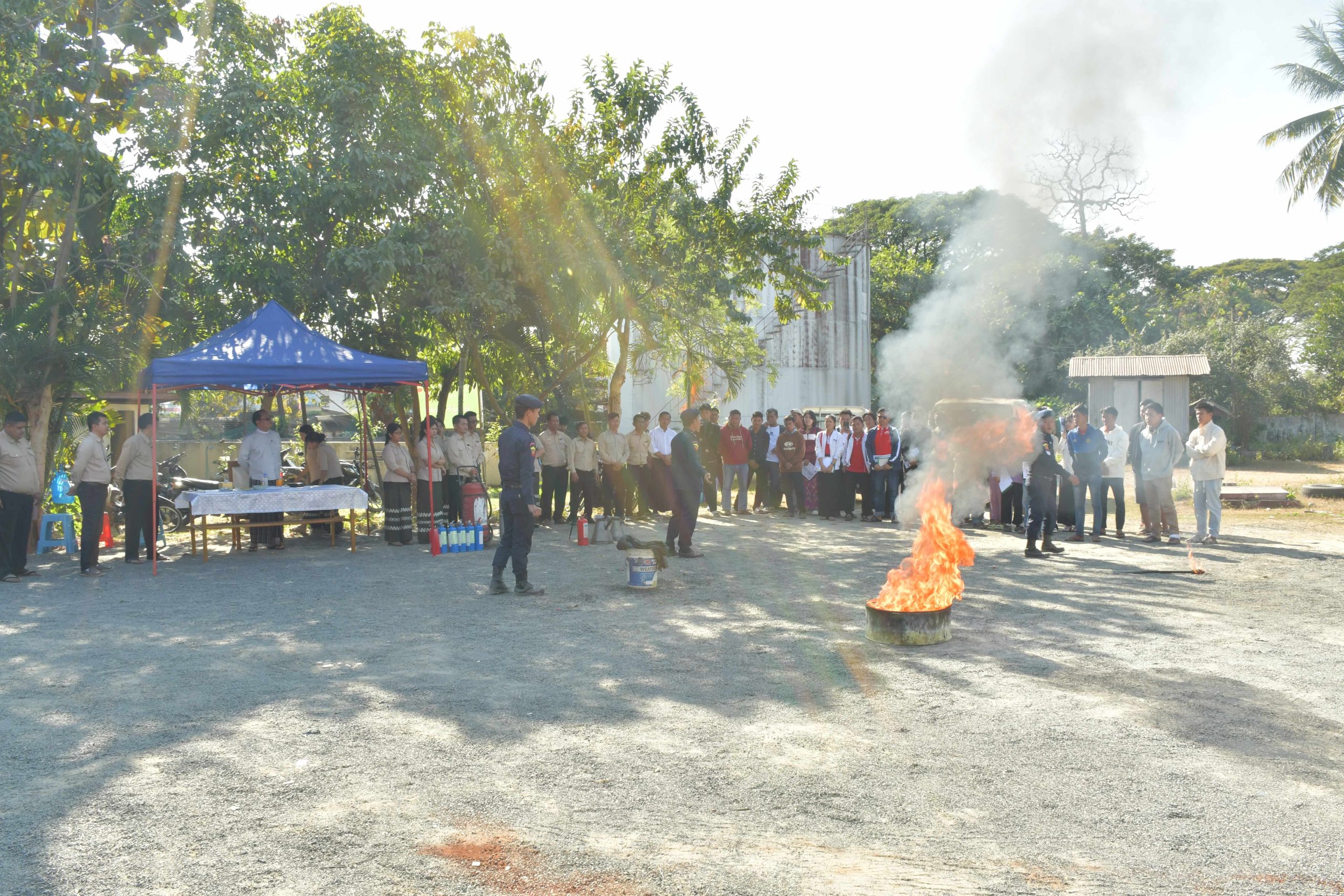 ဆက်လက်၍ အဆိုပါ ရုံးဝင်းအတွင်း သင်တန်းများအား စက်သုံးဆီကိုင်တွယ်ထိန်းသိမ်းနည်းအပြင် မီးဘေးအန္တရာယ်အတွက် ကြိုတင်ဆောင်ရွက်ရမည့် လုပ်ငန်းစဉ်များကို သိရှိနားလည်စေရန် ပြည်နယ်မီးသတ်ဦးစီးဌာနက မီးဘေးအန္တရာယ်အသိပညာပေးခြင်းနှင့် လက်တွေ့မီးငြိမ်းသတ်နည်း များဖြင့် သရုပ်ပြအသိပညာပေးမှုအား ကြည့်ရှုအားပေးခဲ့ကြသည်။