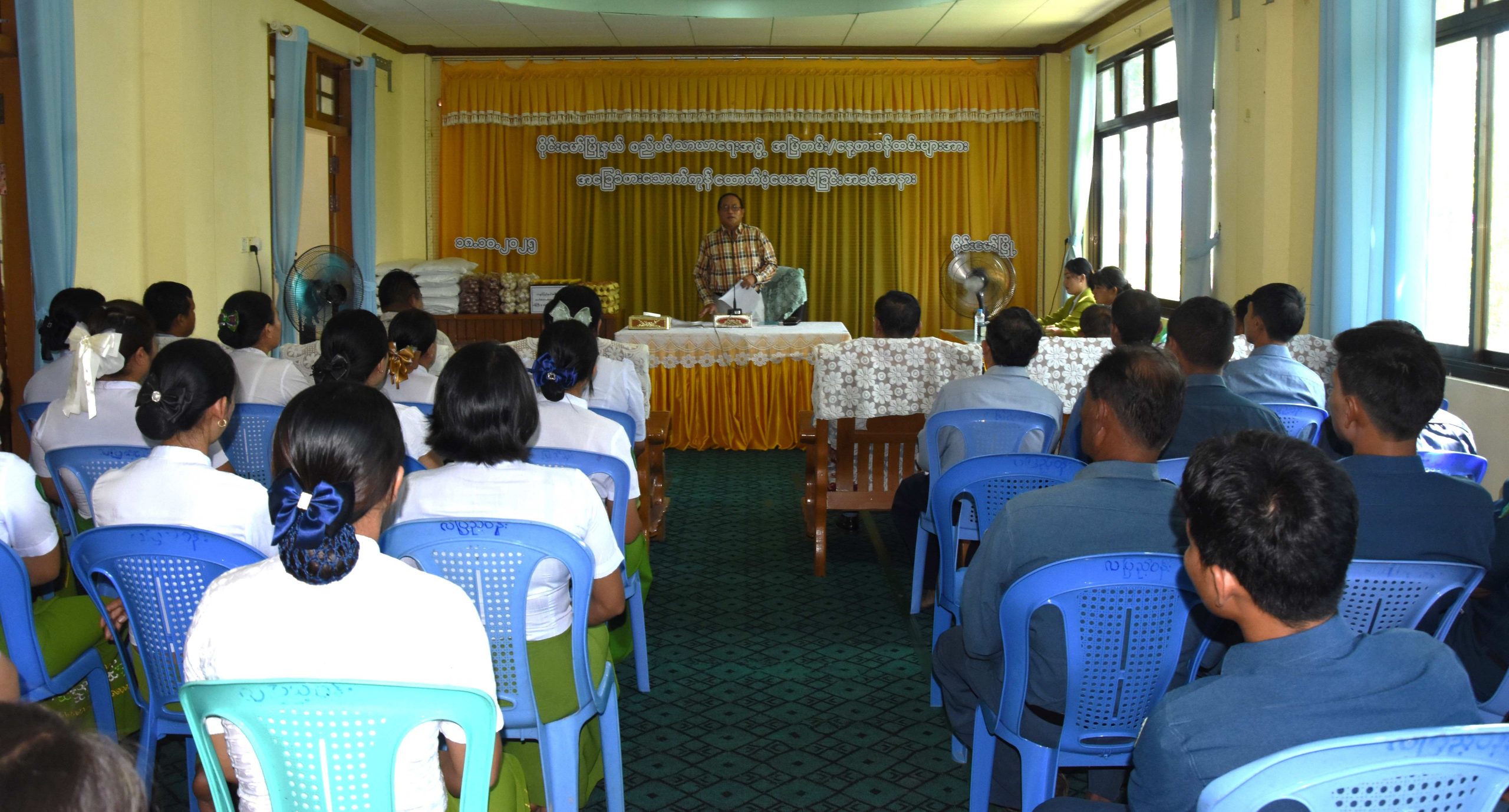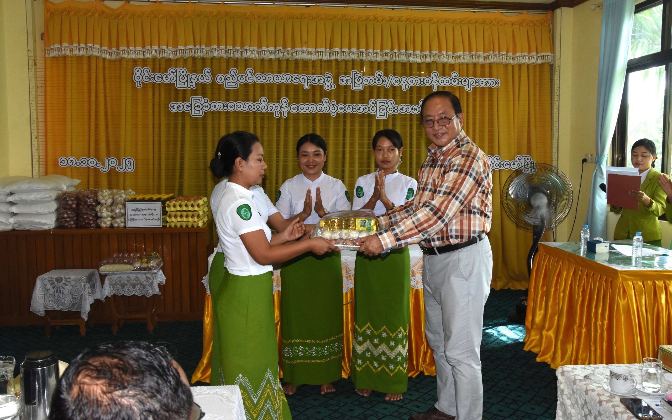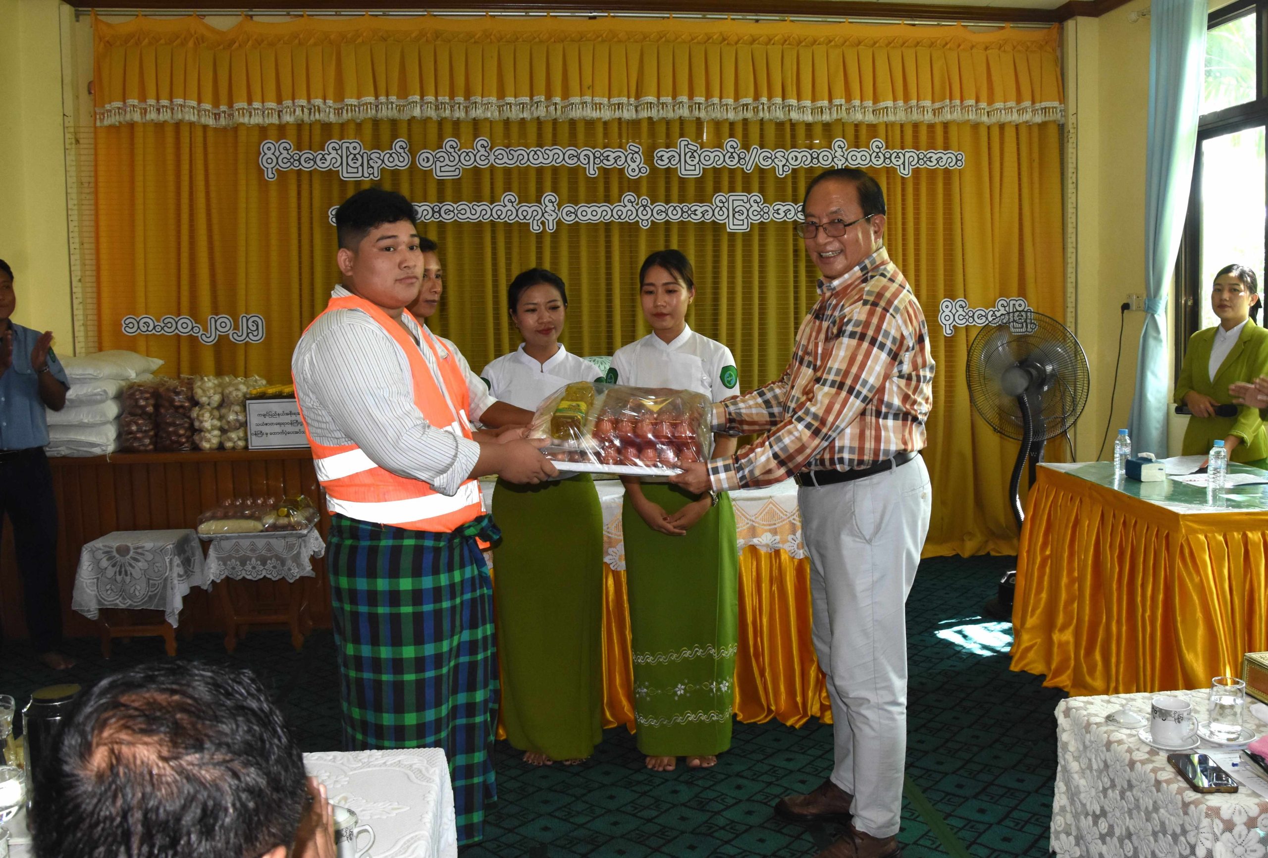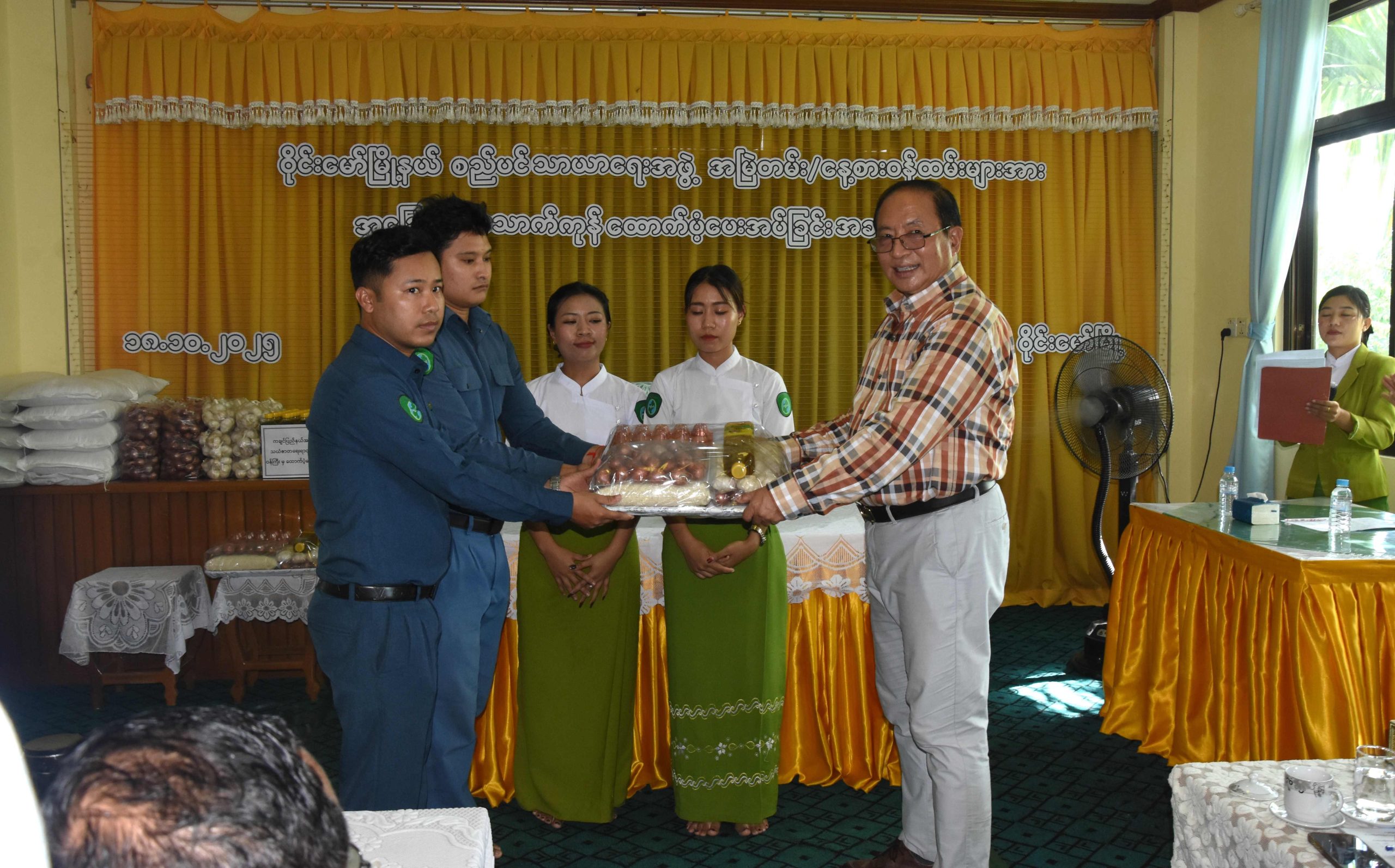 ထို့နောက် ပြည်နယ်စည်ပင်သာယာရေးအဖွဲ့ ညွှန်ကြားရေးမှူး ဦးကျော်လင်းက ဝန်ထမ်းများအား အခြေခံစားသောက်ကုန်ပစ္စည်းများ ထောက်ပံ့ပေးအပ်ရခြင်းနှင့် လုပ်ငန်းပိုင်းဆိုင်ရာများကို ရှင်းလင်းတင်ပြပြီး ပြည်နယ်ဝန်ကြီးက မြို့နယ်စည်ပင်သာယာရေးအဖွဲ့၏ စီမံခန့်ခွဲရေးဌာနစိတ်၊ အင်ဂျင်နီယာဌာနခွဲ၊ သန့်ရှင်းရေးဌာနစိတ်၊ ဈေးနှင့်သားသတ်ဌာနစိတ်၊ မြို့သန့်ရှင်းရေးနှင့် စိမ်းလန်းစိုပြည်ရေး နေ့စားဝန်ထမ်းများ၊ ဈေးသန့်ရှင်းရေးလုပ်ငန်းသားများနှင့် ဈေးညစောင့်များ စုစုပေါင်းအမြဲတမ်းနှင့် နေ့စားဝန်ထမ်း (၈၅)ဦးတို့အတွက် တစ်ဦးလျှင် ဆန် (၄) ပြည်၊ ဆီ (၄၀)ကျပ်သား၊ ကြက်ဥ ၁၀ လုံး၊ ကြက်သွန်သီတစ်ပိဿာနှင့် ကြက်သွန်ဖြူ ၅၀ ကျပ်သားစီဖြင့် ငွေကျပ်စုစုပေါင်း (၃၄၀၀၀၀၀) တန်ဖိုးရှိ အခြေခံစားသောက်ကုန်များကို ထောက်ပံ့ပေးအပ်ခဲ့သည်။