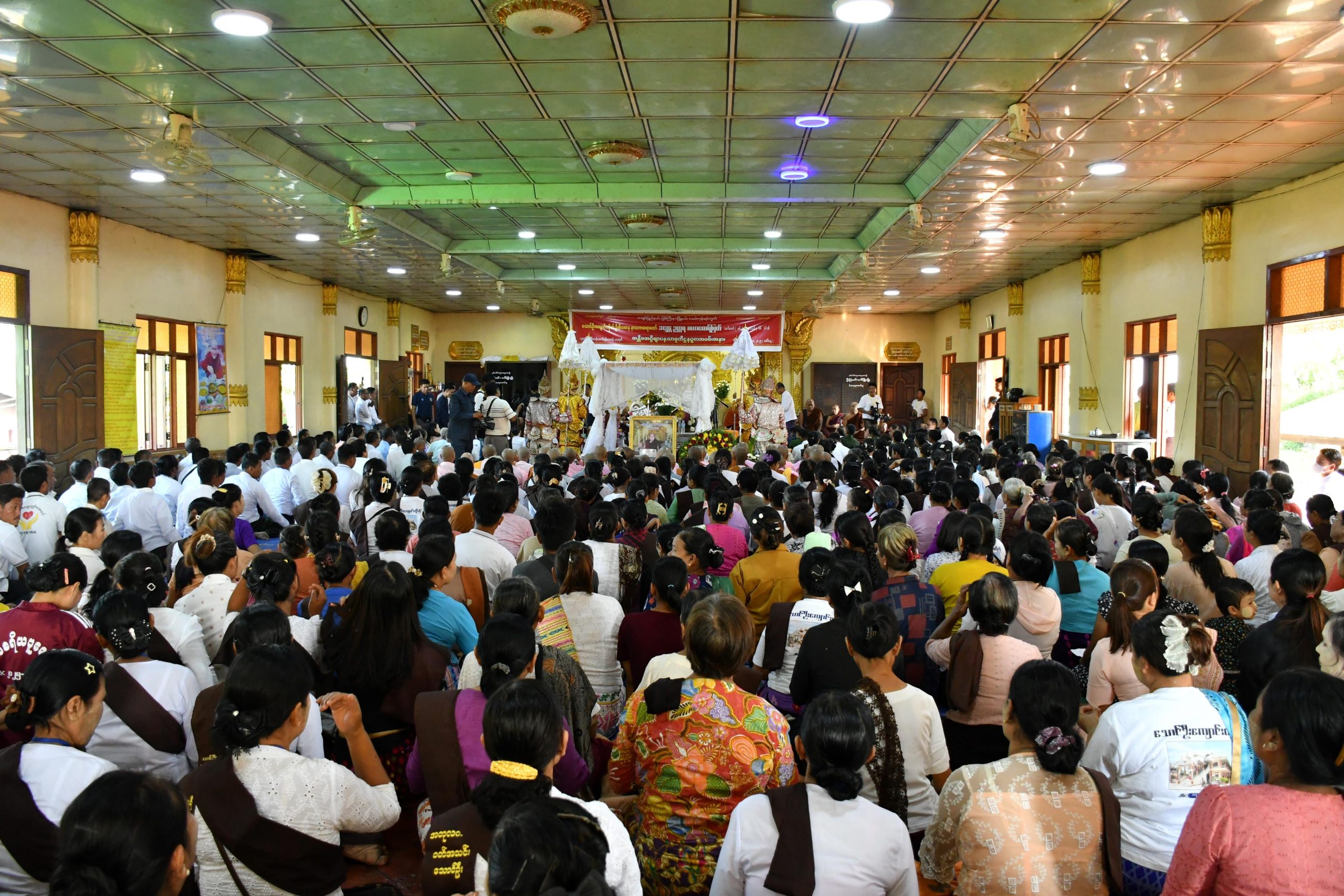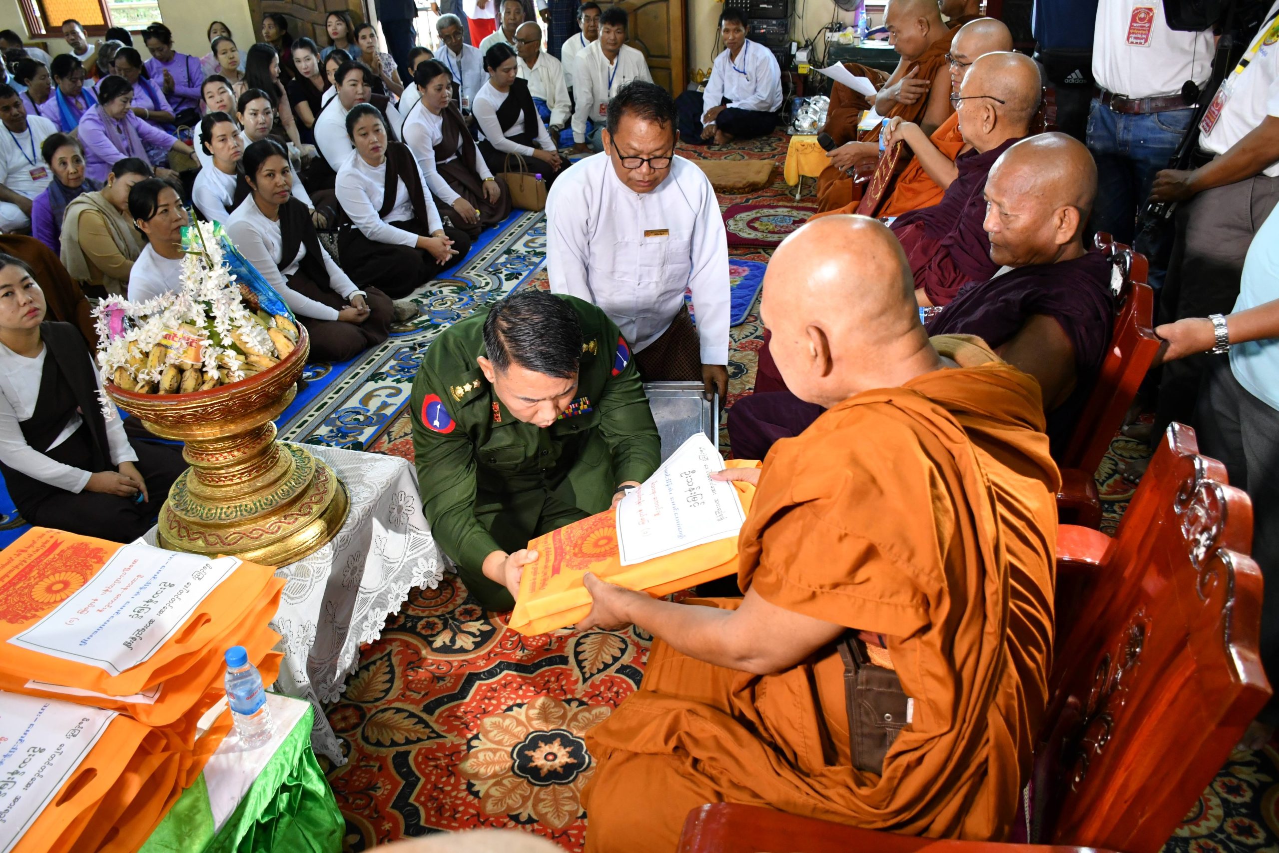 ဆက်လက်၍ တိုင်းမှူးနှင့်ဇနီး၊ ပြည်နယ်အစိုးရအဖွဲ့ဝင်ဝန်ကြီးများ၊ ပြည်နယ်ဥပဒေချုပ်၊ ပြည်နယ်အစိုးရအဖွဲ့အတွင်းရေးမှူးနှင့် တပည့်သာဝကများက ဆရာတော်များထံ လှူဖွယ်ပစ္စည်းများကို ဆက်ကပ်လှူဒါန်းခဲ့ကြပြီး သောင်ဦးကျောင်းတိုက်ဆရာတော်ကြီးအား အမျှပေးဝေခဲ့ကြကာ သံဃာတော်အရှင်မြတ်များက အနိစ္စာဝတသင်္ခါရာ အစဖြာသော ဂါထာတော်များဖြင့် မရဏနုဿတိ ကမ္မဋ္ဌာန်းစီးဖြန်းတော်မူခဲ့ကြသည်။