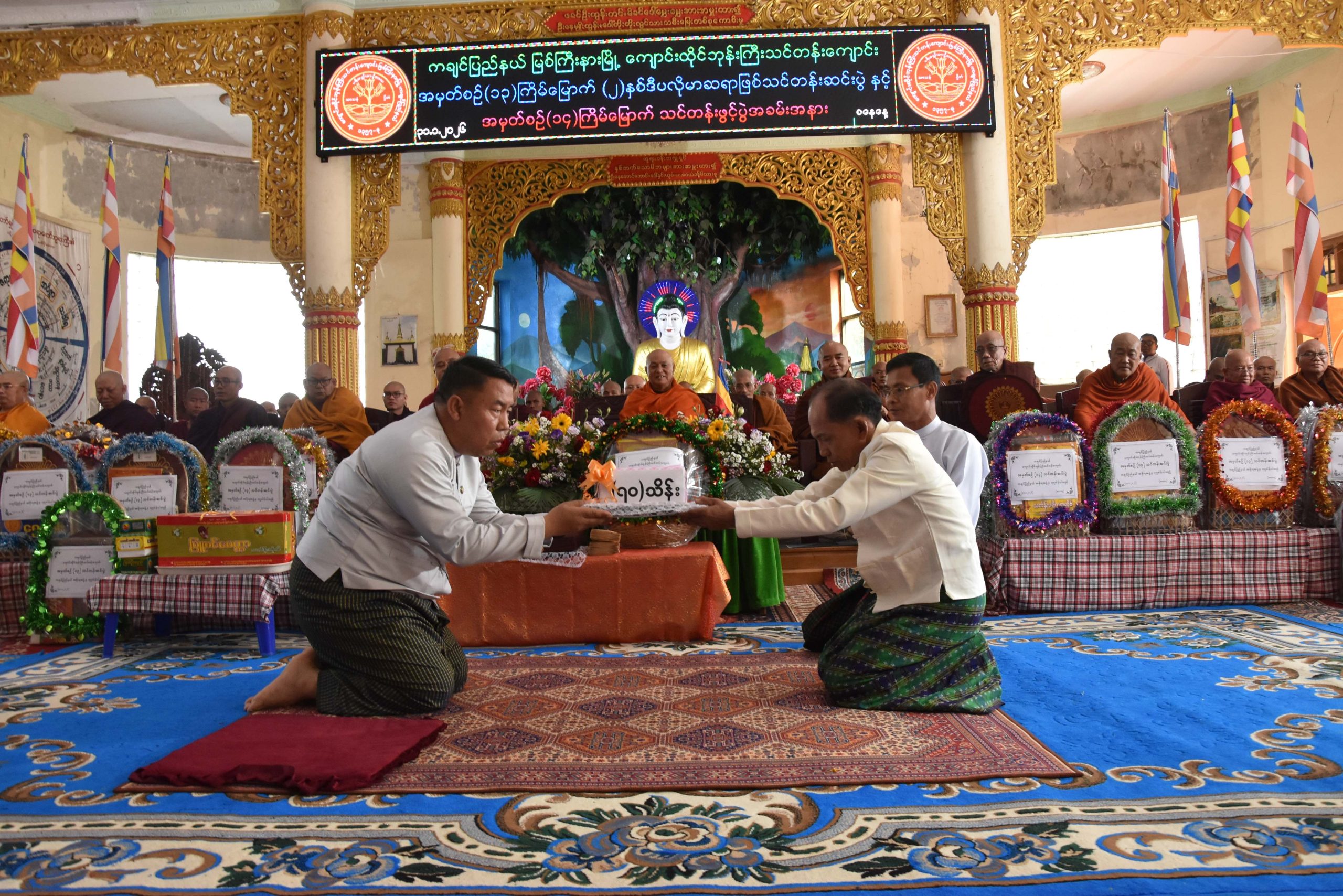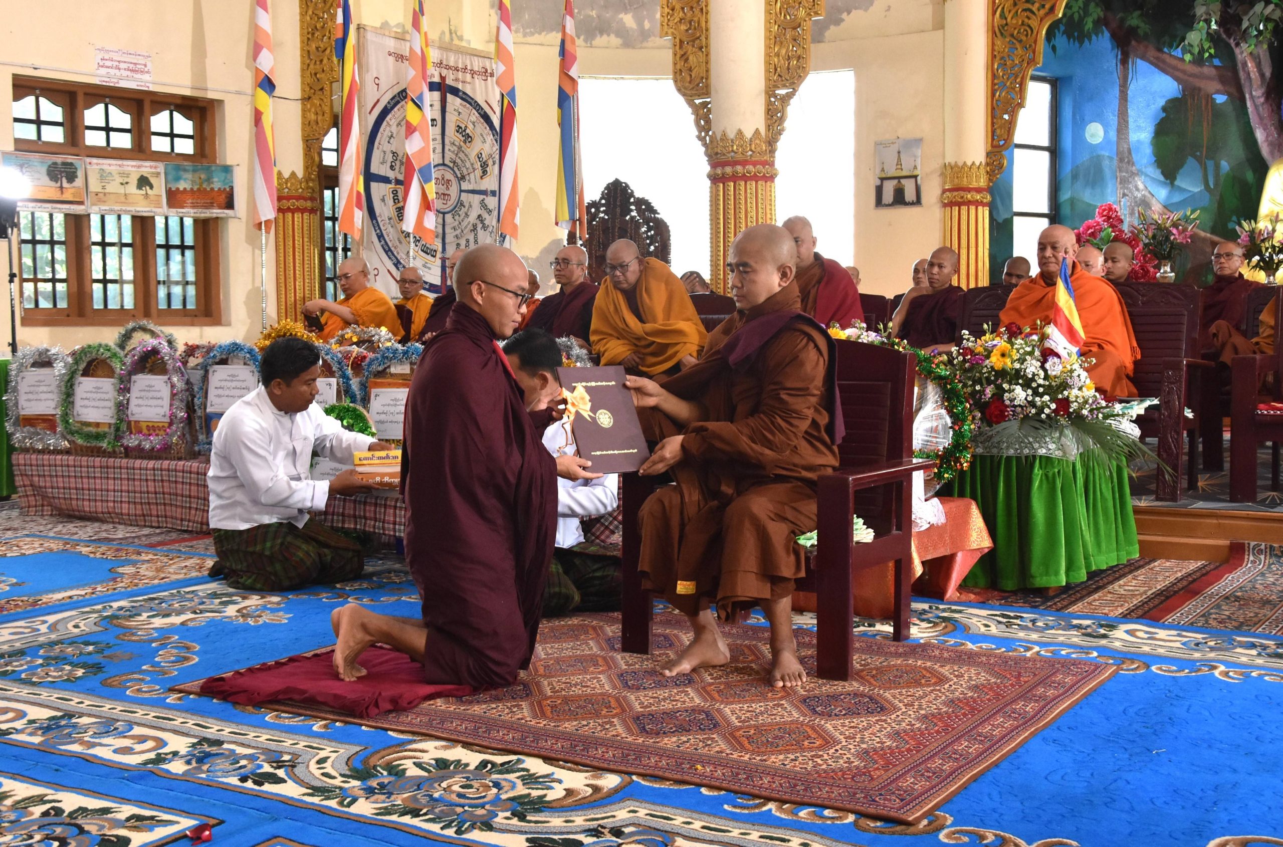 ထို့နောက် ပြည်နယ်ဝန်ကြီးများနှင့်တာဝန်ရှိသူများက သံဃာတော်များထံ လှူဖွယ်ပစ္စည်းများကို ဆက်ကပ်လှူဒါန်းခဲ့ကြပြီး ပြည်နယ်အစိုးရအဖွဲ့ဝင် လုံခြုံရေးနှင့်နယ်စပ်ရေးရာဝန်ကြီးက (၁၄) ကြိမ်မြောက်သင်တန်းအတွက် ငွေကျပ်သိန်း(၇၀)ကို လှူဒါန်းပေးခဲ့သည်။ ထို့နောက် ကျောင်းထိုင်သင်တန်းကျောင်း ကျောင်းအုပ်ဆရာတော် ဘဒ္ဒန္တ ဝါသဝက (၁၃) ကြိမ်မြောက် (၂) နှစ်ဒီပလိုမာ ဆရာဖြစ်သင်တန်းဆင်း သံဃာတော် (၁၂)ပါးတို့အား ဒီပလိုမာသင်တန်းဆင်းလက်မှတ်များ ချီးမြှင့်ပေးအပ်ခဲ့ပြီး သင်တန်းကျောင်းနှင့်ပတ်သက်၍ ရှင်းလင်းမိန့်ကြားကာ ကုသိုလ်ကောင်းမှုအစုစုတို့အတွက် ဆရာတော်ထံမှ အနုမောဒနာတရားနာကြားပြီး ရေစက်သွန်းချ အမျှပေးဝေခဲ့ကြသည်။