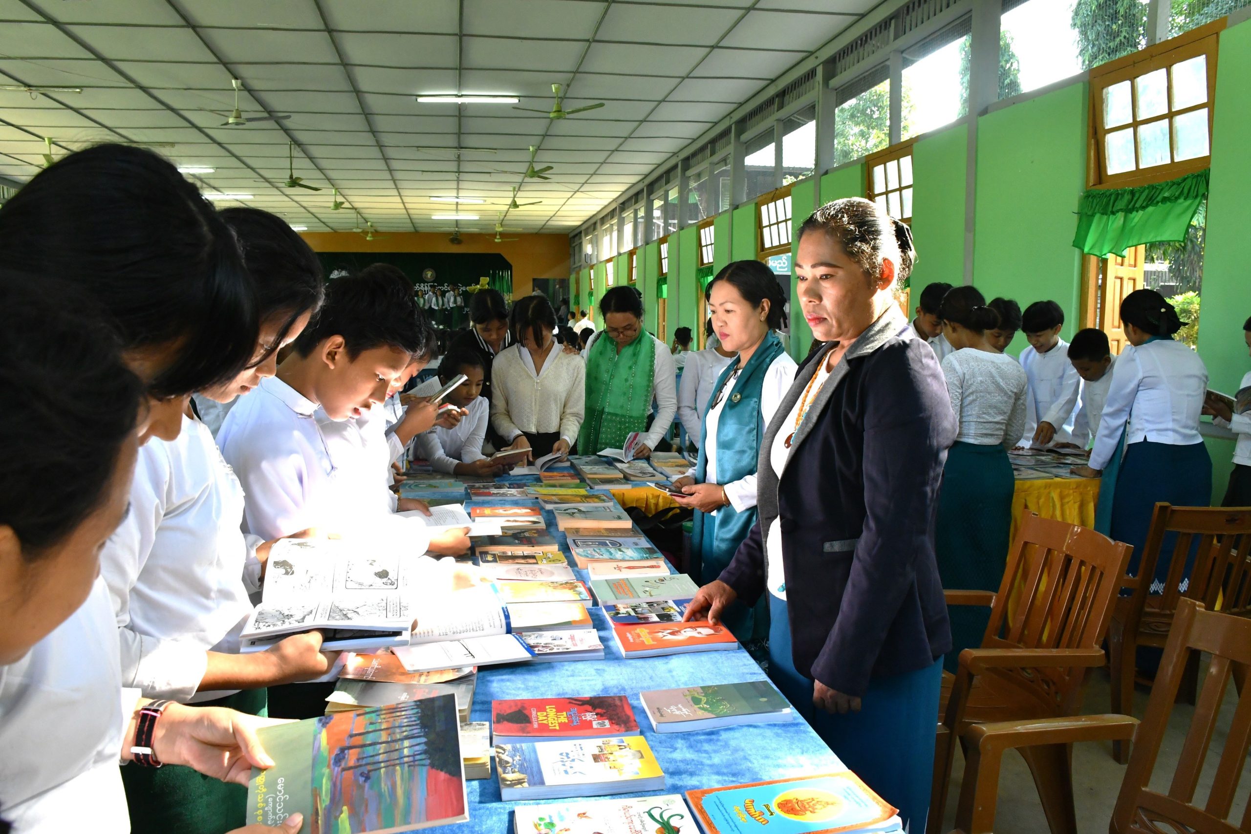 ယင်းနောက် ကျောင်းသား/ ကျောင်းသူလေးများက ပညာဘဏ်တိုက်စာကြည့်တိုက် တေးသီချင်းဖြင့် သီဆိုဖျော်ဖြေခဲ့ကြပြီး ခန်းမအတွင်း ပြန်ကြားရေးနှင့်ပြည်သူ့ဆက်ဆံရေးဦးစီးဌာနက ဖွင့်လှစ်ပြသထားသည့် သုတ/ ရသစာအုပ်စာစောင်ပြခန်း၊ လှပသာယာပြည်မြန်မာ ဓာတ်ပုံပြခန်းများ ဖွင့်လှစ်ပြသထားရှိမှုများကိုလည်းကောင်း၊ ဆေးရောင်ခြယ်ပြိုင်ပွဲ၊ စကားပုံဆက်နှင့် အရုပ်ဆက်ပြိုင်ပွဲများပြုလုပ်ကျင်းပပေးနေမှုများကိုလည်းကောင်း ကျောင်းသား/ ကျောင်းသူများနှင့်အတူ စိတ်ဝင်တစားလည့်လည်ကြည့်ရှု အားပေးခဲ့ကြသည်။