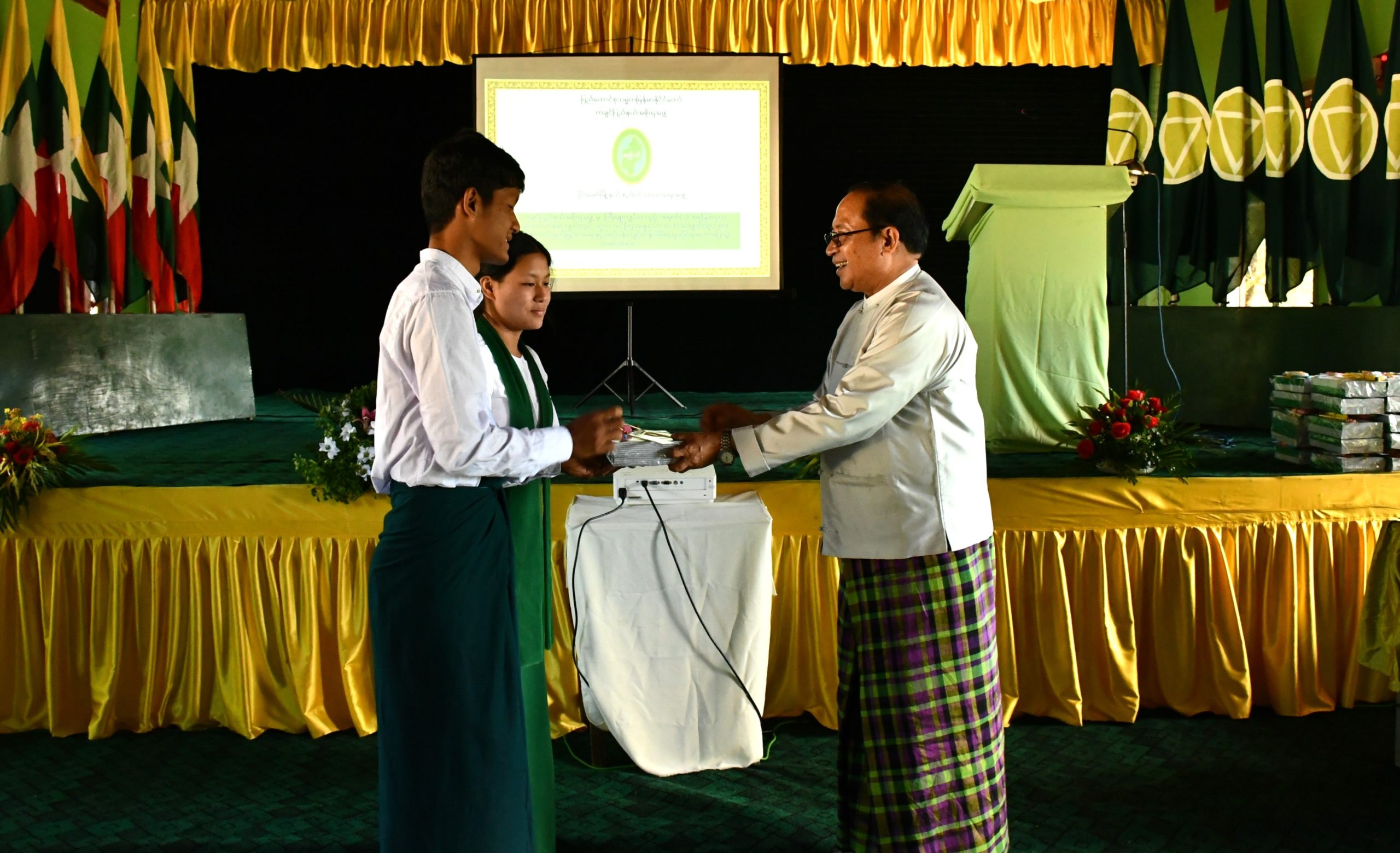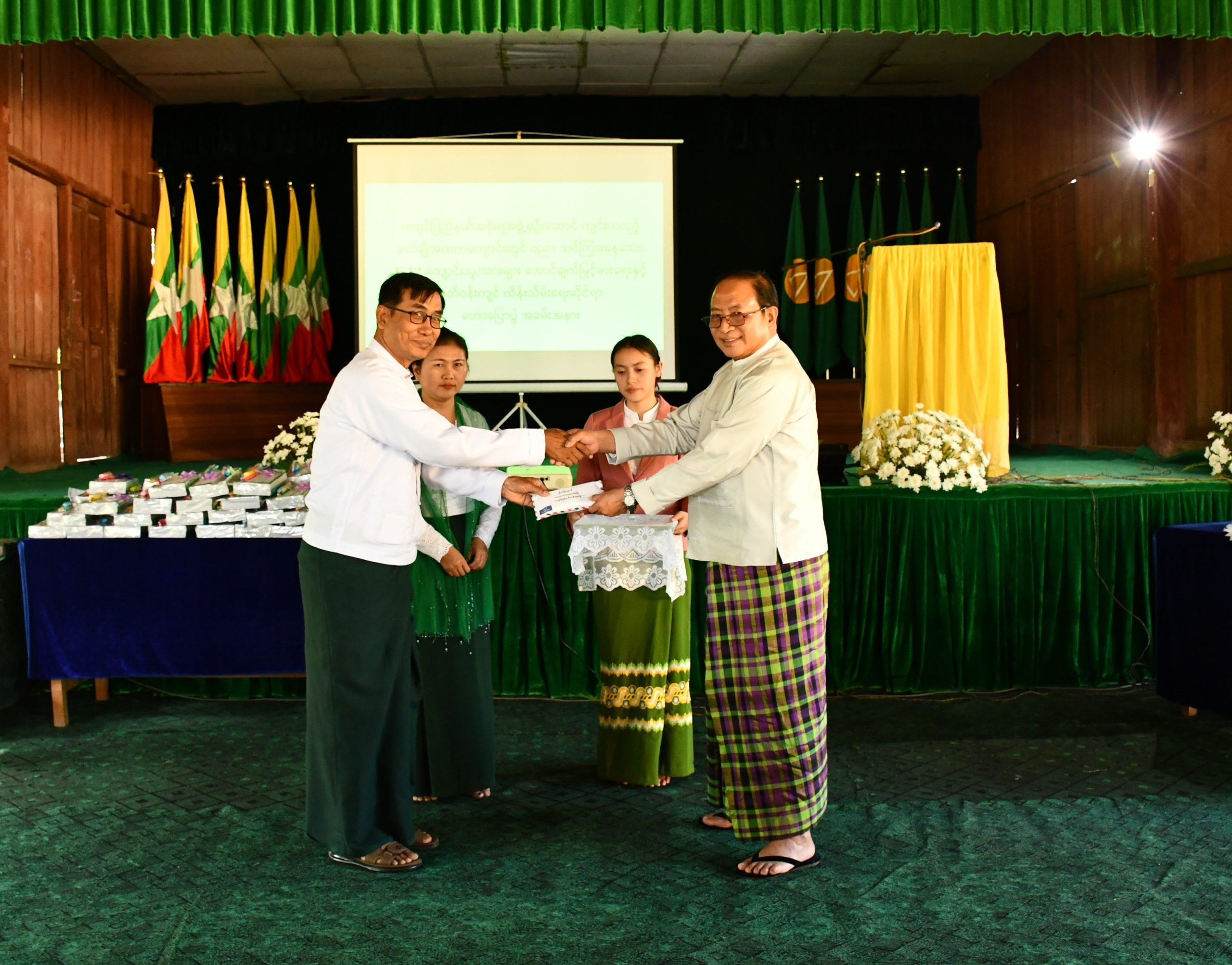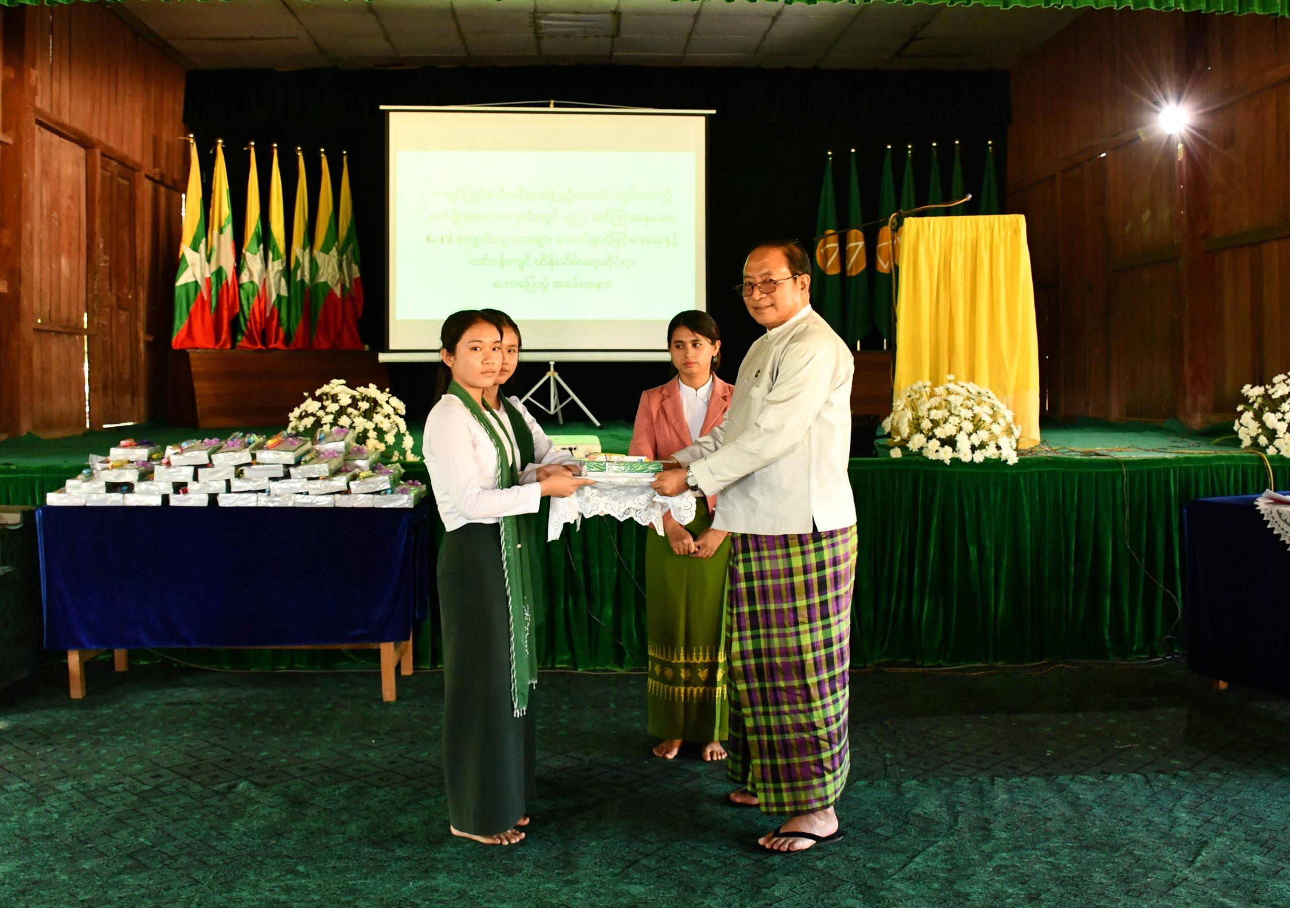 ဆက်လက်၍ ပြည်နယ်ဝန်ကြီးက အဆိုပါကျောင်းမှ Grade-12 ကျောင်းသား/ကျောင်းသူများအား ကျောင်းသုံး ဗလာစာအုပ်၊ ခဲတံ၊ ဘောပင်စသည့်စာရေးကိရိယာများနှင့် ဆရာ/ဆရာမများအတွက် ထောက်ပံ့ချီးမြှင့်ငွေကျပ်သိန်း(၂၀) ထောက်ပံ့ပေးအပ်ခဲ့သည်။