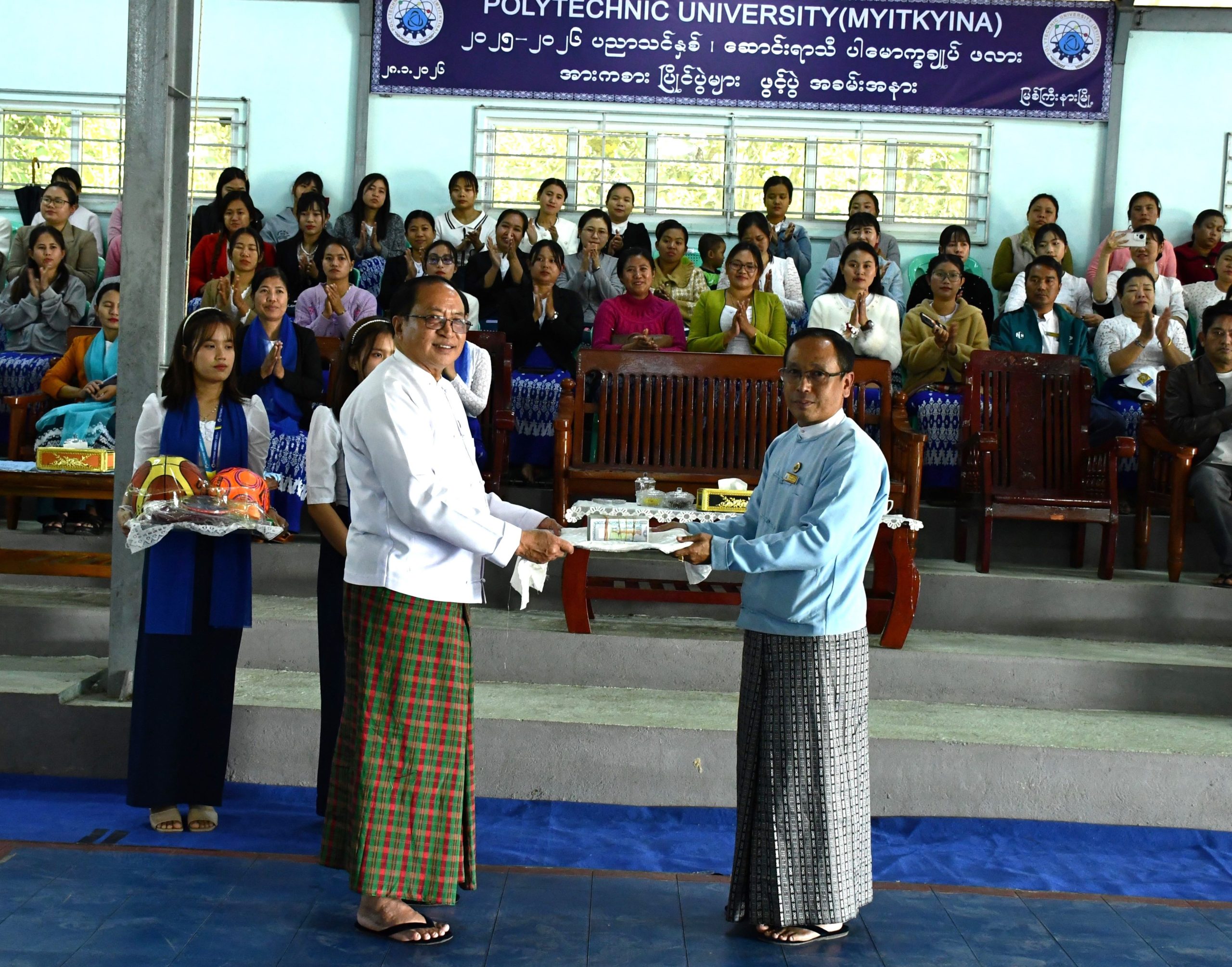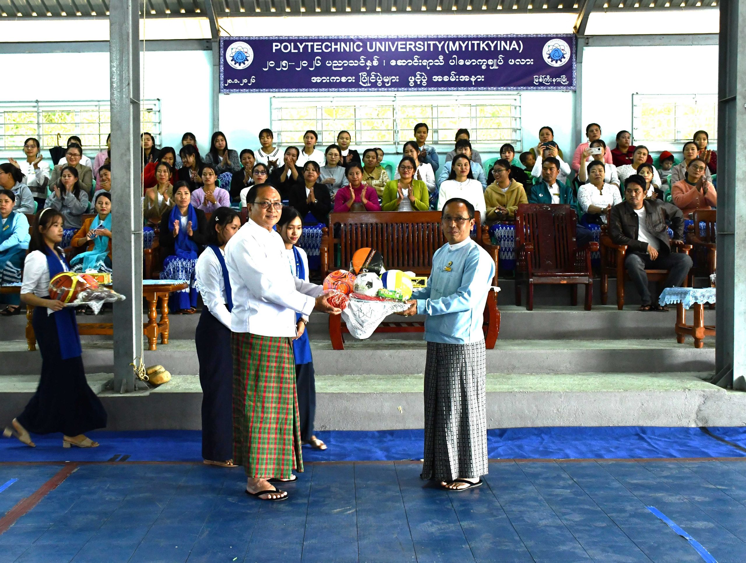 ထို့နောက် Polytechnic University (မြစ်ကြီးနား)၏ တာဝန်ခံပါမောက္ခချုပ် ဒေါက်တာမင်းမင်းဦးက ဆောင်းရာသီ အားကစားပြိုင်ပွဲများ ပြုလုပ်ကျင်းပပေးရသည့် ရည်ရွယ်ချက်များနှင့် အားကစားနည်းအလိုက် ကျင်းပဆောင်ရွက်သွားမည့် အစီအစဉ်များအား ရှင်းလင်းတင်ပြပြီး ပြည်နယ်ဝန်ကြီးက အားကစားပြိုင်ပွဲများအတွက် အားကစားအထောက်အကူပြုပစ္စည်းများနှင့် ထောက်ပံ့ငွေကျပ် (၅၄၉၀၀၀၀)ကို တာဝန်ခံပါမောက္ခချုပ်ထံ ပေးအပ်သည်။