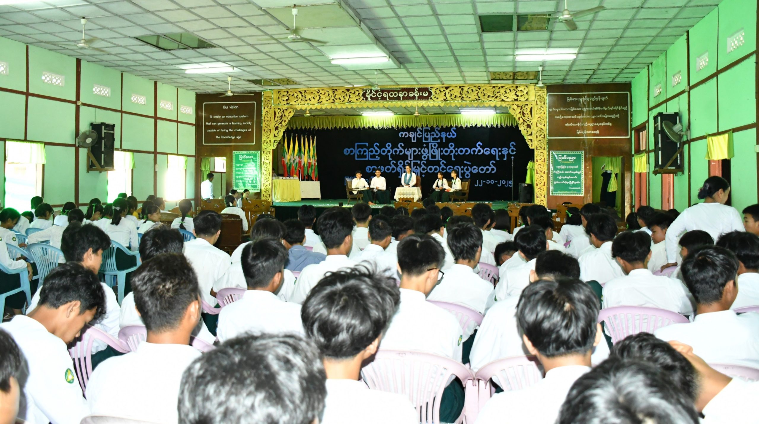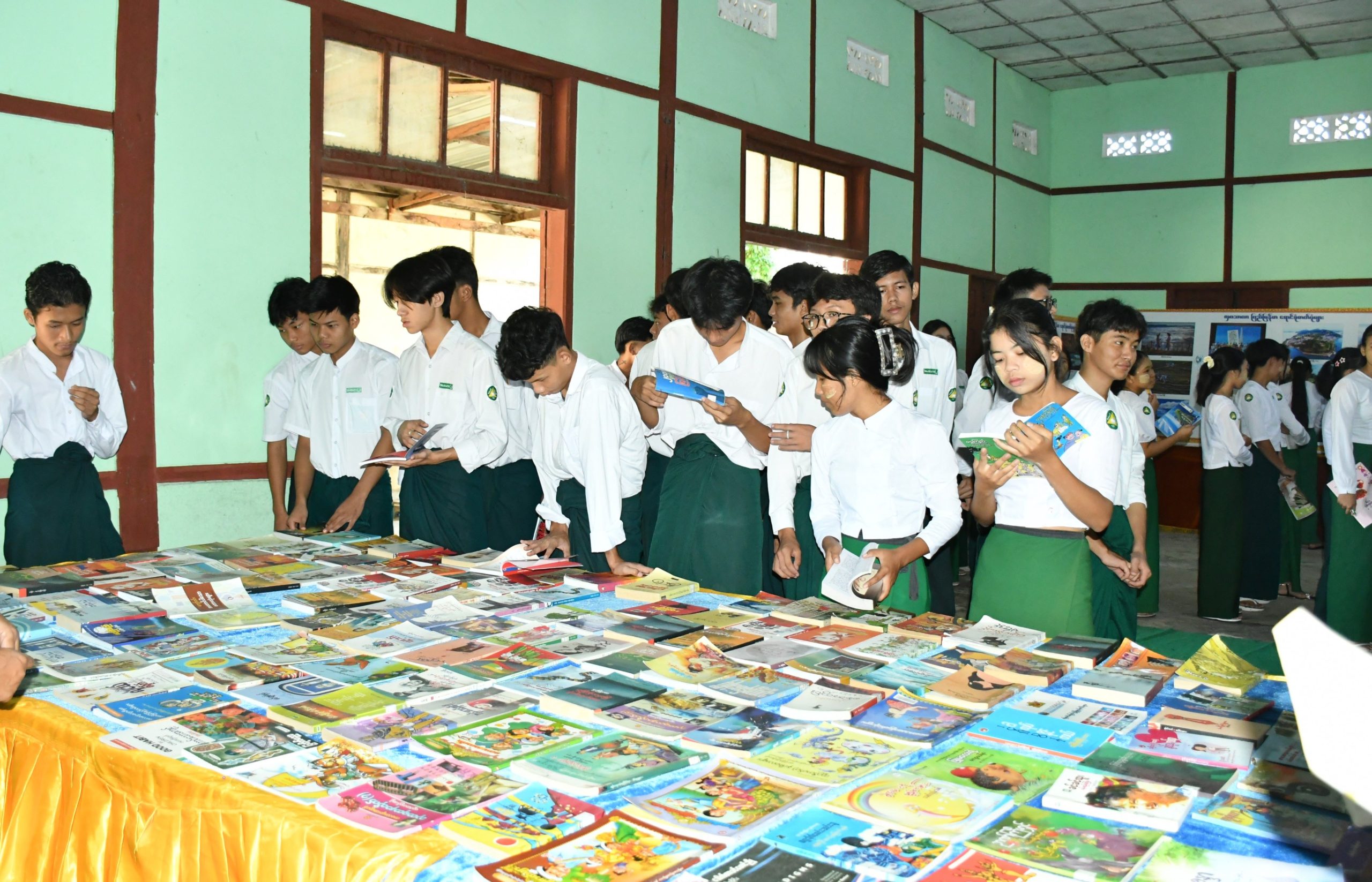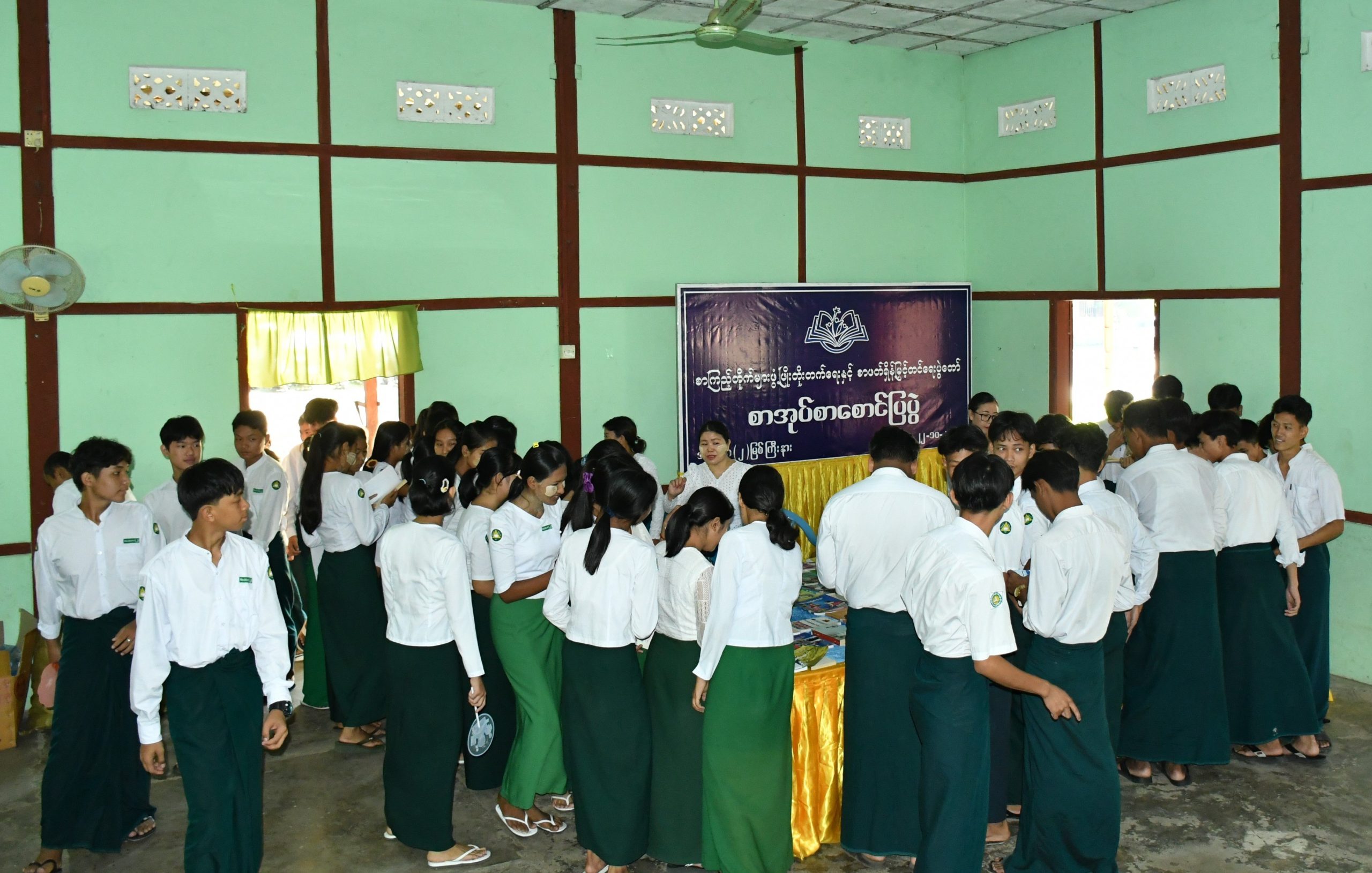 ယင်းနောက် ကျောင်းသား/ ကျောင်းသူလေးများက ပညာဘဏ်တိုက် စာကြည့်တိုက် တေးသီချင်းဖြင့် သီဆိုဖျော်ဖြေခဲ့ကြပြီး ကျောင်းခန်းမအတွင်း ပြန်ကြားရေးနှင့်ပြည်သူ့ဆက်ဆံရေးဦးစီးဌာနက ဖွင့်လှစ်ပြသထားသည့် လှပသာယာပြည်မြန်မာ ဓာတ်ပုံပြခန်းနှင့် သုတ/ ရသစာအုပ်စာစောင်ပြခန်းများကို တက်ရောက်လာသူများနှင့် ကျောင်းသား/ကျောင်းသူလေးများက စိတ်ဝင်စားစွာ လေ့လာကြည့်ရှုခဲ့ကြသည်။