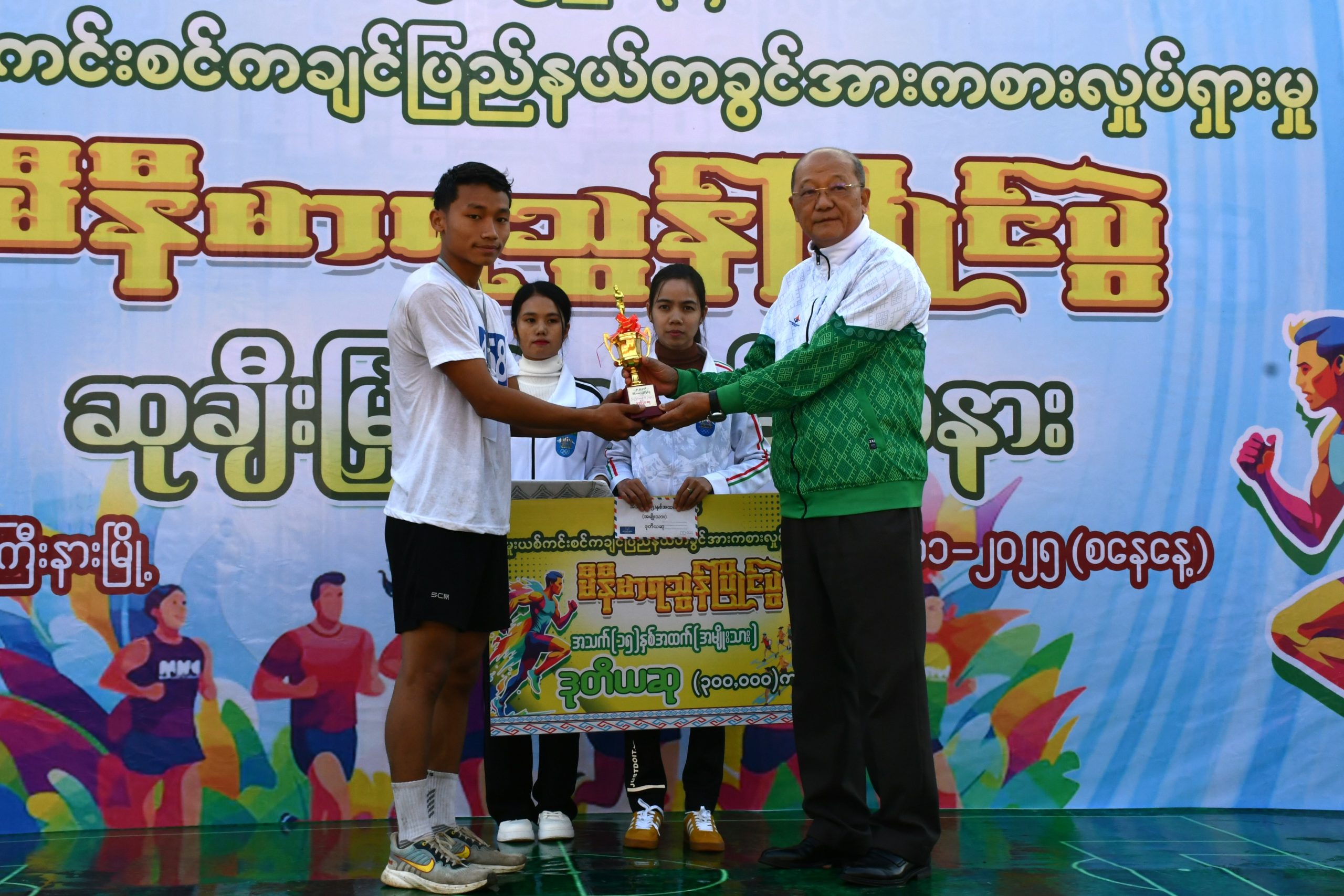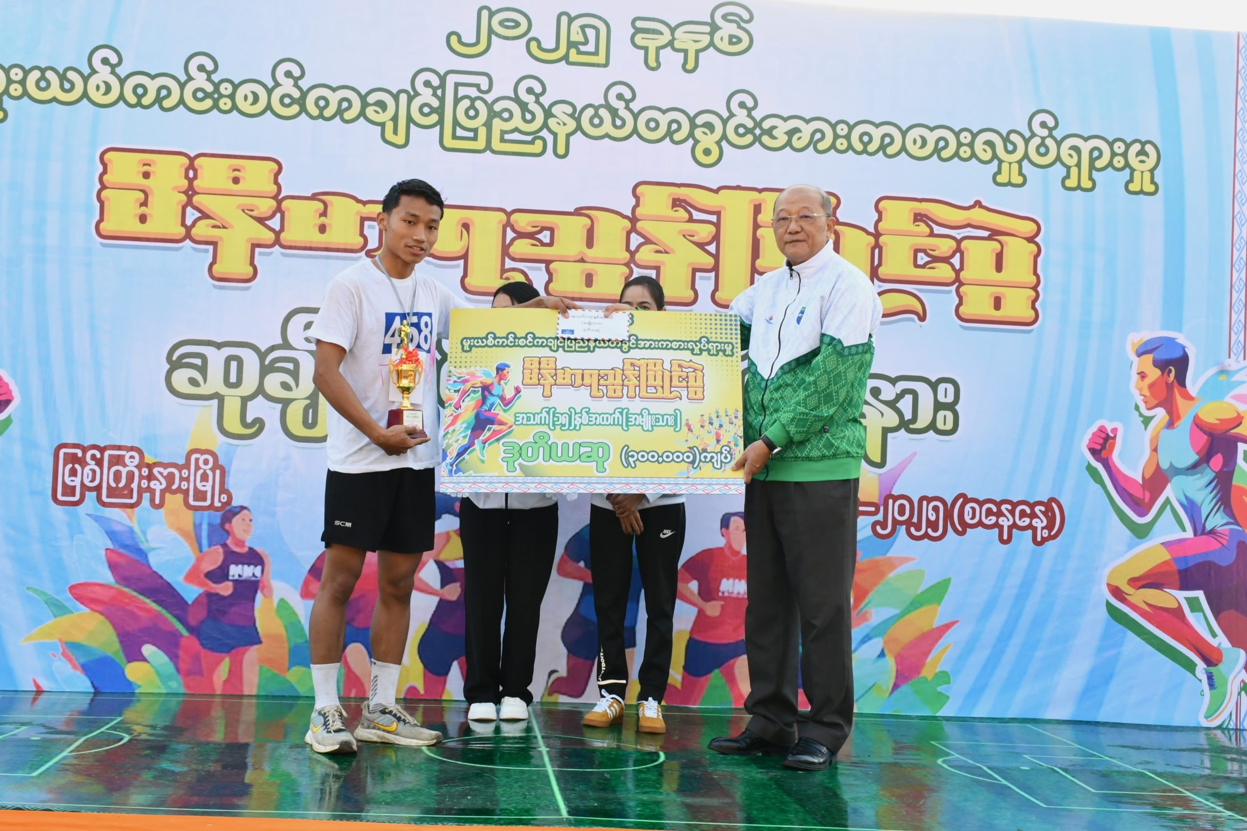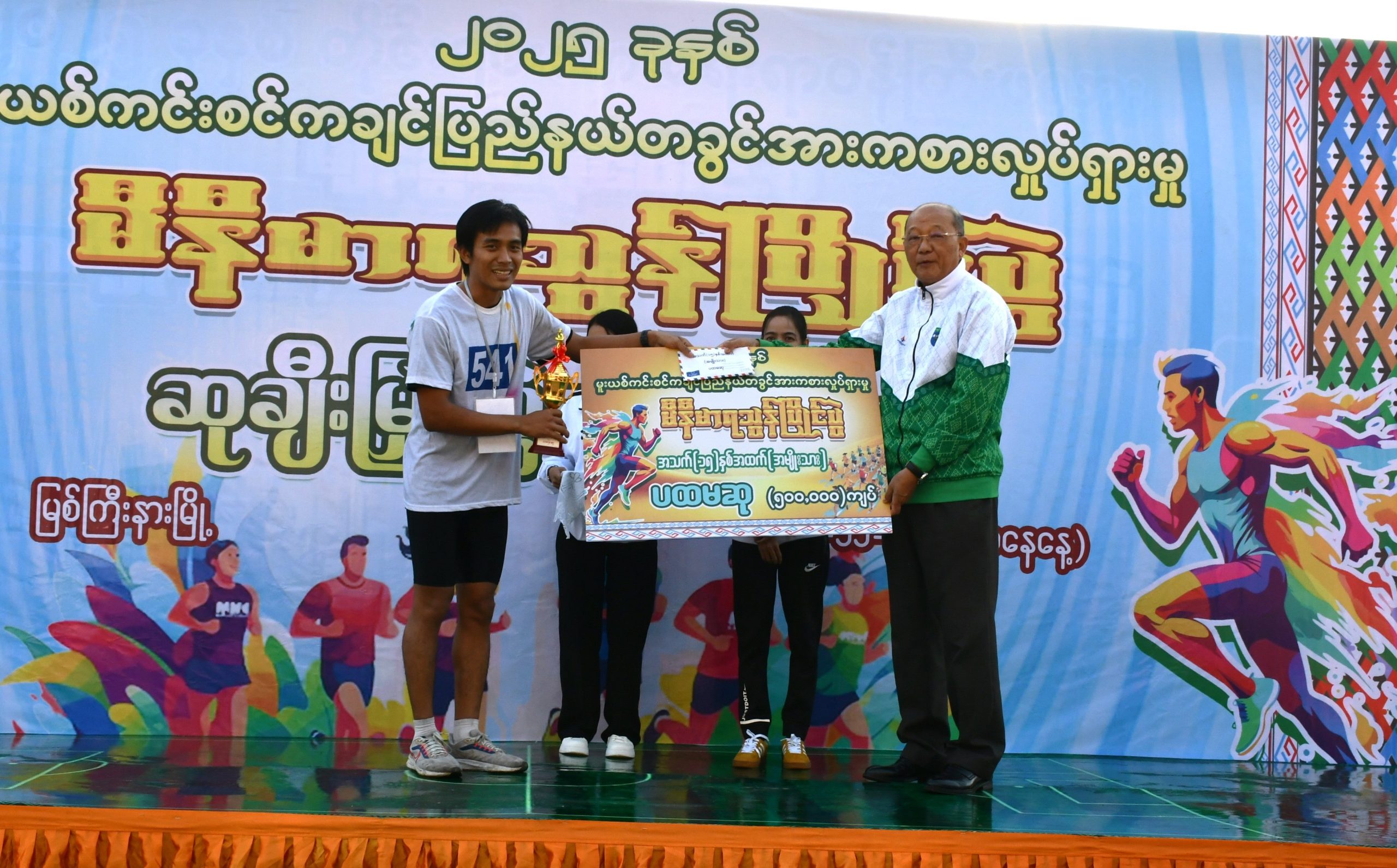 ယင်းနောက် ဆုချီးမြှင့်ပွဲအခမ်းအနားကို ဆက်လက်ကျင်းပရာ မြန်မာနိုင်ငံအိုလံပစ်ကော်မတီ ဥက္ကဋ္ဌ၊ ပြည်ထောင်စုဝန်ကြီးက အသက်(၁၅)နှစ်အထက် အမျိုးသားပြိုင်ပွဲဝင် ပထမ၊ ဒုတိယ၊ တတိယ ဆုရရှိသူများနှင့် အသက်(၅၇)နှစ်ရှိ အသက်အကြီးဆုံးပြိုင်ပွဲဝင် ဆုရရှိသည့် အမျိုးသမီးတစ်ဦးအားလည်းကောင်း၊ ပြည်နယ်ဝန်ကြီးချုပ်က အသက်(၁၅)နှစ်အထက်အမျိုးသမီးပြိုင်ပွဲဝင် ပထမ၊ ဒုတိယ၊ တတိယဆုရရှိသူများနှင့် အသက်(၇)နှစ်ဖြင့် ပန်းဝင်လာသည့် အသက်ငယ်ဆုံးပြိုင်ပွဲဝင် ဆုရကလေး (၃)ဦးတို့အားလည်းကောင်း၊ ပြည်နယ်တရားလွှတ်တော်တရားသူကြီးချုပ်၊ ပြည်နယ်အစိုးရအဖွဲ့ဝင် များနှင့် တာဝန်ရှိသူများက အသက်(၁၅)နှစ်အထက်နှင့်အောက် ပြိုင်ပွဲဝင်များအနက် အဆင့် (၂၀) အထိ ပန်းဝင်ခဲ့ကြသည့် ပြိုင်ပွဲဝင်များအားလည်းကောင်း ဂုဏ်ပြုဆုတံဆိပ်နှင့် ဂုဏ်ပြုချီးမြှင့်ငွေများကို အသီးသီးပေးအပ်ချီးမြှင့်ခဲ့ကြကြောင်း သိရသည်။