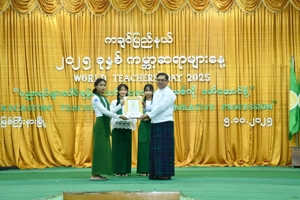 ကချင်ပြည်နယ်ဝန်ကြီးချုပ်ဦးခက်ထိန်နန် ၂၀၂၅ခုနှစ်၊ ကမ္ဘာ့ ဆရာများနေ့ အထိမ်းအမှတ်အခမ်းအနားတက်ရောက်၍ အငြိမ်းစား ဆရာကြီး/ ဆရာမကြီးများအား ဂါရဝပြု လက်ဆောင်များ ပေးအပ်လှူဒါန်း